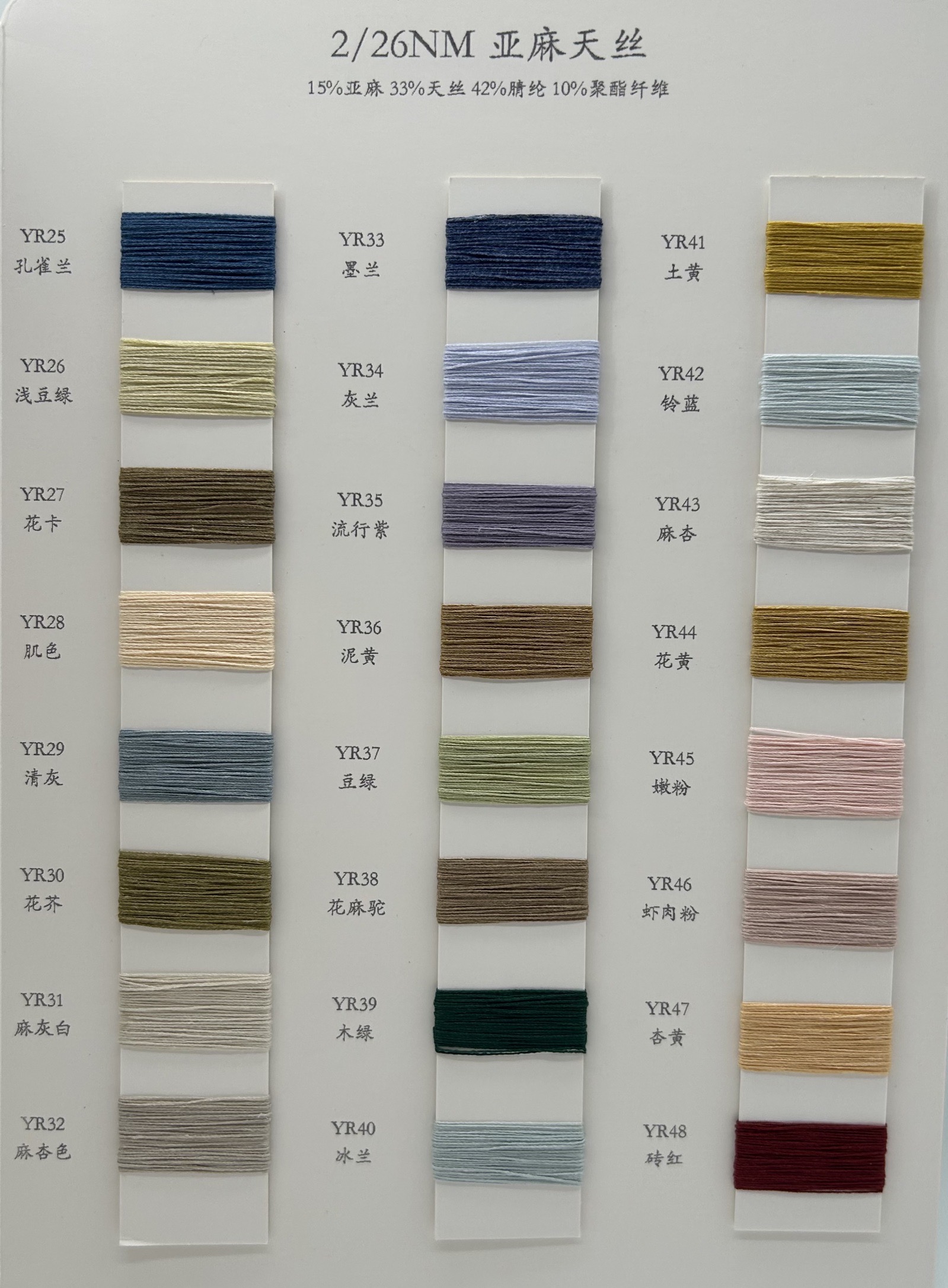 产品介绍: 欢迎体验我们最新推出的亚麻天丝纱线,一款专为春夏秋冬季节设计的高品质纱线。这款纱线融合了天然与科技的精华,由15%亚麻、33%天丝、42%腈纶和10%聚酯纤维精制而成,为您带来无与伦比的穿着体验。