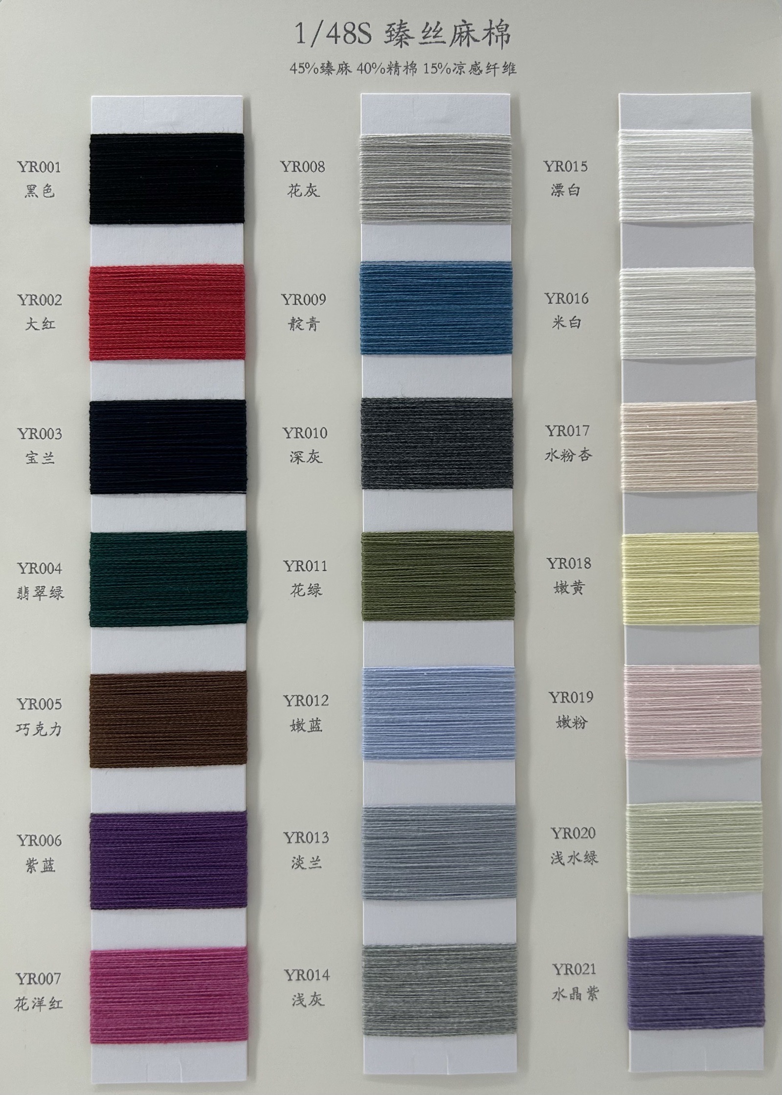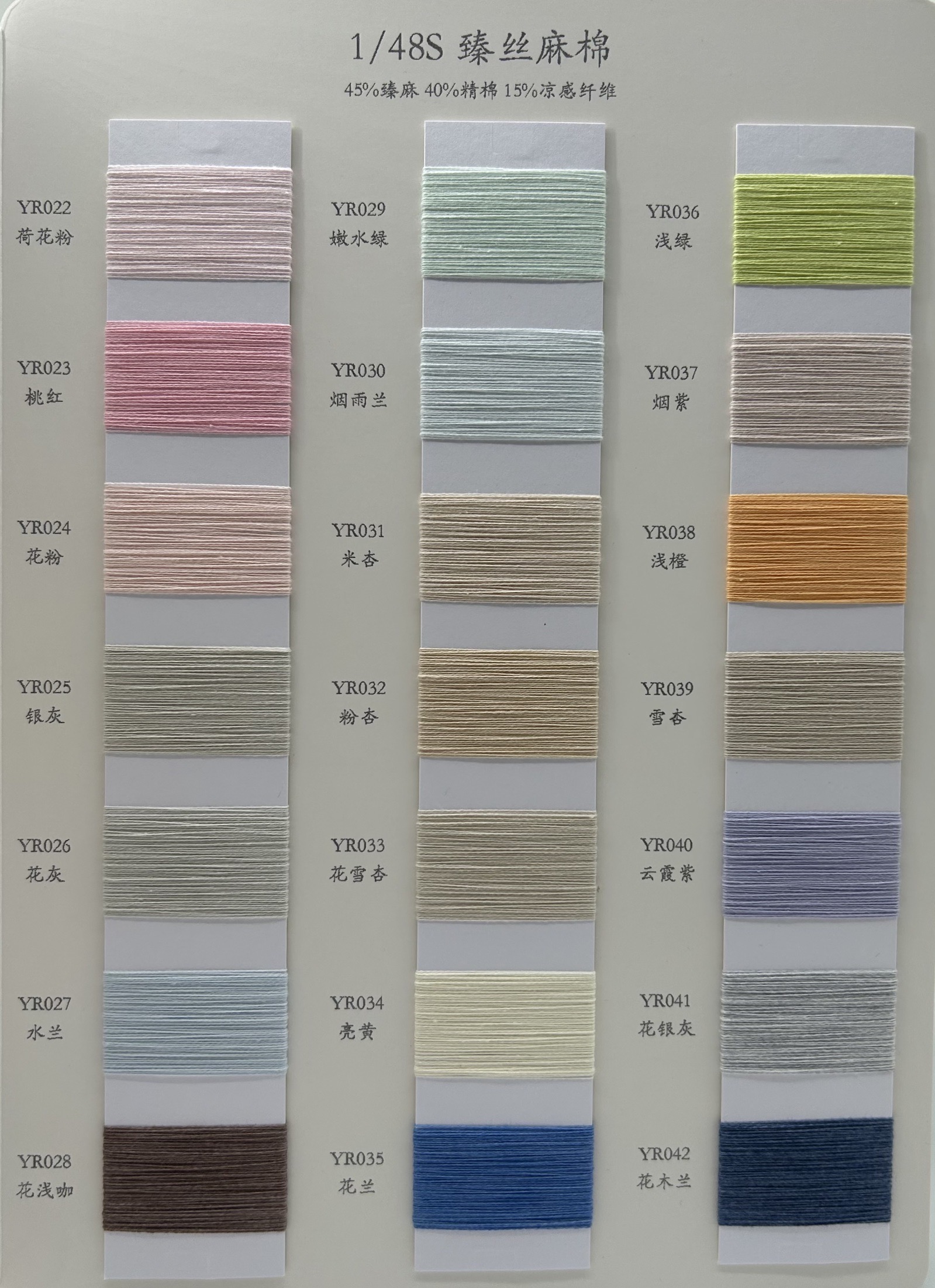 **细腻的1/48S支数** 臻丝麻棉采用1/48S的细支数,使得纱线更加细腻,易于编织出精致的图案与纹理。无论是轻薄的夏装,还是优雅的春日外套,臻丝麻棉都能轻松驾驭,展现出您独特的时尚品味。