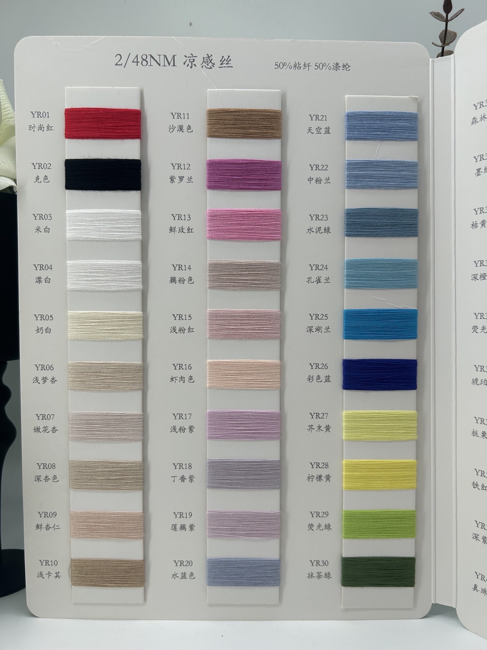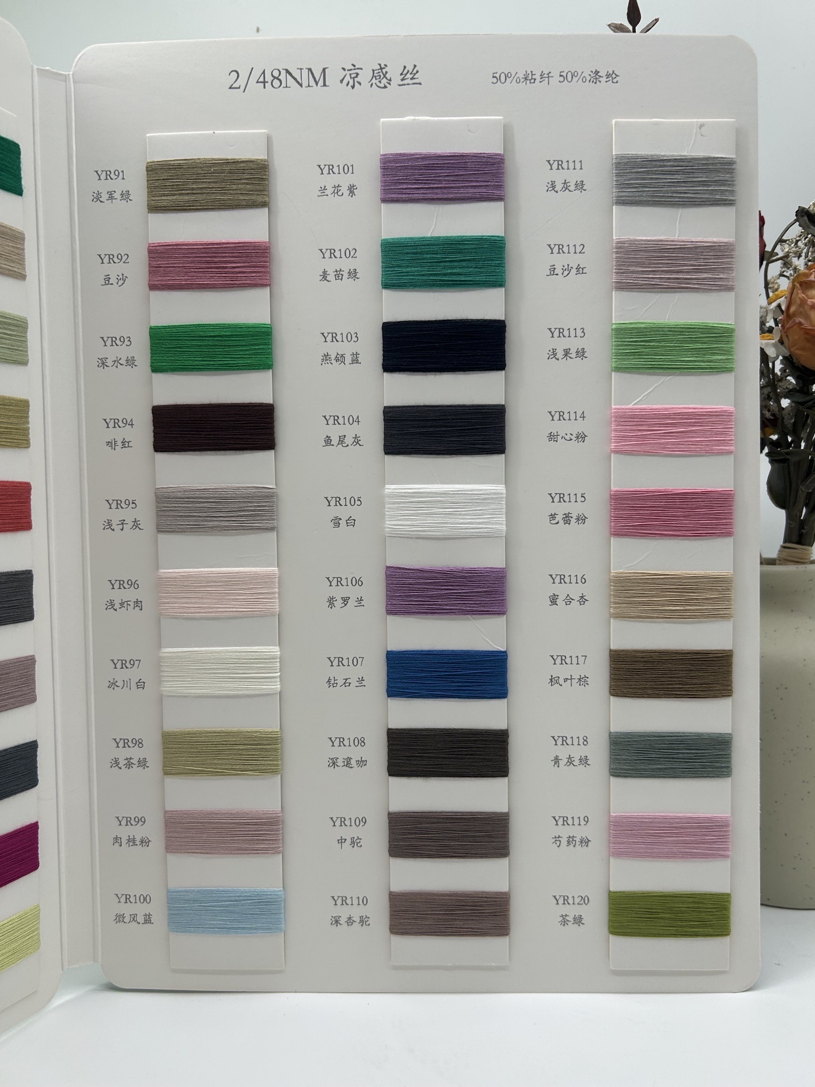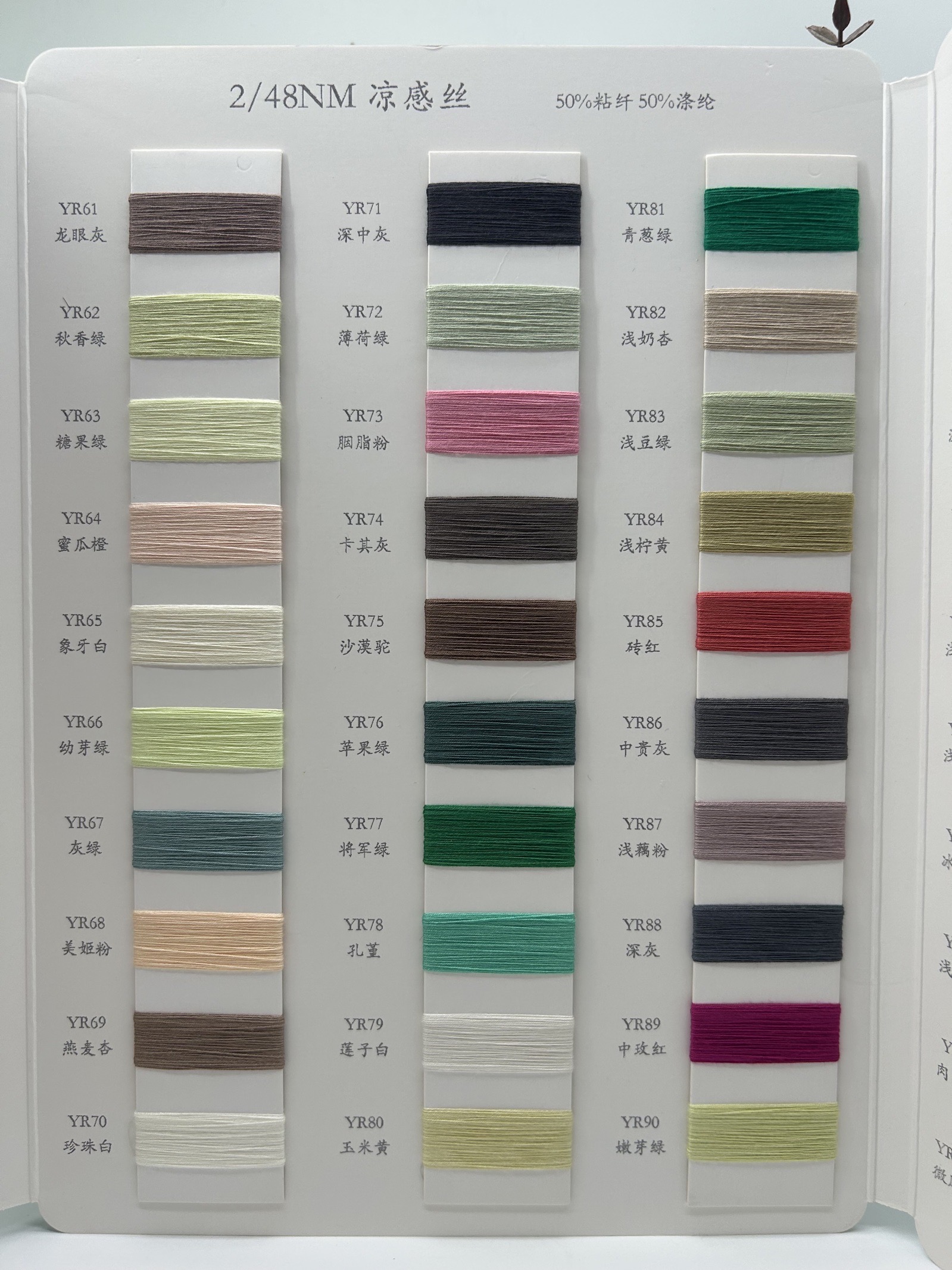 **产品介绍:** 在这个春夏季,为您带来一款独特的纱线——凉感丝。这款纱线采用50%粘纤与50%涤纶的完美结合,支数为2/48NM,既保证了舒适的手感,又具有良好的透气性和耐用性。