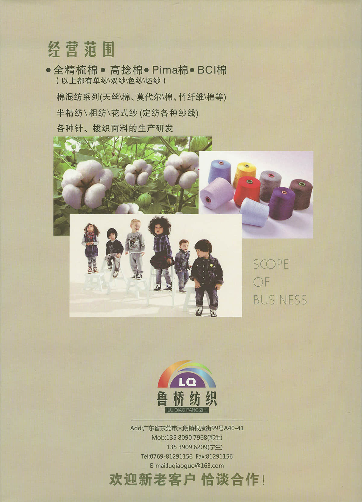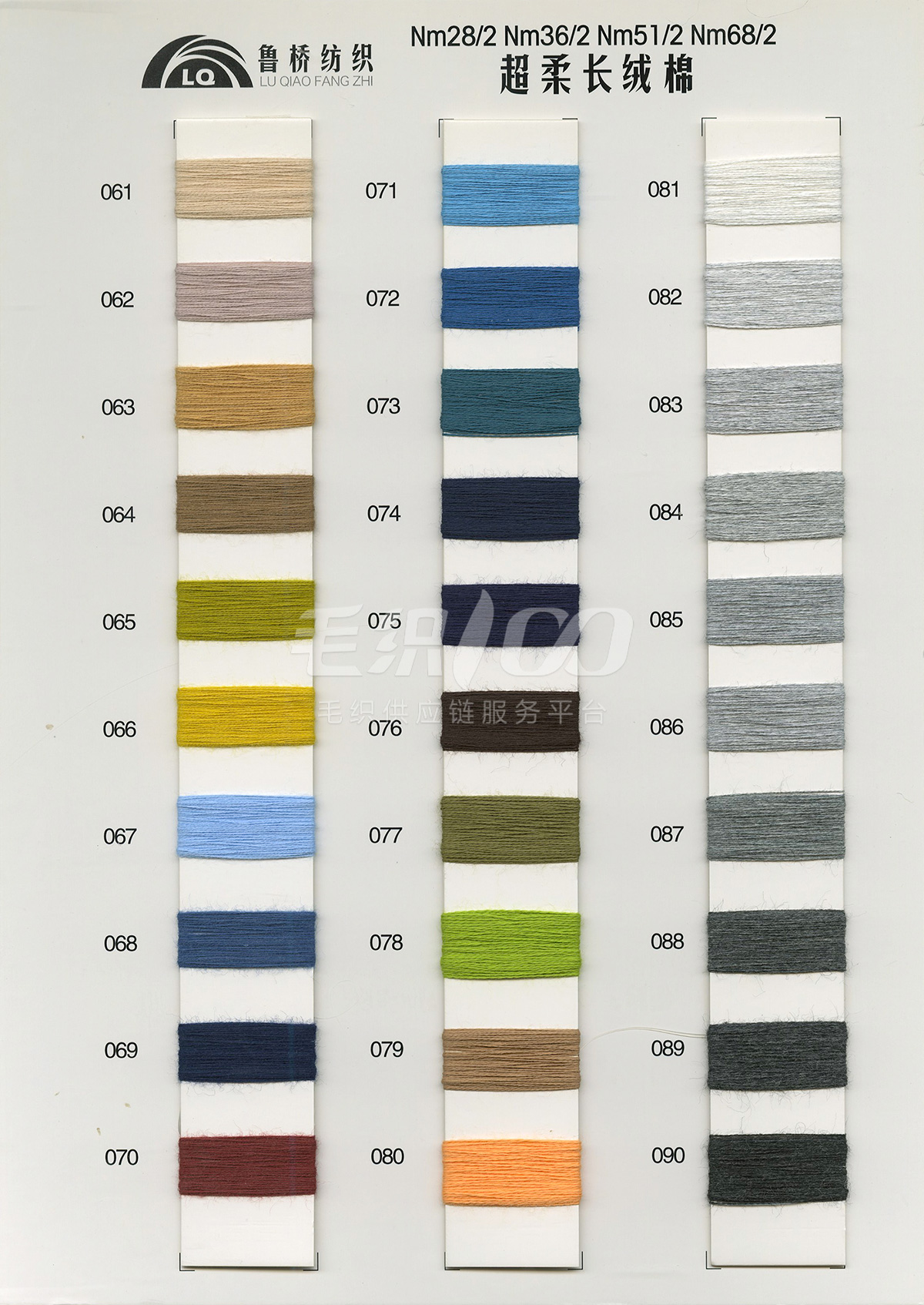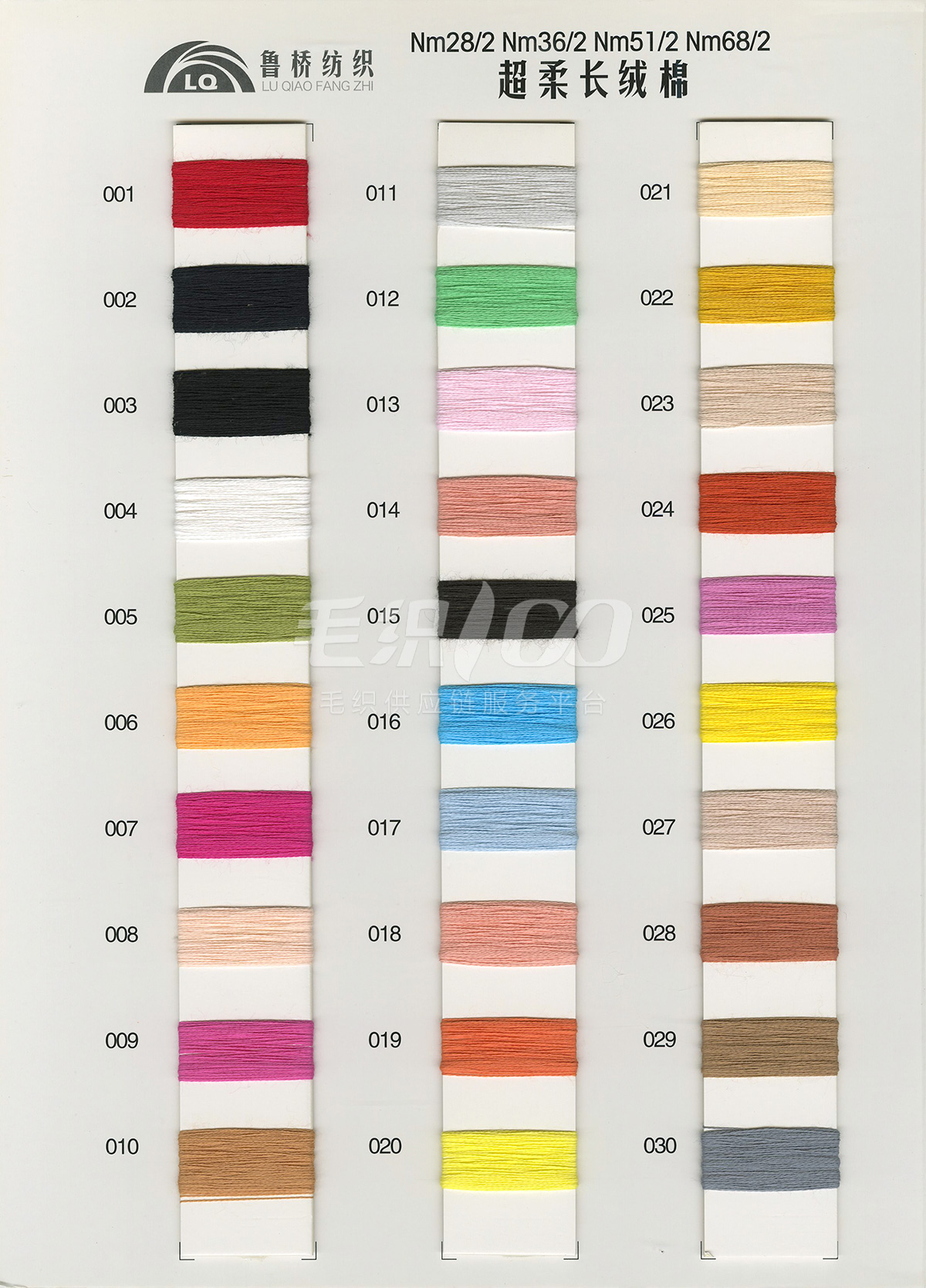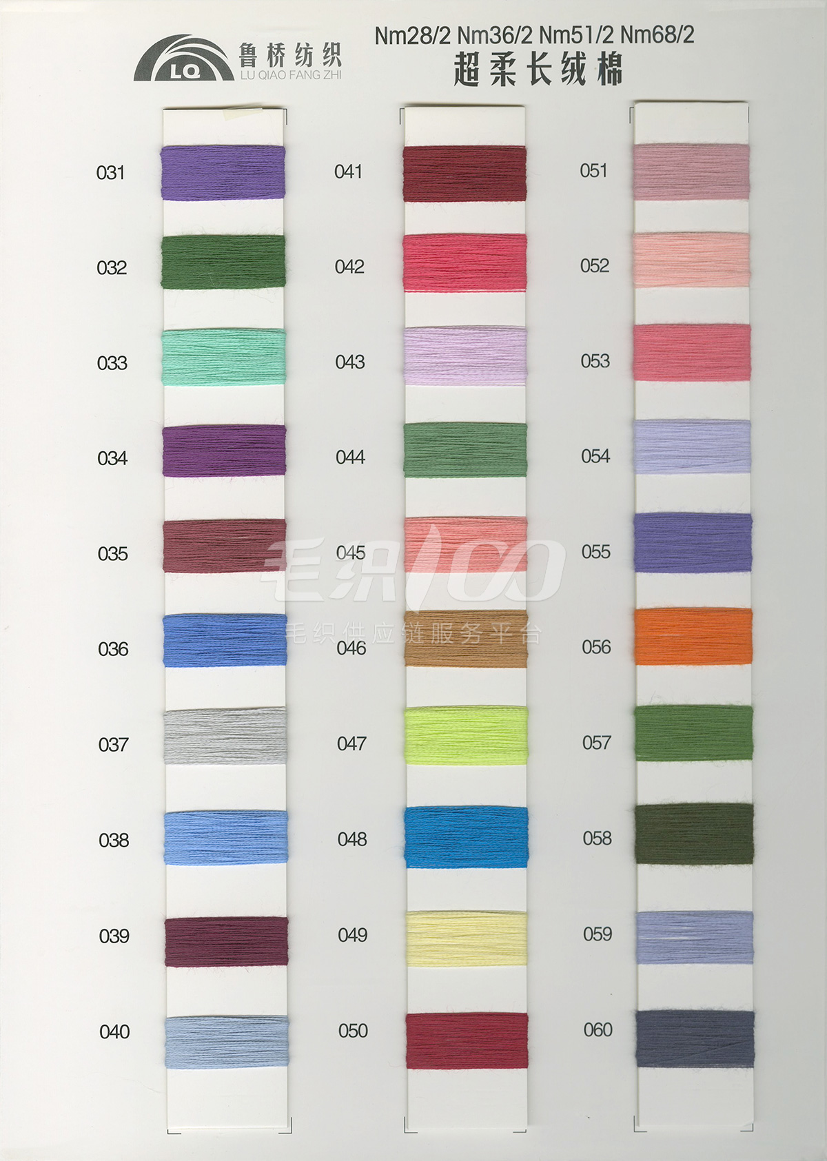 32s/2& 40s/2& 60s/2全精梳棉高捻棉色纱;32s/2&40s/2长绒棉(PIMA);立体棉 2/36&2/51&2/68超柔长绒棉; NM2/28&2/32&2/48 棉羊绒 ; NM2/28特级仿羊绒澳毛纱; 32s/2兰精A100天丝; 32s/2兰精莫代尔/棉;