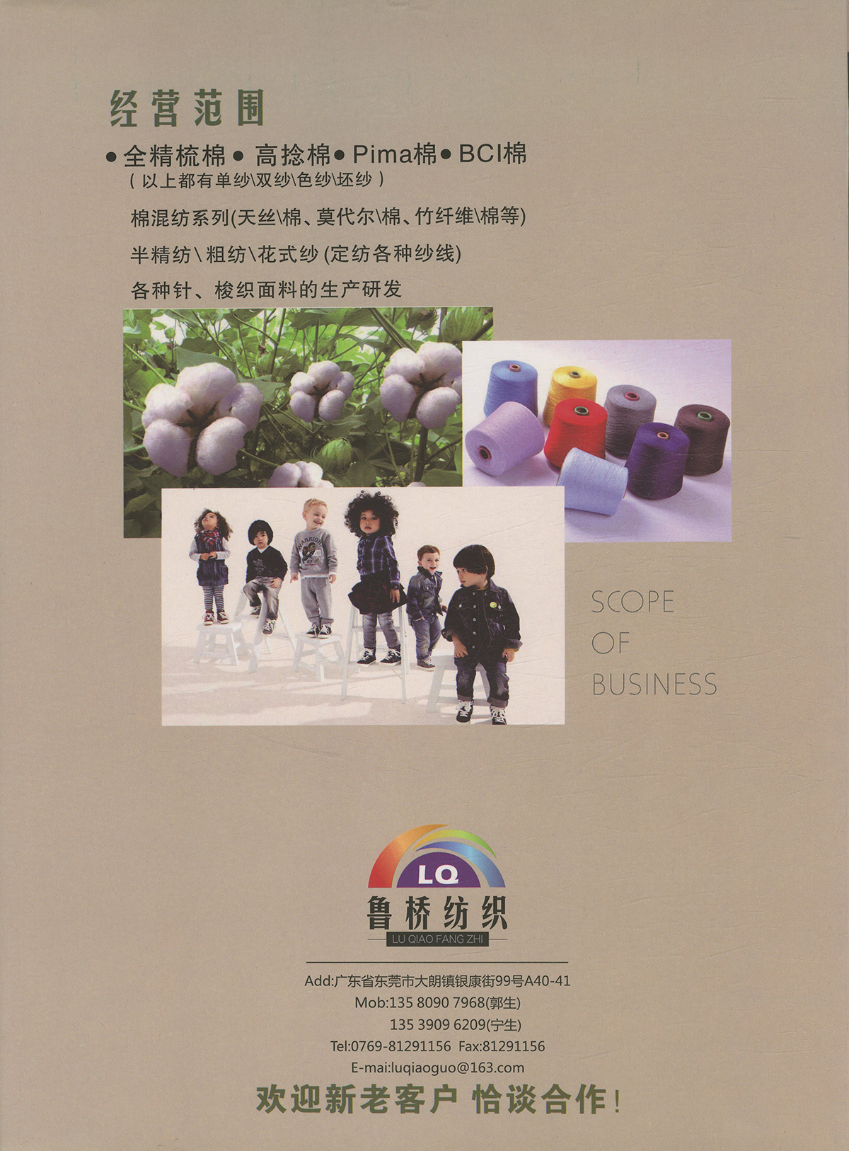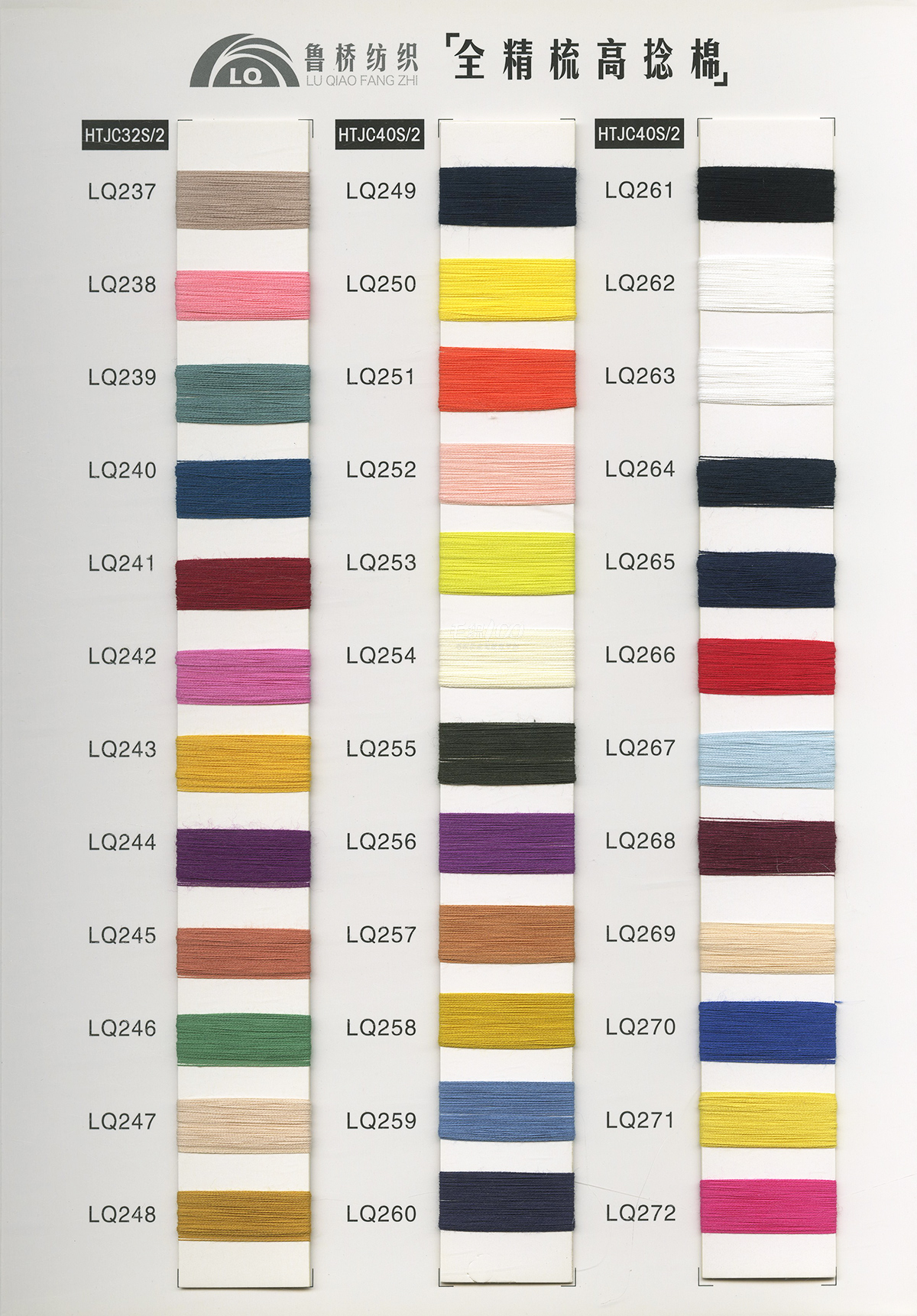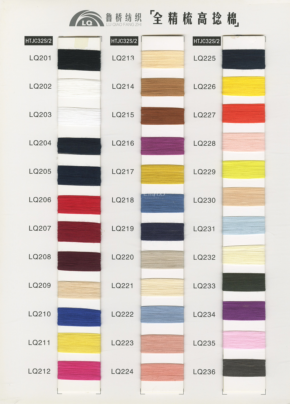 32s/2& 40s/2& 60s/2全精梳棉高捻棉色纱;32s/2&40s/2长绒棉(PIMA);立体棉 2/36&2/51&2/68超柔长绒棉; NM2/28&2/32&2/48 棉羊绒 ; NM2/28特级仿羊绒澳毛纱; 32s/2兰精A100天丝; 32s/2兰精莫代尔/棉;