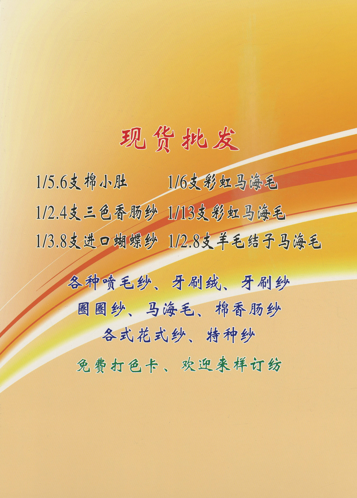 主营产品现货 彩虹系列、蝴蝶纱系列、纯棉大肚纱系列、棉香肠纱系列、涤纶香肠纱系列、 牙刷绒,有光牙刷纱,楼梯纱,灯笼纱,结子纱,菊花纱,半边绒、圈圈纱大量现货白胚 欢迎来样加工定制各种花式纱 以上产品均有中性色卡,欢迎同行力推本公司产品。
