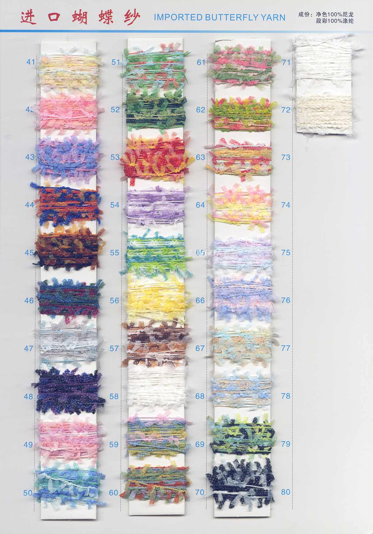 主营产品现货 彩虹系列、蝴蝶纱系列、纯棉大肚纱系列、棉香肠纱系列、涤纶香肠纱系列、 牙刷绒,有光牙刷纱,楼梯纱,灯笼纱,结子纱,菊花纱,半边绒、圈圈纱大量现货白胚 欢迎来样加工定制各种花式纱 以上产品均有中性色卡,欢迎同行力推本公司产品。