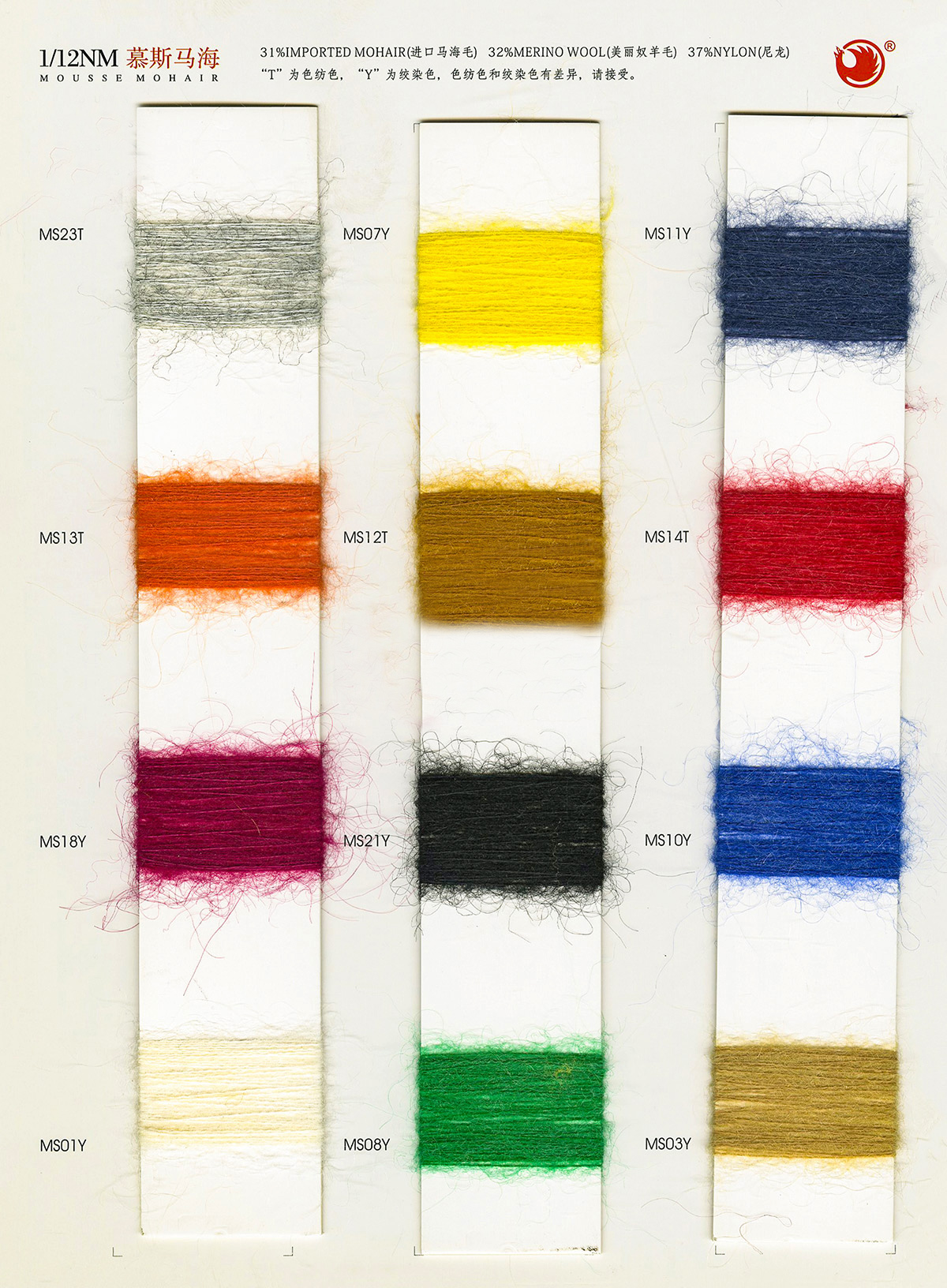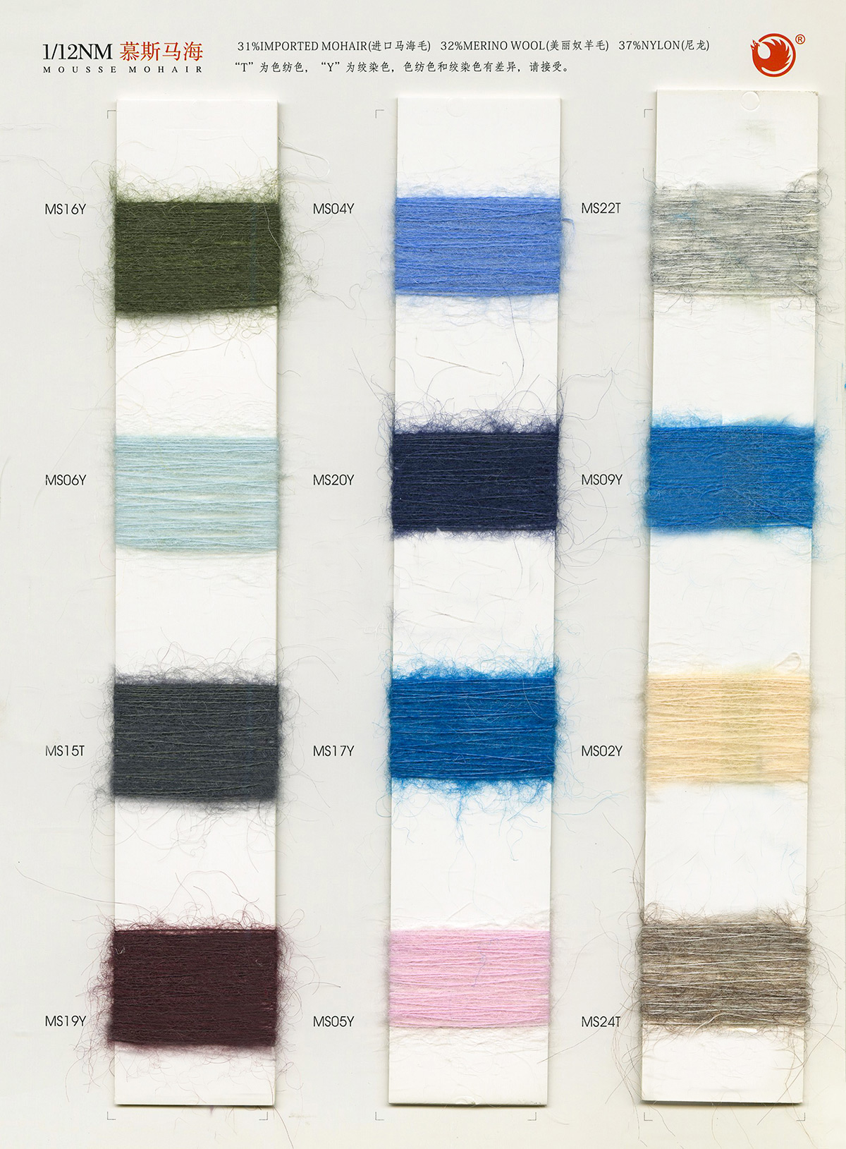 6/1维丝可喷毛绒、14/1雅克牛绒、5.5/1雪花骆马绒、3.5/1绚丽喷毛绒、8/1羊驼喷毛绒、5.5/1骆马喷毛绒、3.5/1亮彩喷毛绒、15/1迷你羊驼圈圈、14/1纤柔马海圈圈、7.5支马海圈圈纱、13/1羊毛长毛、9.8支骆马长毛、5.5支羊驼长毛、14/1华咔约马海、12/1北美浣熊绒、9/1阿拉善骆驼绒、14/2芙尔丽绒、6/2新丝丽绒、2/16南非再生驼绒