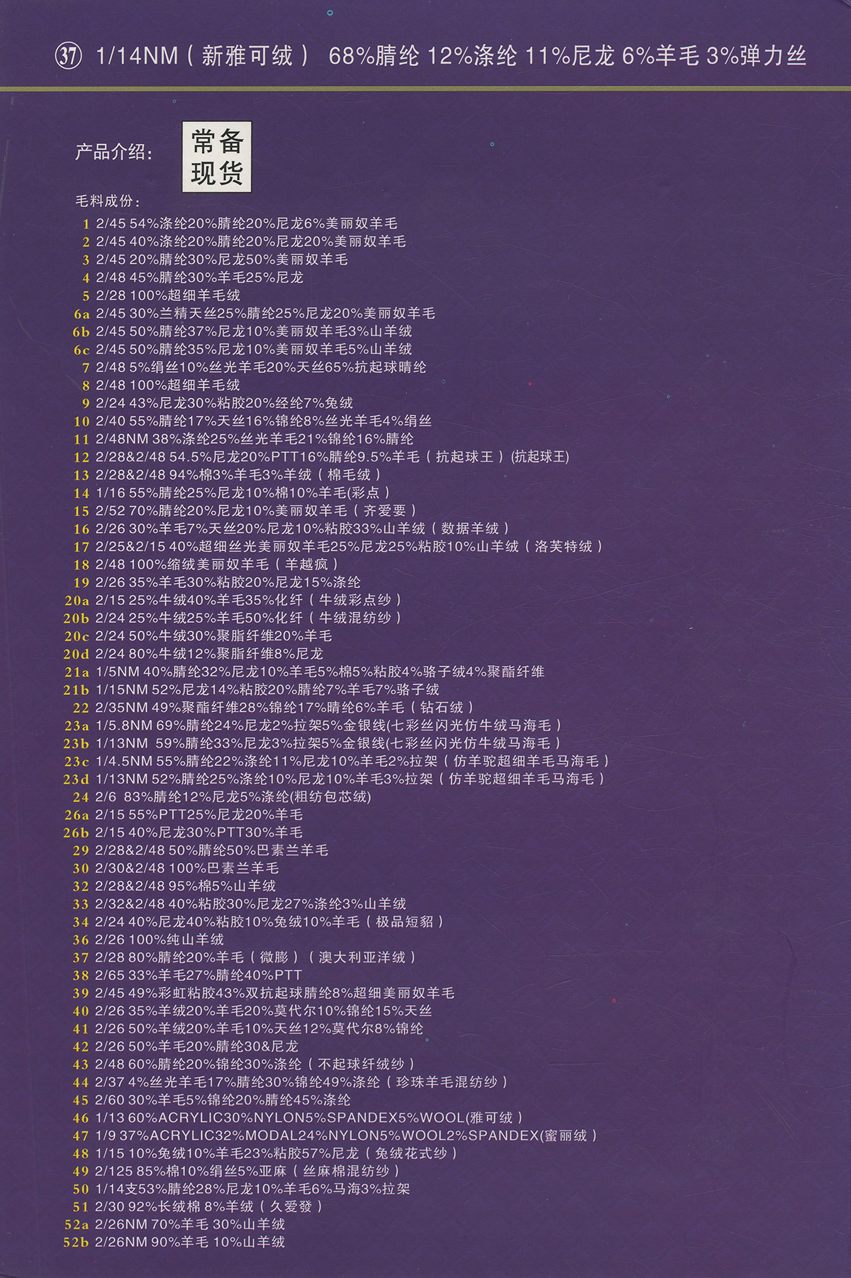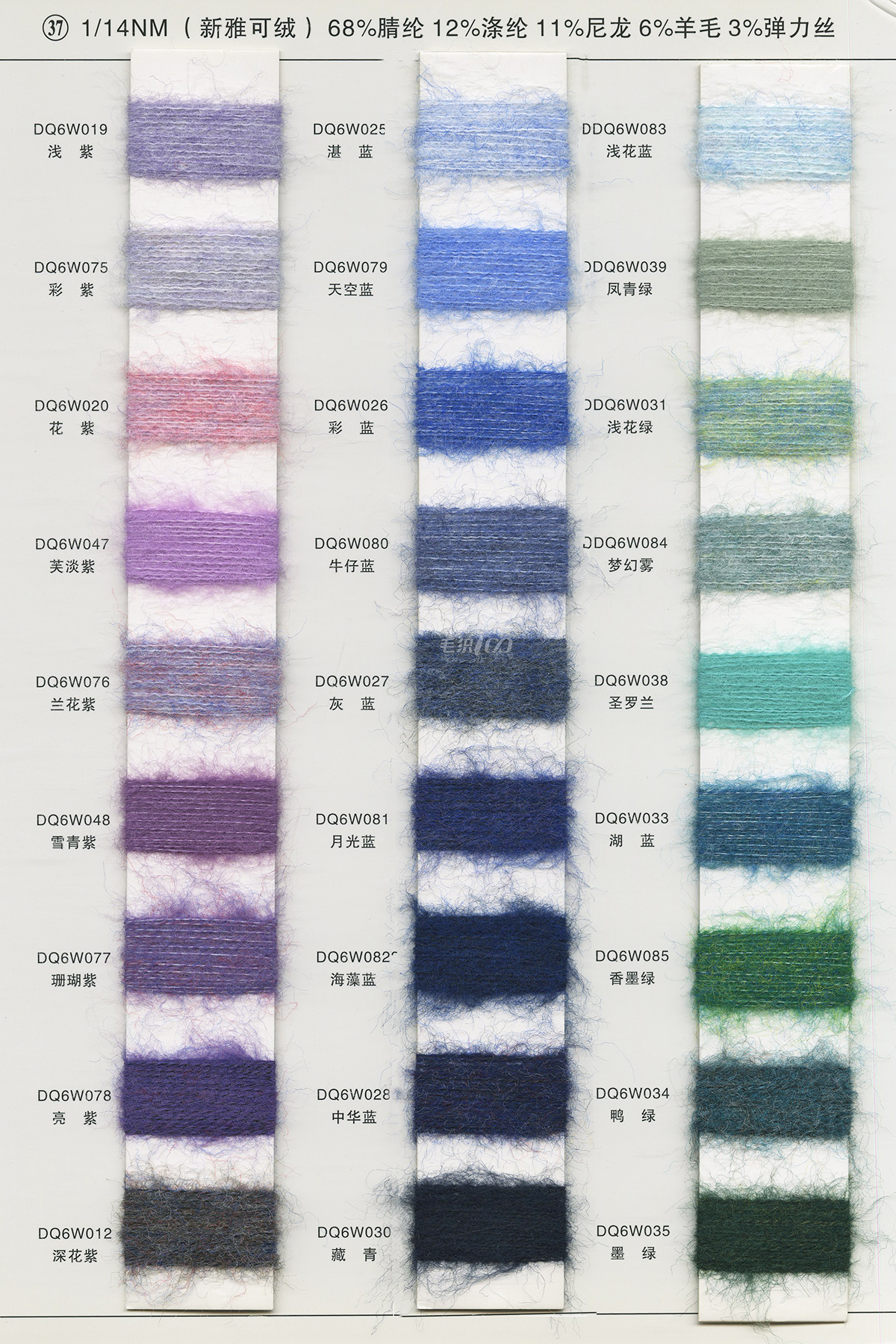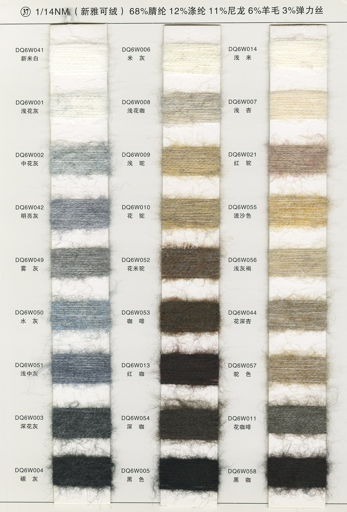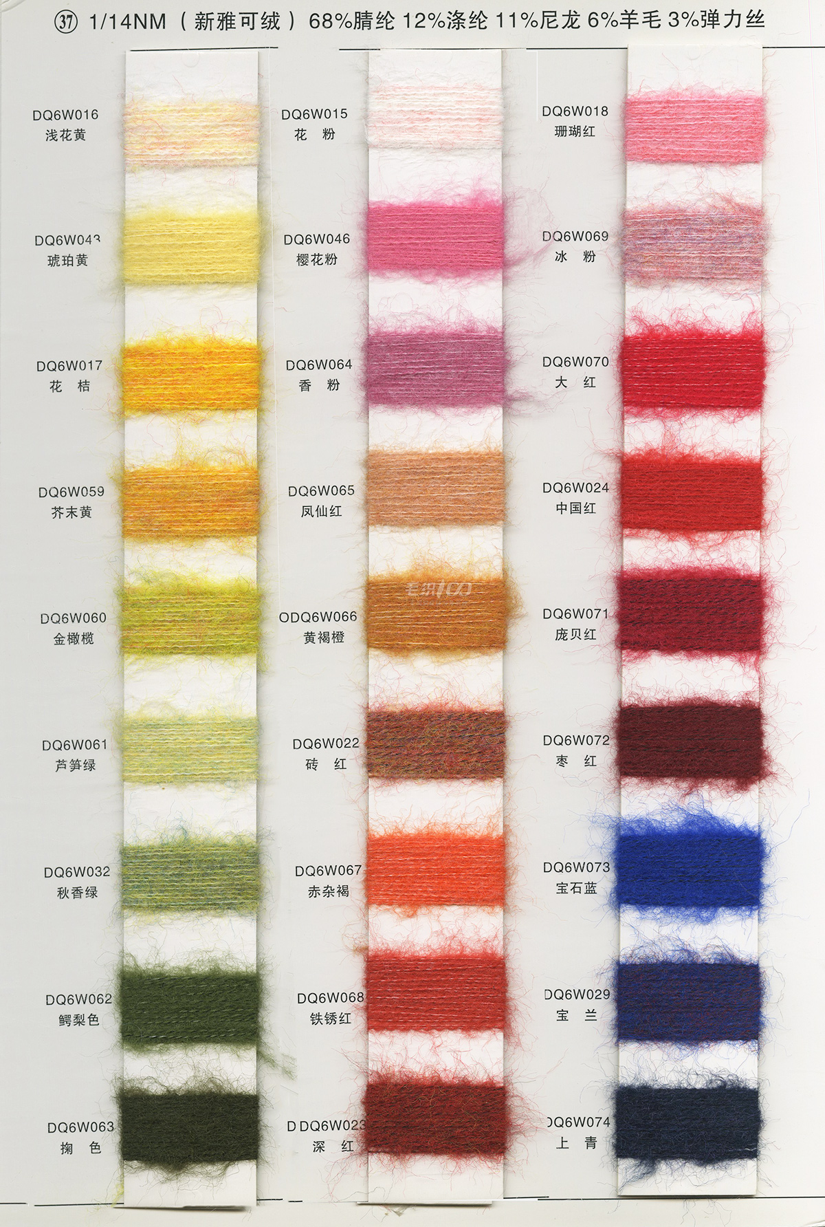 68%腈纶12%涤纶11%尼龙6%羊毛3%弹力丝(新雅可绒)