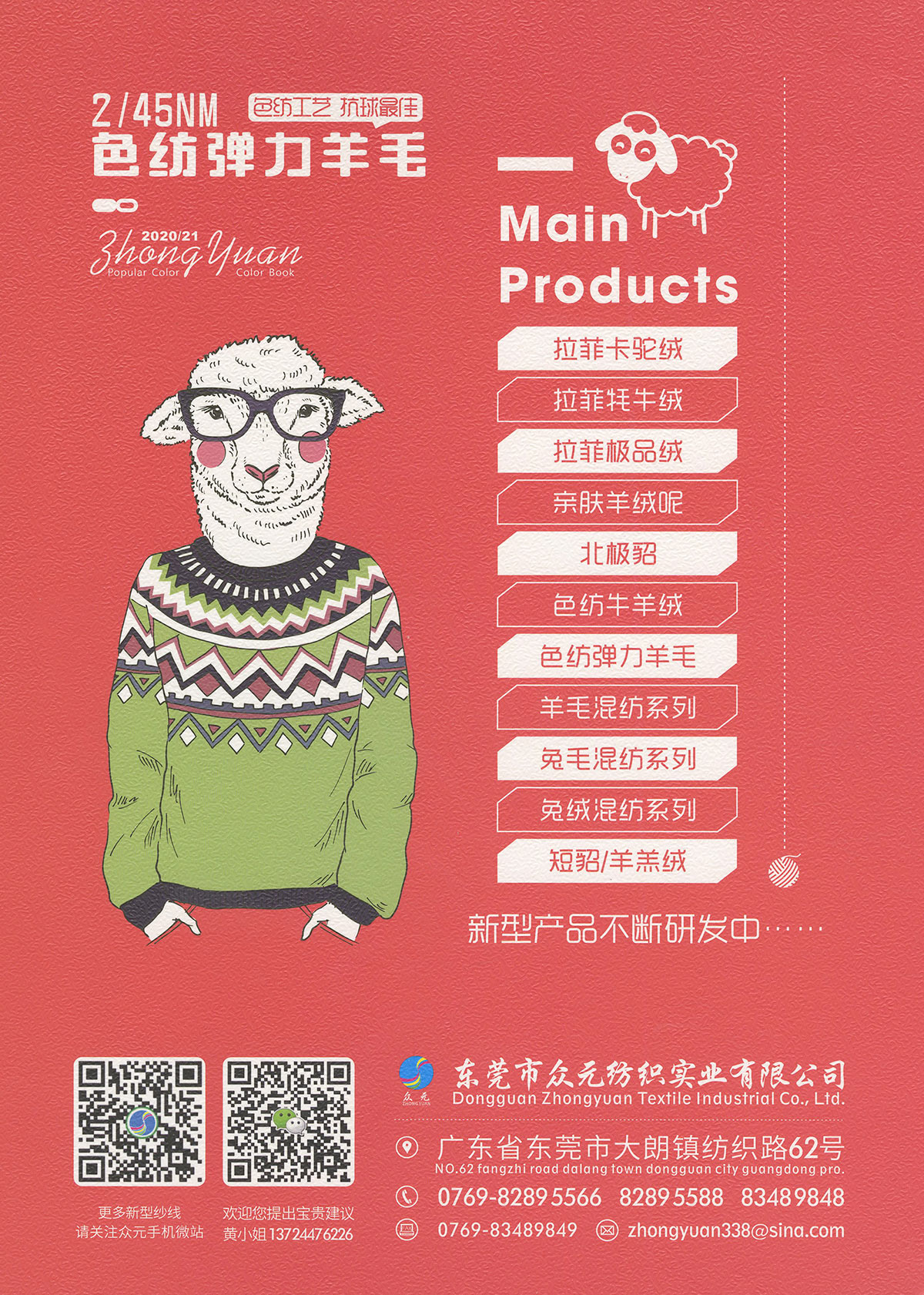 1/8拉菲牦牛绒、1/15拉菲卡驼绒、1/18亲肤羊绒呢、1/9拉菲极品绒、1/6.5幻彩星空、1/14色纺牛羊绒、2/9北极貂、1/3.8凤凰喷毛、2/45色纺弹力羊毛、2/45羊毛混纺、2/28羊毛混纺、1/16兔绒混纺纱、1/15低比例兔毛、1/15高比例兔毛、1/10短貂毛、1/10高端羊羔绒。