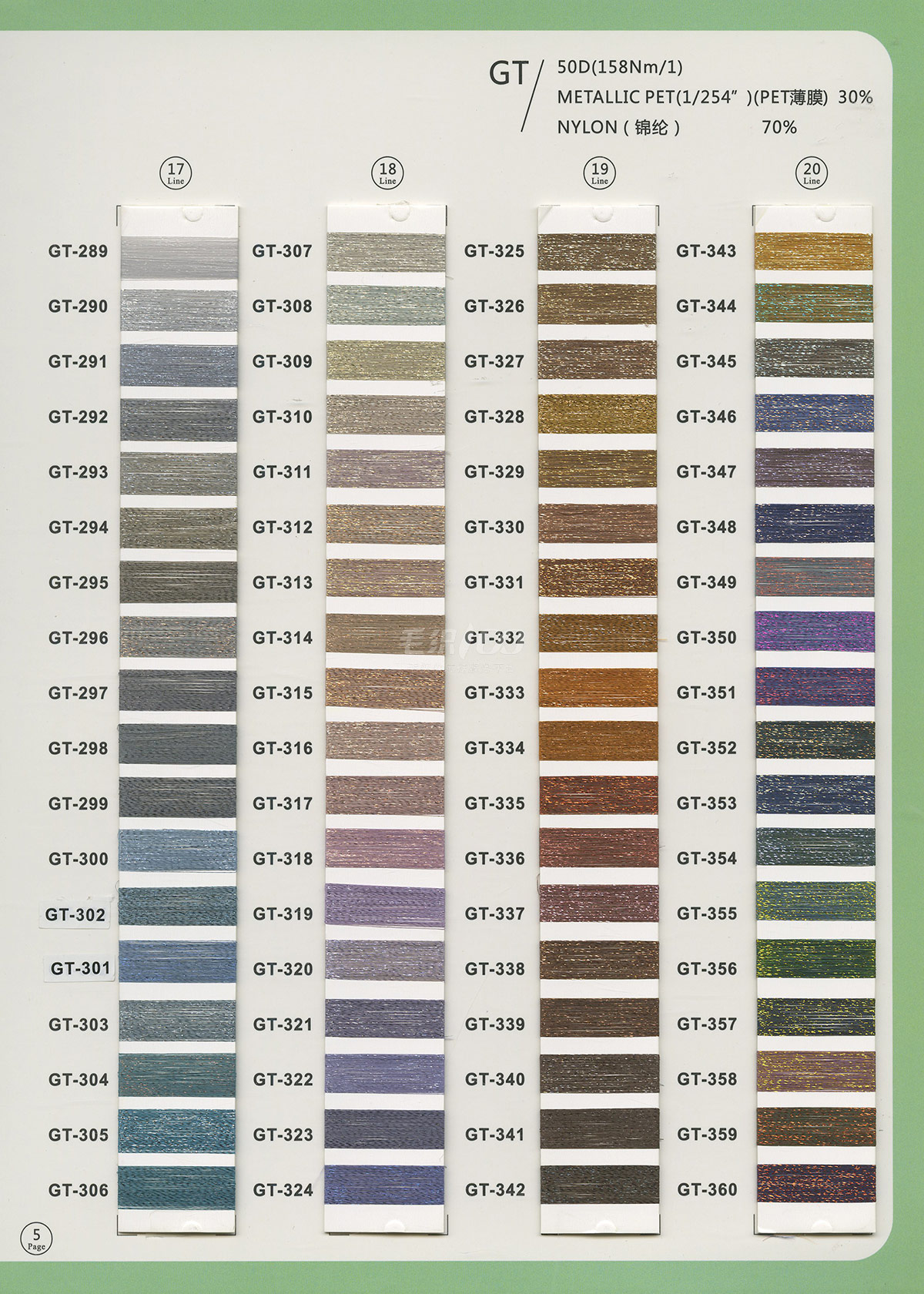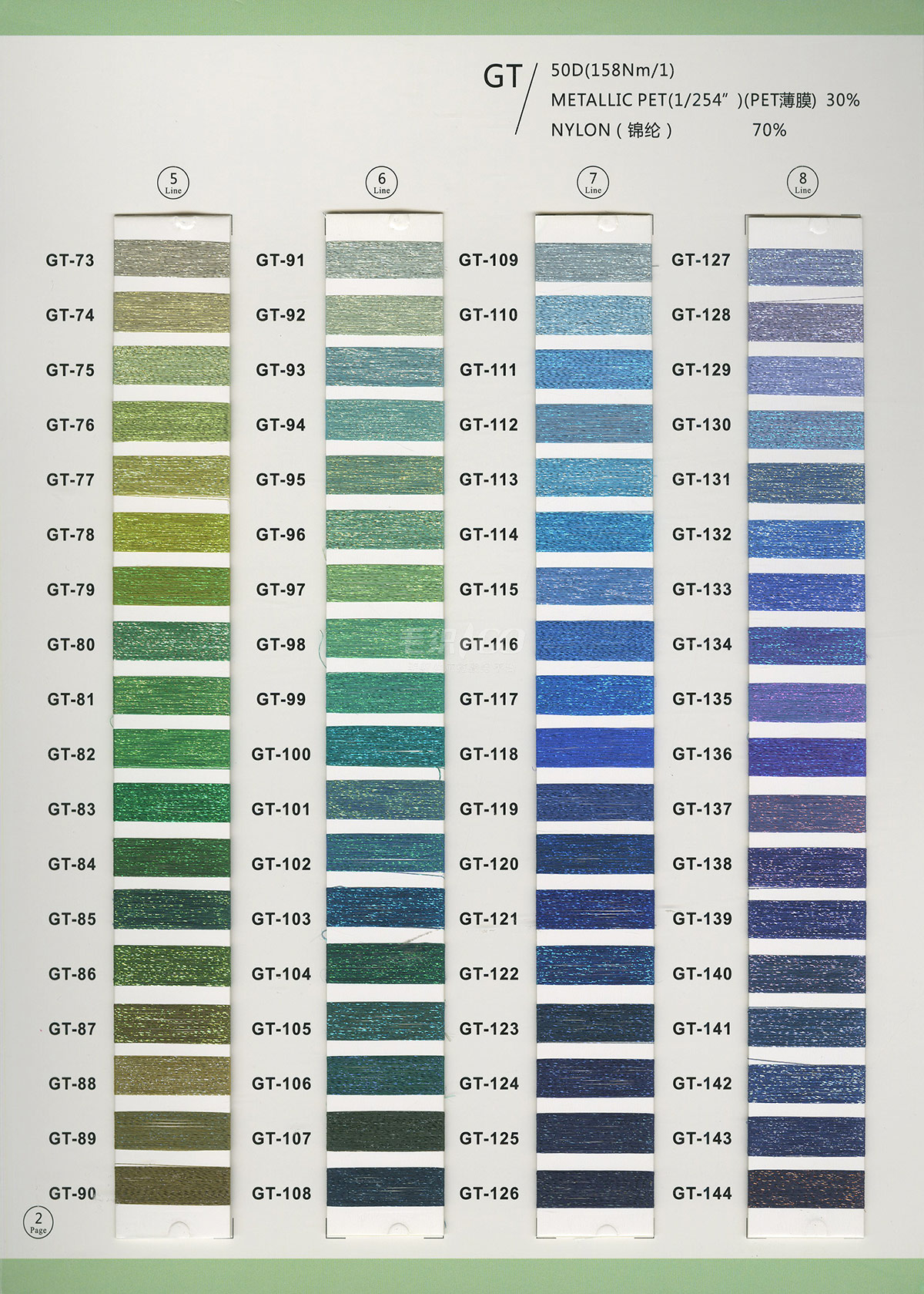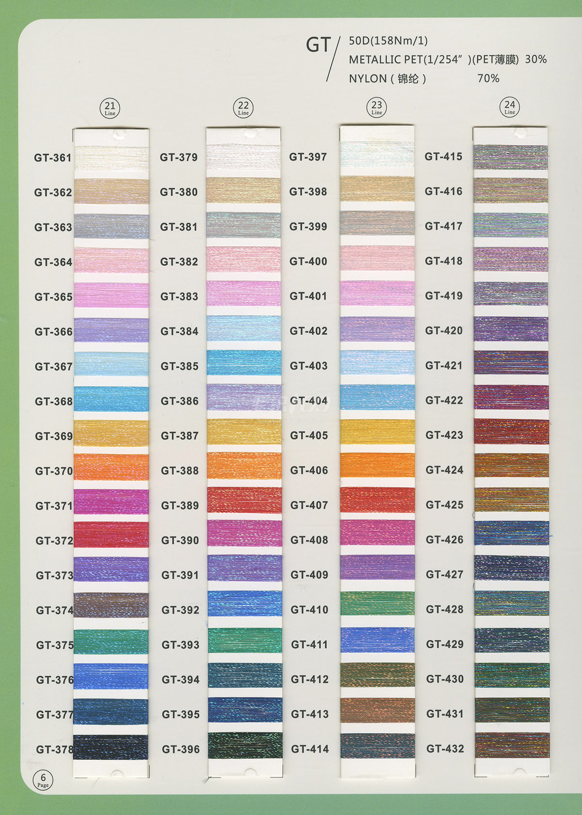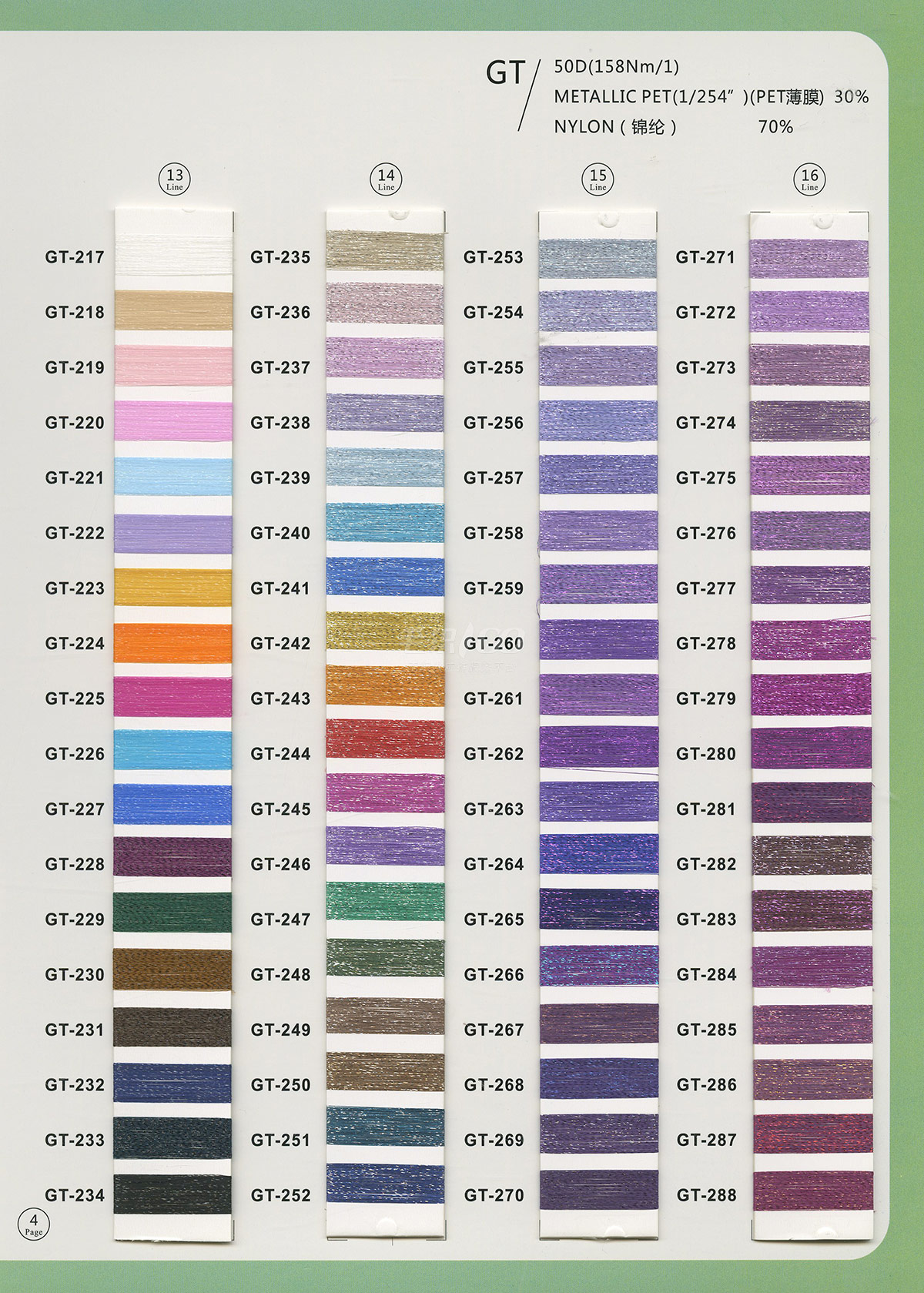 半精纺系列:亲肤33羊毛(2/60、2/48)、亲肤100%羊毛(2/17、2/26)、2/26 5羊绒、10羊绒,2//45NM亲肤6羊毛,2/48NM亲肤9羊毛 闪光系列:2/56NM亲肤闪光30羊毛,亲肤闪光6、9羊毛系列 1/45NM亲肤闪光人造丝,1/21NM亲肤闪光幻雪棉, 1/21NM亲肤闪光GN系列 2/48NM亲肤恒丽绒 金银丝系列 1/360 GJ丝柔金银丝 1/254 GTXT超柔金银丝 AK超细 MH常规 花式纱