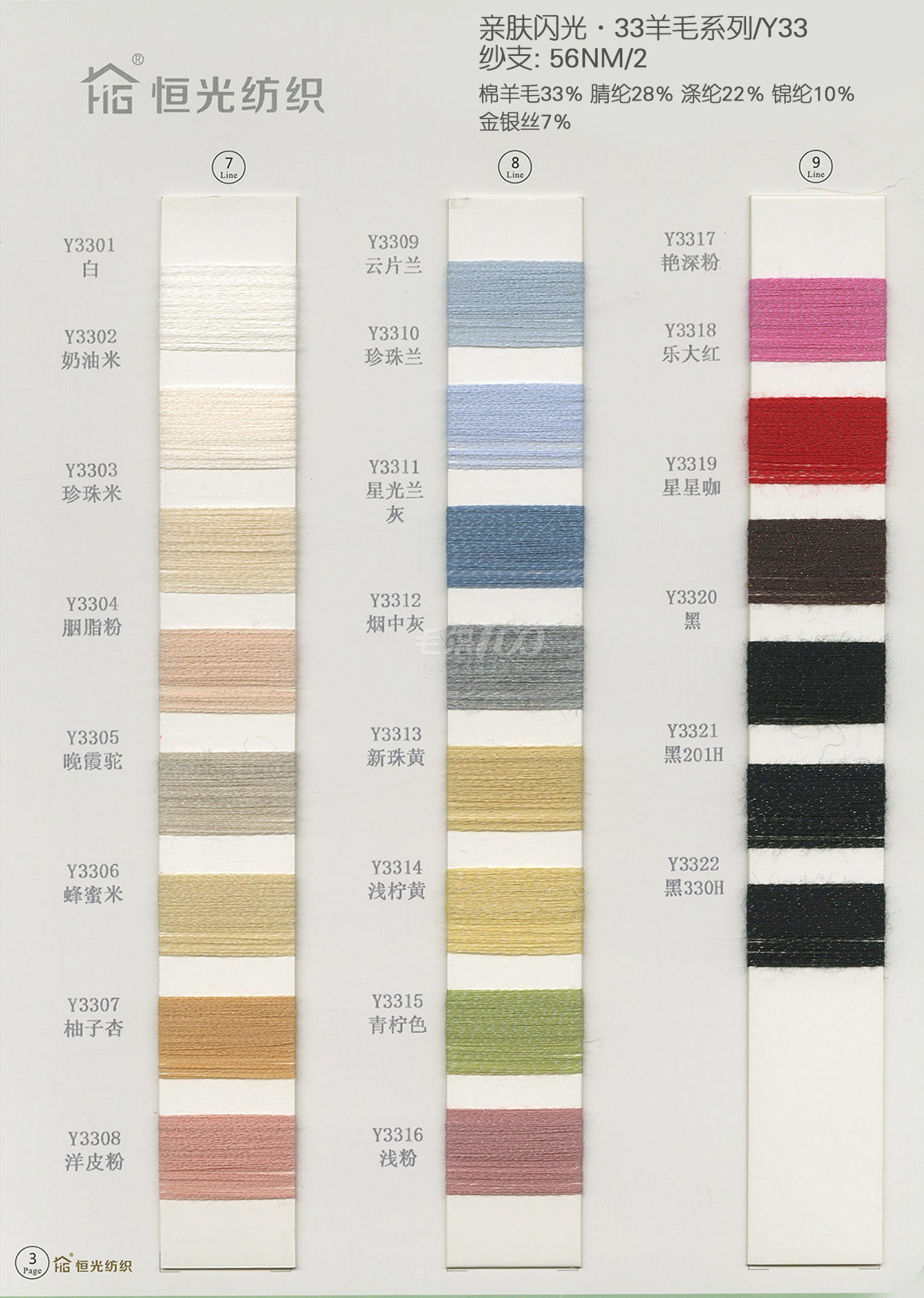 半精纺系列:亲肤33羊毛(2/60、2/48)、亲肤100%羊毛(2/17、2/26)、2/26 5羊绒、10羊绒,2//45NM亲肤6羊毛,2/48NM亲肤9羊毛 闪光系列:2/56NM亲肤闪光30羊毛,亲肤闪光6、9羊毛系列 1/45NM亲肤闪光人造丝,1/21NM亲肤闪光幻雪棉, 1/21NM亲肤闪光GN系列 2/48NM亲肤恒丽绒 金银丝系列 1/360 GJ丝柔金银丝 1/254 GTXT超柔金银丝 AK超细 MH常规 花式纱
