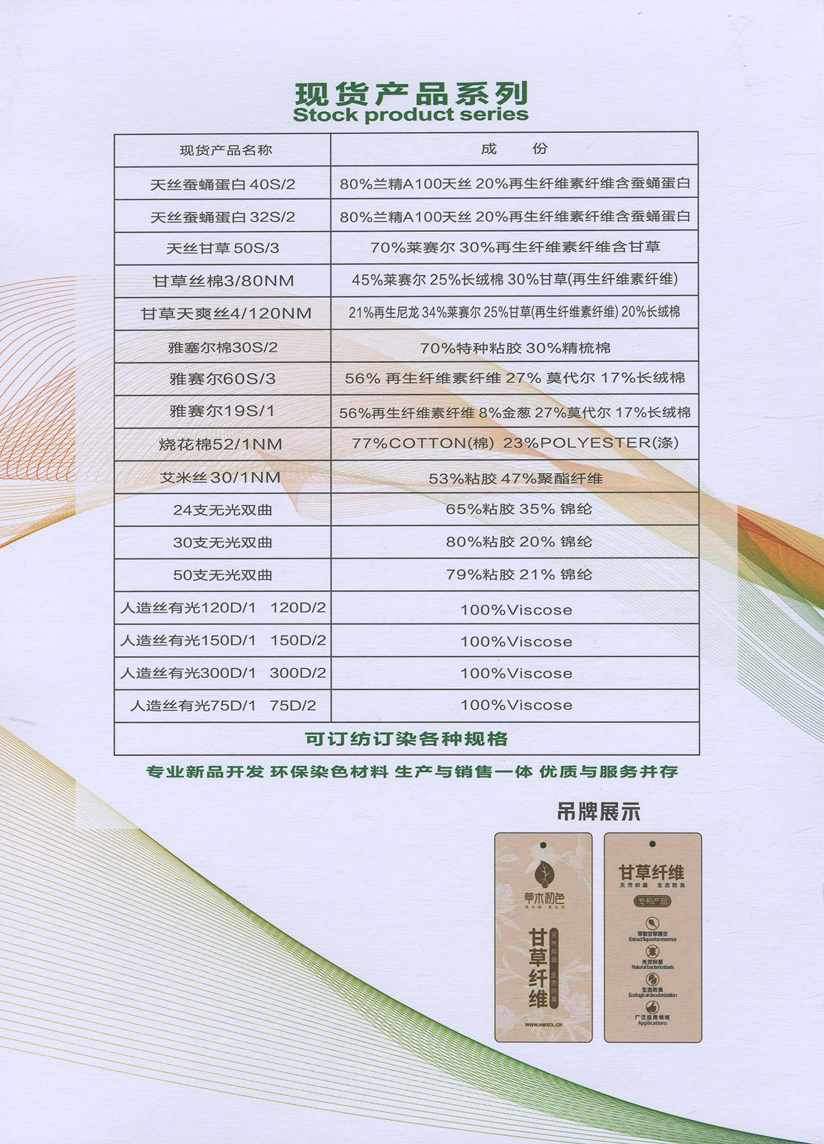 主营:功能性纤维及纱线产品,蚕蛹蛋白,羊绒蛋白,羽毛蛋白,甘草纤维,天丝蚕蛹蛋白.天丝甘草,再生环保产品及各种规格人造丝