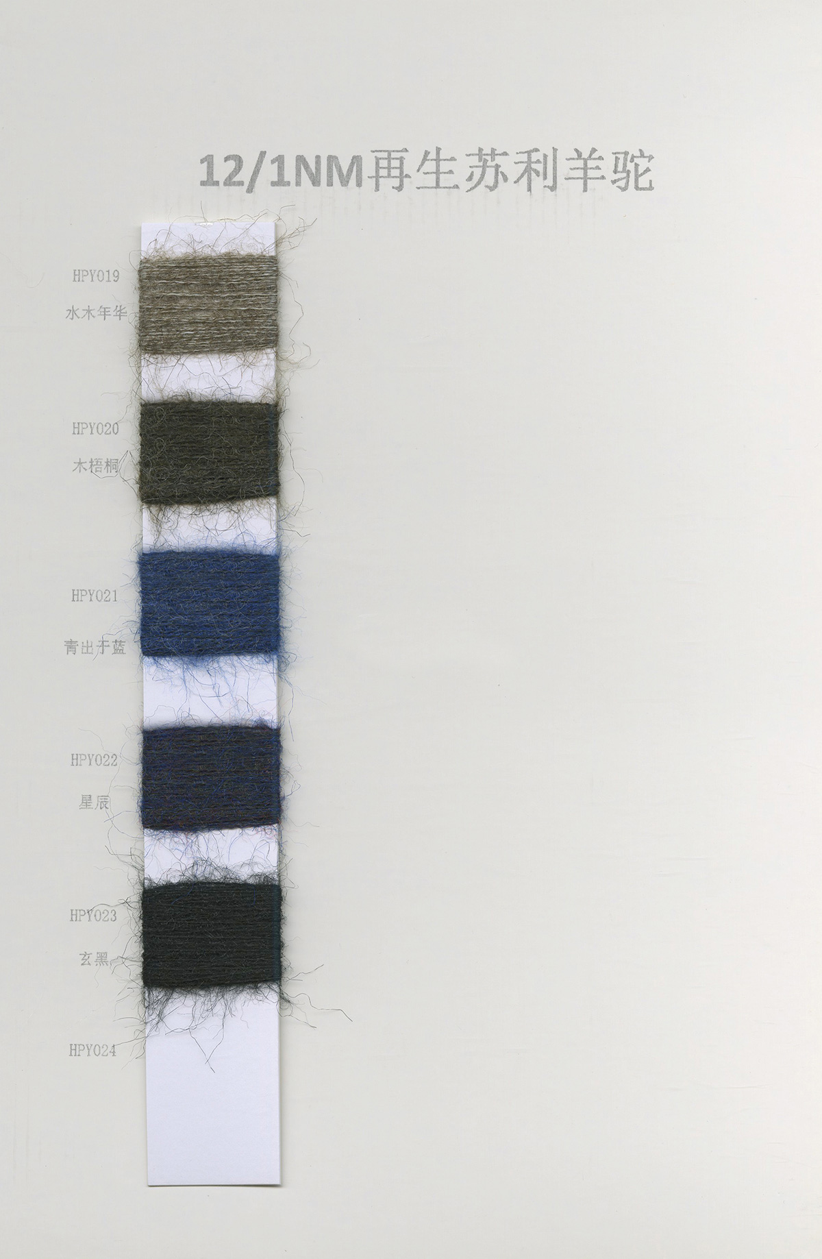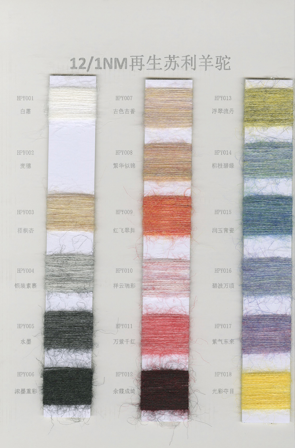 6/1维丝可喷毛绒、14/1雅克牛绒、5.5/1雪花骆马绒、3.5/1绚丽喷毛绒、8/1羊驼喷毛绒、5.5/1骆马喷毛绒、3.5/1亮彩喷毛绒、15/1迷你羊驼圈圈、14/1纤柔马海圈圈、7.5支马海圈圈纱、13/1羊毛长毛、9.8支骆马长毛、5.5支羊驼长毛、14/1华咔约马海、12/1北美浣熊绒、9/1阿拉善骆驼绒、14/2芙尔丽绒、6/2新丝丽绒、2/16南非再生驼绒