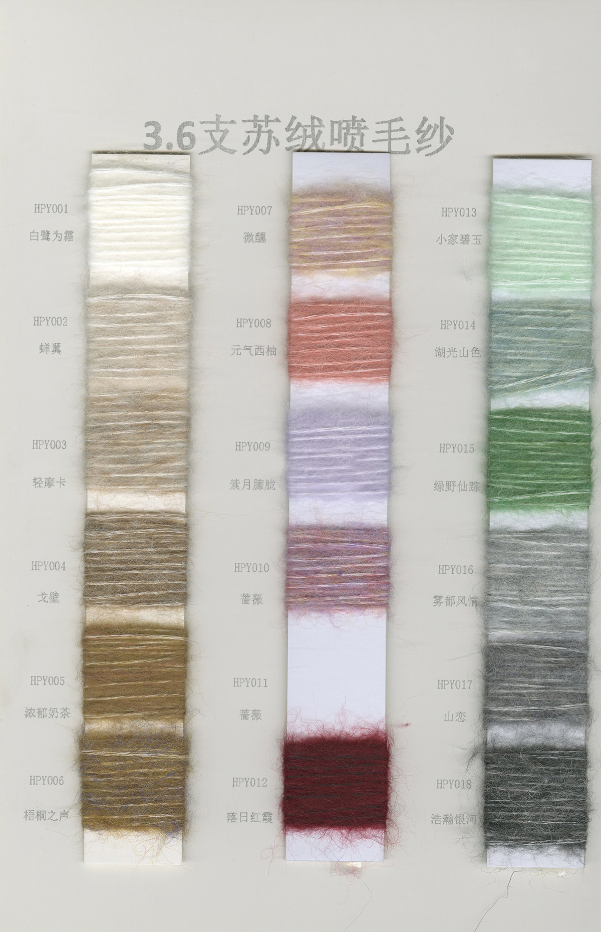 6/1维丝可喷毛绒、14/1雅克牛绒、5.5/1雪花骆马绒、3.5/1绚丽喷毛绒、8/1羊驼喷毛绒、5.5/1骆马喷毛绒、3.5/1亮彩喷毛绒、15/1迷你羊驼圈圈、14/1纤柔马海圈圈、7.5支马海圈圈纱、13/1羊毛长毛、9.8支骆马长毛、5.5支羊驼长毛、14/1华咔约马海、12/1北美浣熊绒、9/1阿拉善骆驼绒、14/2芙尔丽绒、6/2新丝丽绒、2/16南非再生驼绒