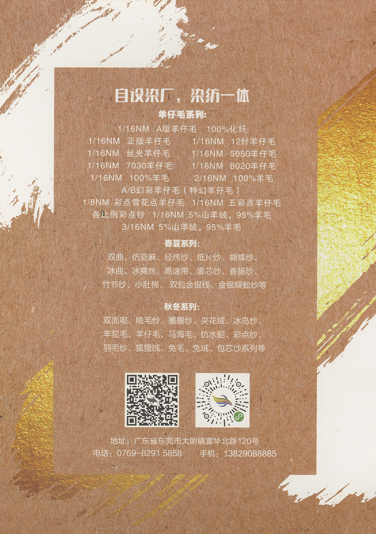 特种花式纱系列:蚂蚁绒、棉花绒、珊瑚绒、花驼绒、磨毛考拉绒、彩虹喷毛纱、羊绒珠片纱、再生莫代尔珠片纱、渐变彩虹喷毛系列、金银蜈蚣纱、金银玻璃纱、金银双包纱、金银空心带、香肠纱、蜻蜓纱、蝴蝶纱、高速带、马海毛、空心带、米粉纱、小肚棉、彩点纱、经纬纱、水结珠、梯仔纱、菊花纱、灯笼纱、羊驼毛、圈圈纱、等花式特种纱。