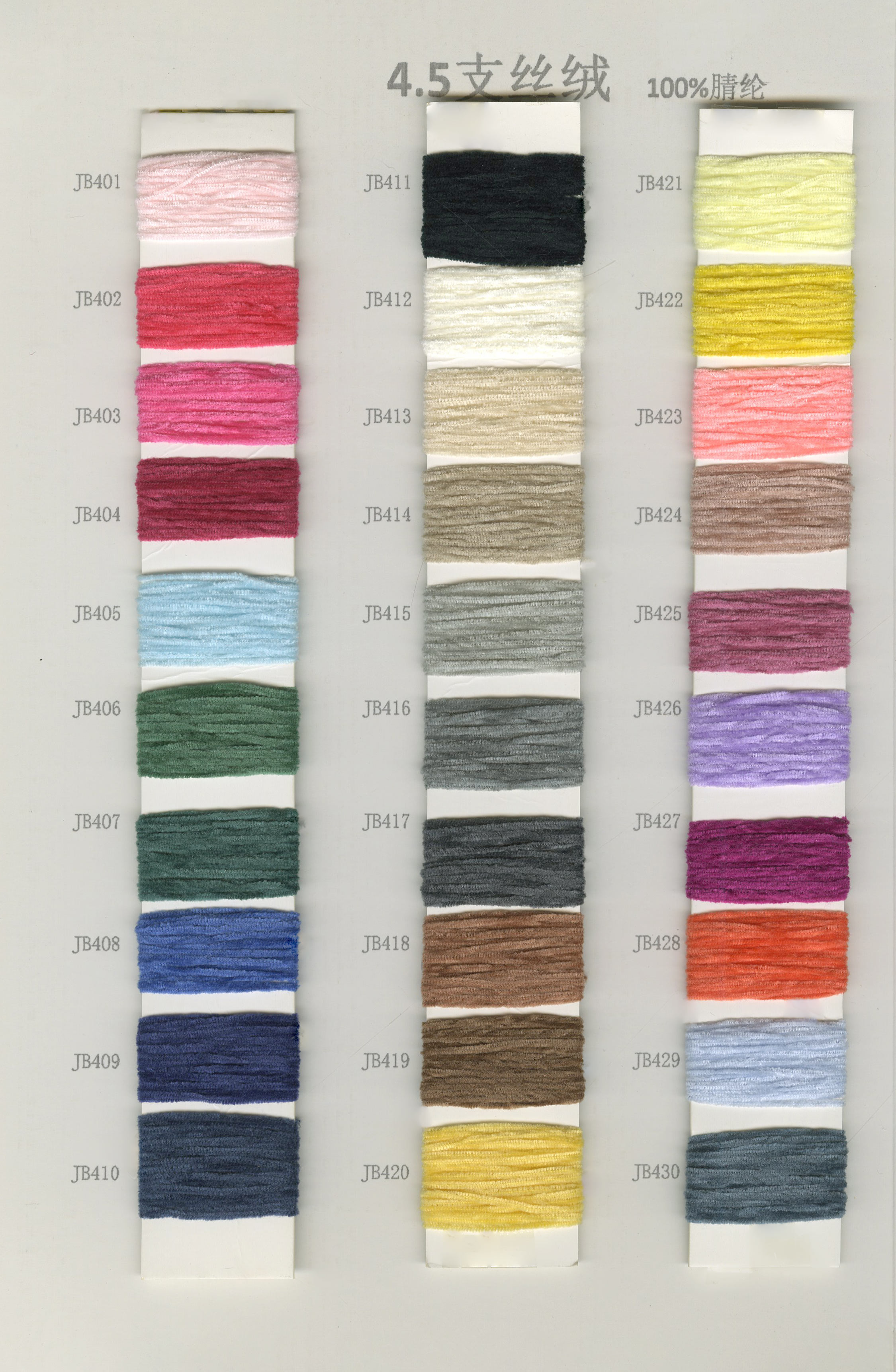 6/1维丝可喷毛绒、14/1雅克牛绒、5.5/1雪花骆马绒、3.5/1绚丽喷毛绒、8/1羊驼喷毛绒、5.5/1骆马喷毛绒、3.5/1亮彩喷毛绒、15/1迷你羊驼圈圈、14/1纤柔马海圈圈、7.5支马海圈圈纱、13/1羊毛长毛、9.8支骆马长毛、5.5支羊驼长毛、14/1华咔约马海、12/1北美浣熊绒、9/1阿拉善骆驼绒、14/2芙尔丽绒、6/2新丝丽绒、2/16南非再生驼绒