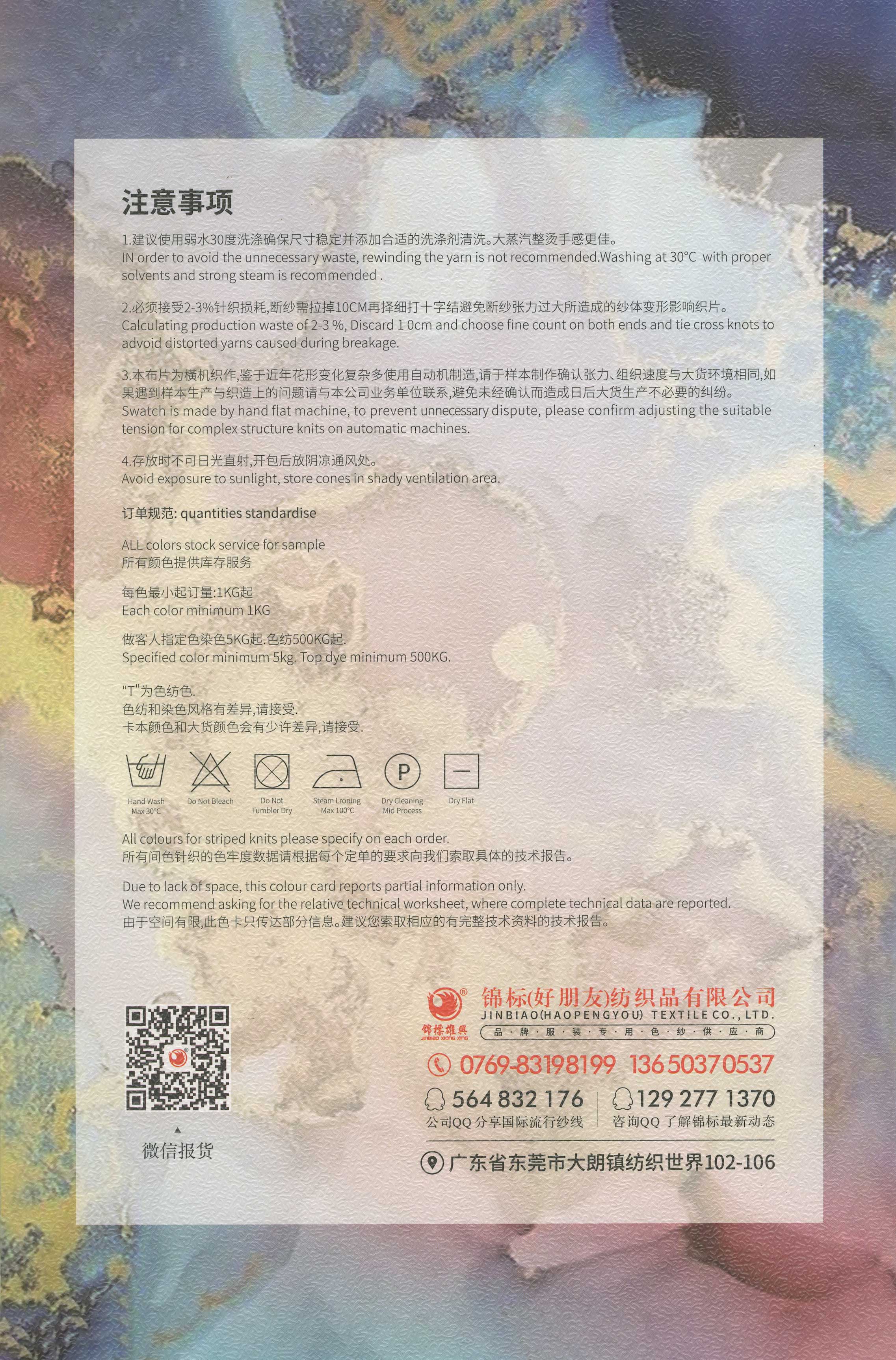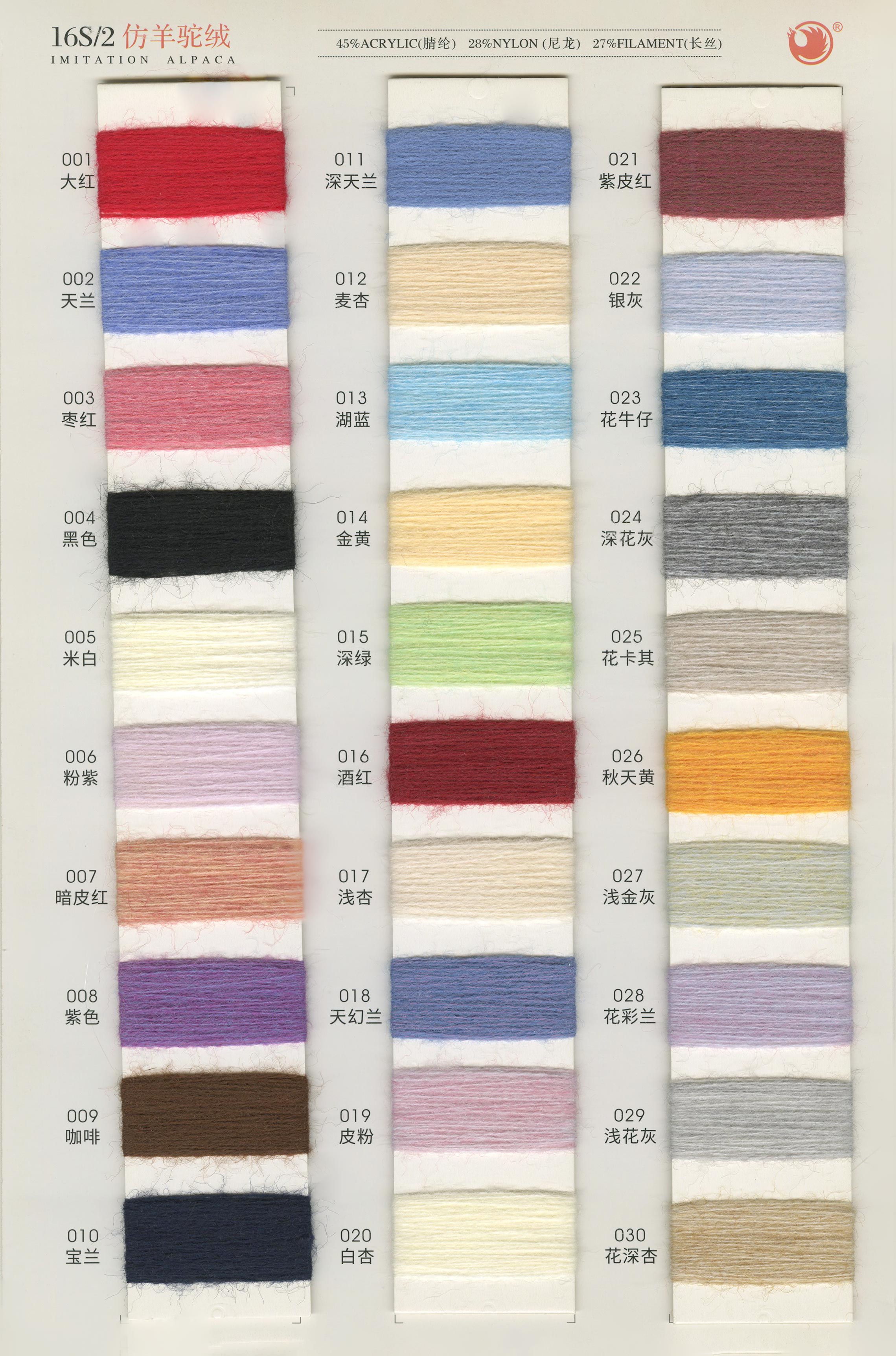 6/1维丝可喷毛绒、14/1雅克牛绒、5.5/1雪花骆马绒、3.5/1绚丽喷毛绒、8/1羊驼喷毛绒、5.5/1骆马喷毛绒、3.5/1亮彩喷毛绒、15/1迷你羊驼圈圈、14/1纤柔马海圈圈、7.5支马海圈圈纱、13/1羊毛长毛、9.8支骆马长毛、5.5支羊驼长毛、14/1华咔约马海、12/1北美浣熊绒、9/1阿拉善骆驼绒、14/2芙尔丽绒、6/2新丝丽绒、2/16南非再生驼绒