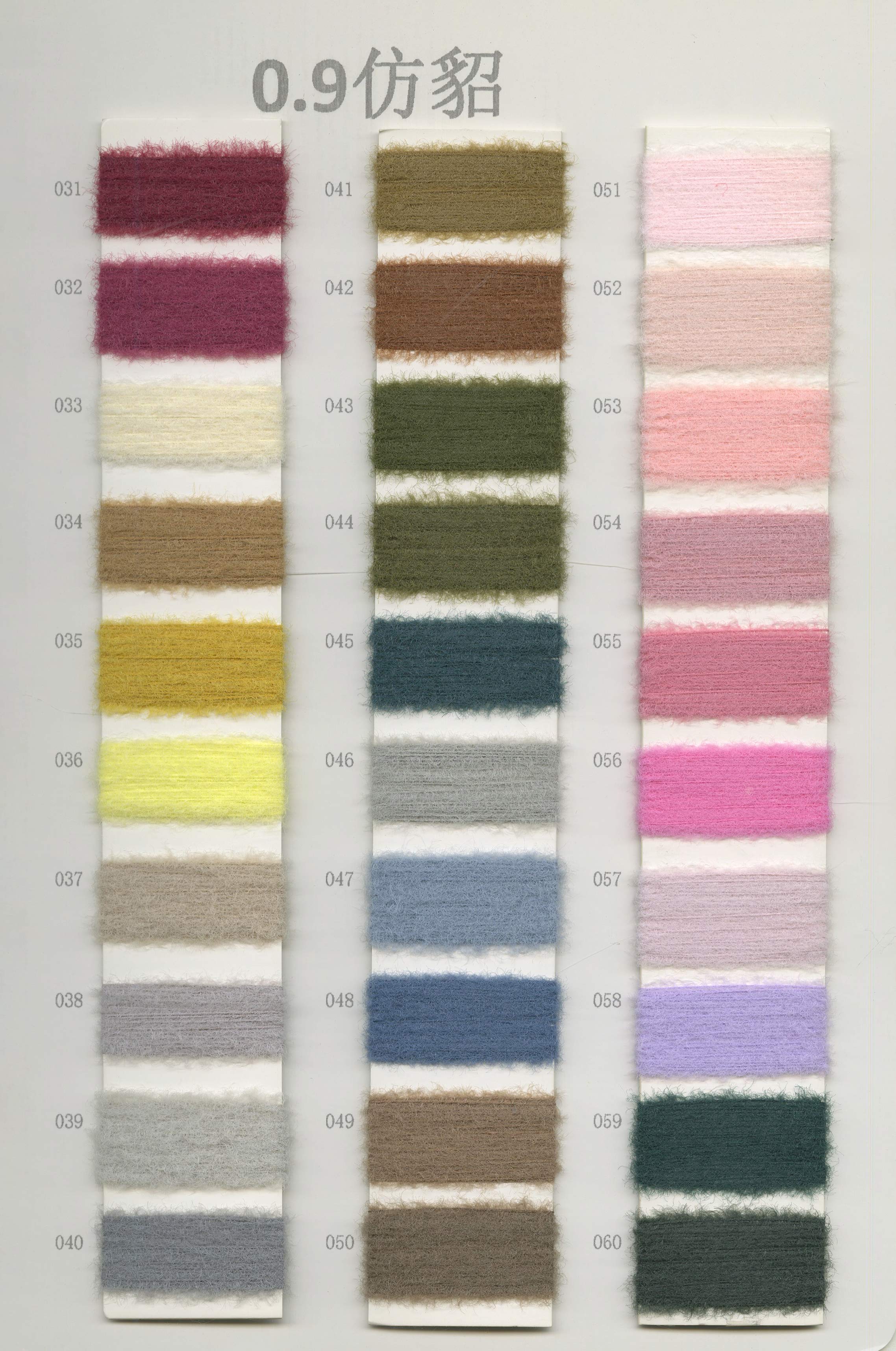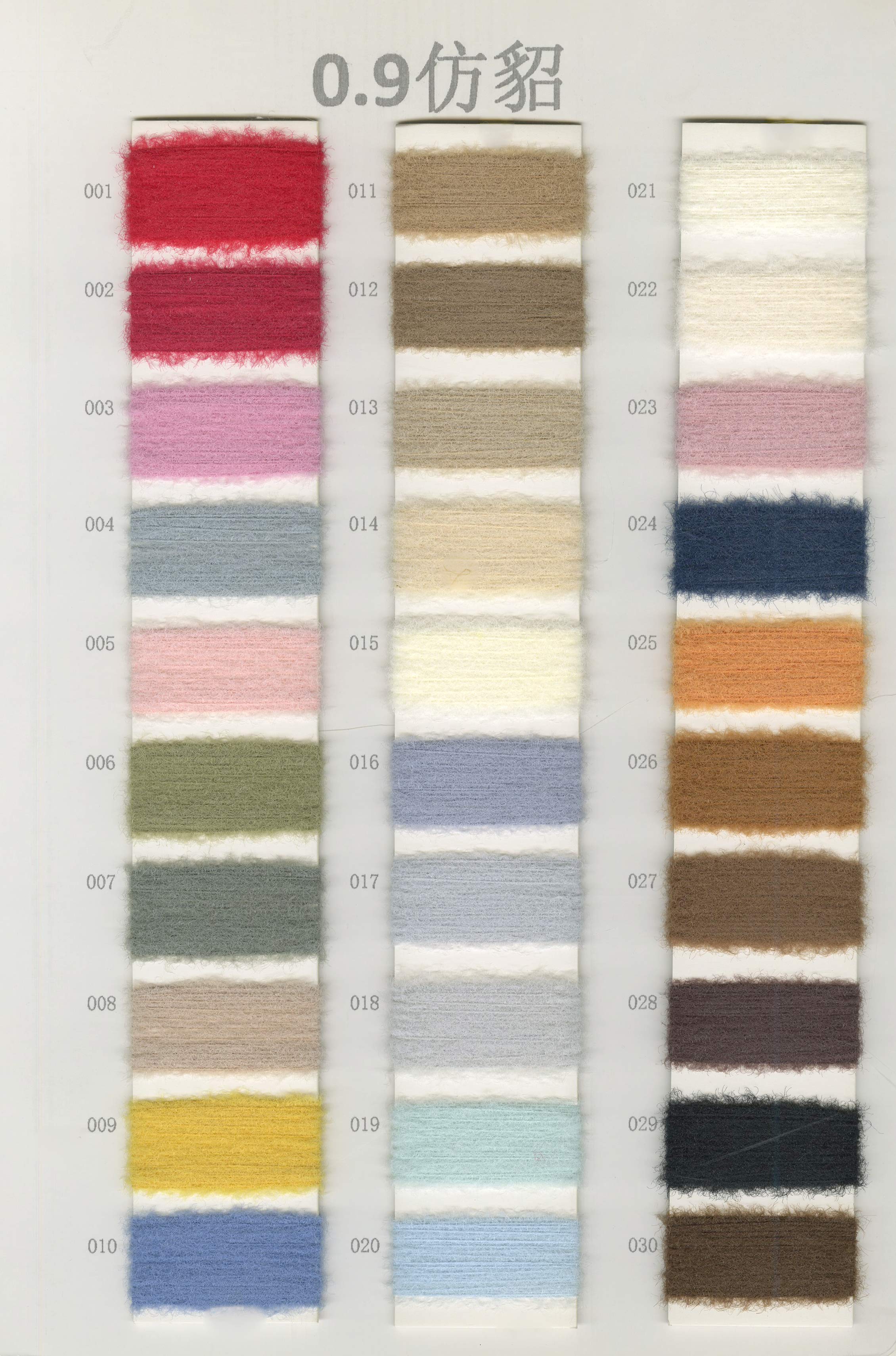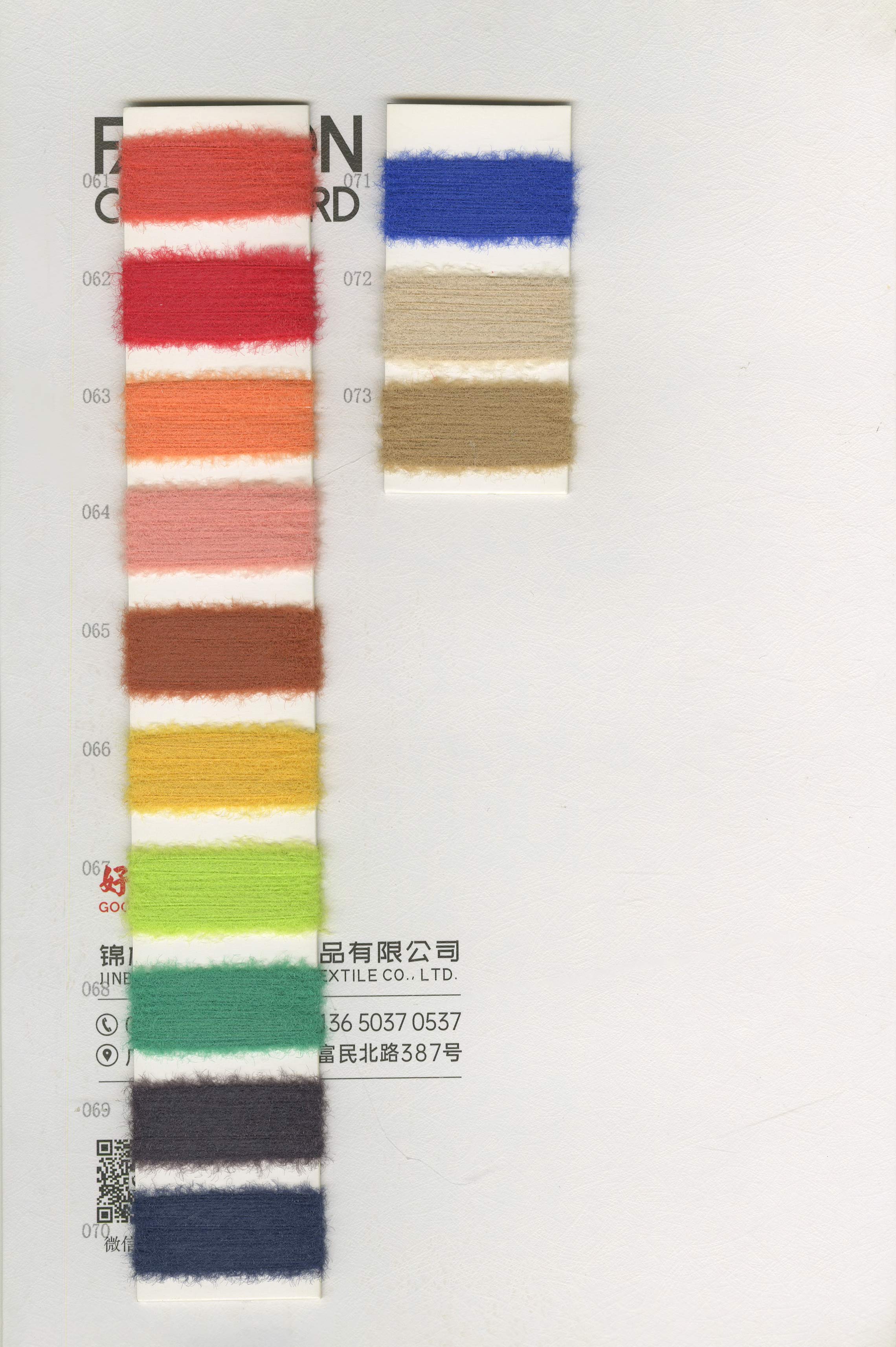 6/1维丝可喷毛绒、14/1雅克牛绒、5.5/1雪花骆马绒、3.5/1绚丽喷毛绒、8/1羊驼喷毛绒、5.5/1骆马喷毛绒、3.5/1亮彩喷毛绒、15/1迷你羊驼圈圈、14/1纤柔马海圈圈、7.5支马海圈圈纱、13/1羊毛长毛、9.8支骆马长毛、5.5支羊驼长毛、14/1华咔约马海、12/1北美浣熊绒、9/1阿拉善骆驼绒、14/2芙尔丽绒、6/2新丝丽绒、2/16南非再生驼绒