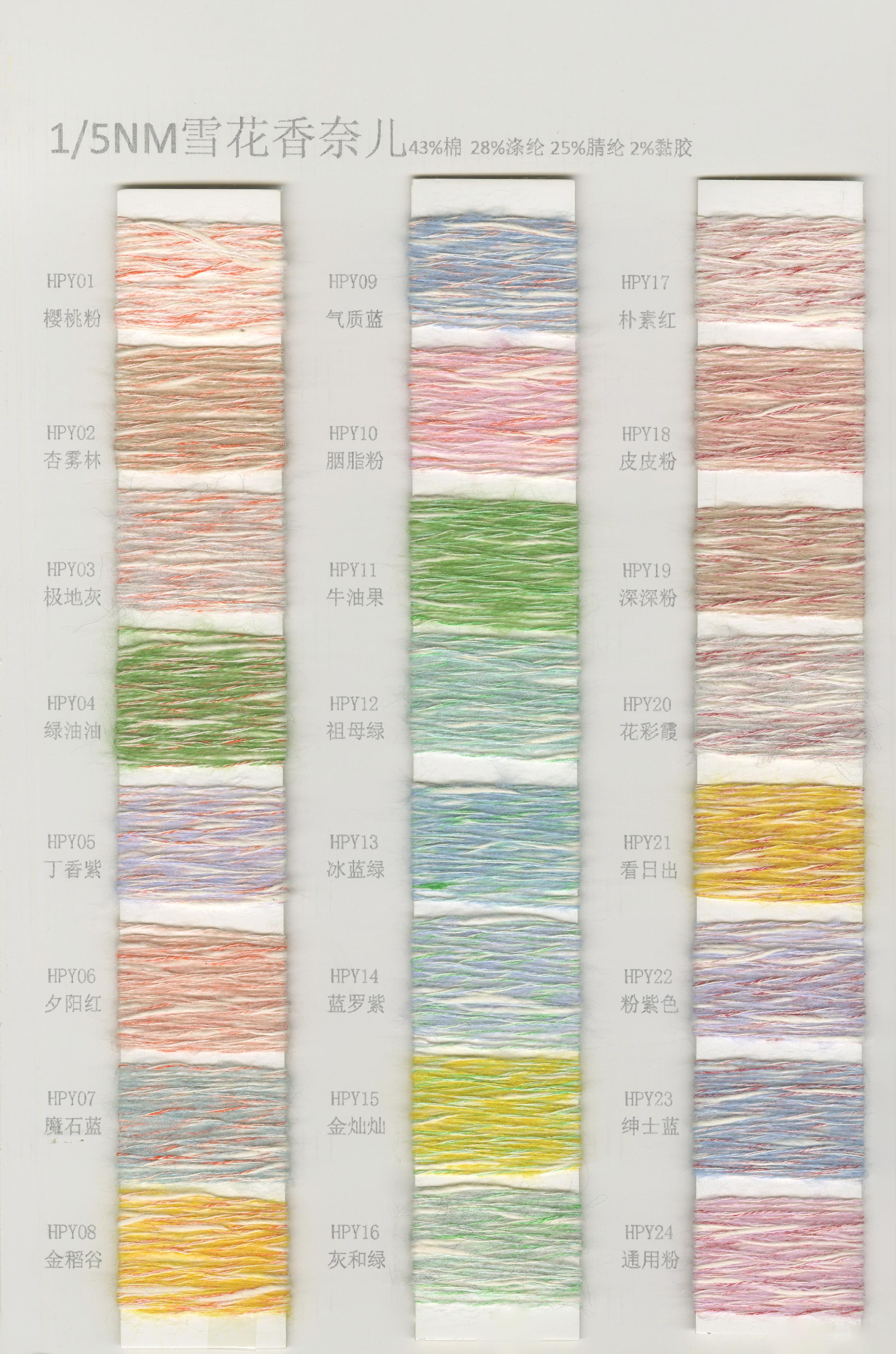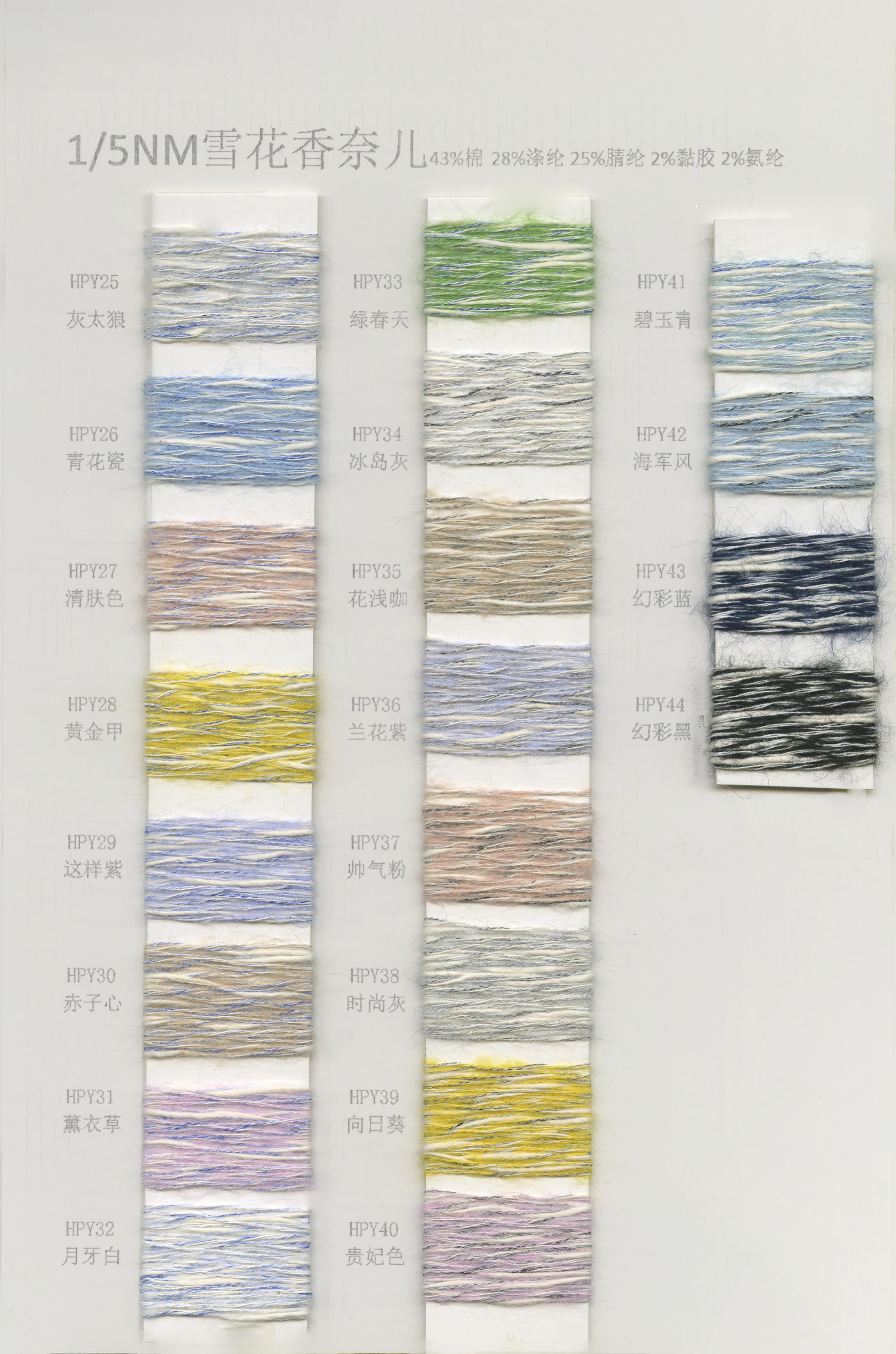 6/1维丝可喷毛绒、14/1雅克牛绒、5.5/1雪花骆马绒、3.5/1绚丽喷毛绒、8/1羊驼喷毛绒、5.5/1骆马喷毛绒、3.5/1亮彩喷毛绒、15/1迷你羊驼圈圈、14/1纤柔马海圈圈、7.5支马海圈圈纱、13/1羊毛长毛、9.8支骆马长毛、5.5支羊驼长毛、14/1华咔约马海、12/1北美浣熊绒、9/1阿拉善骆驼绒、14/2芙尔丽绒、6/2新丝丽绒、2/16南非再生驼绒