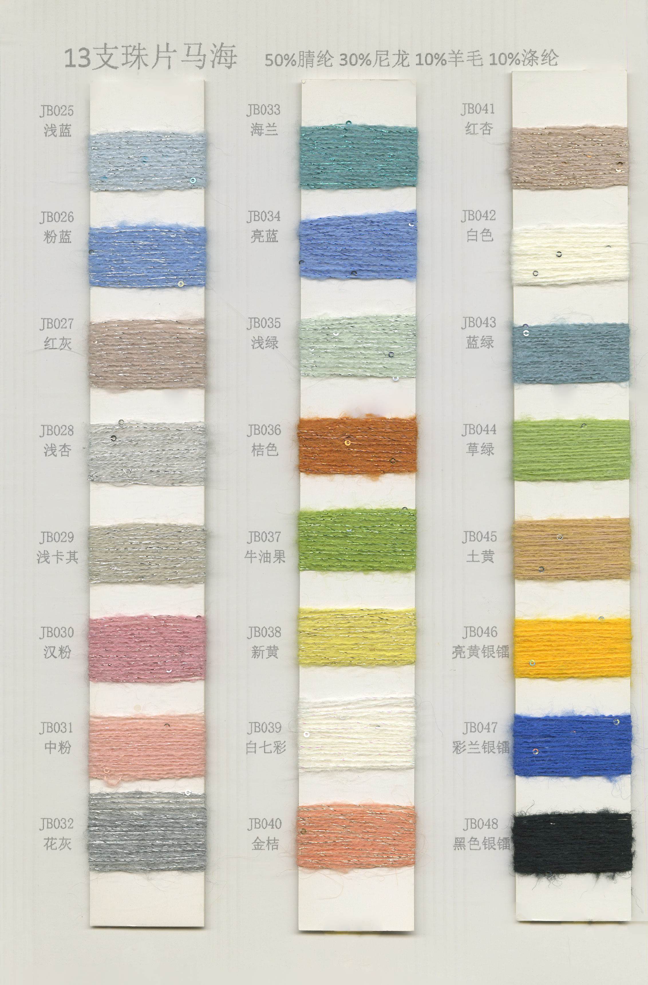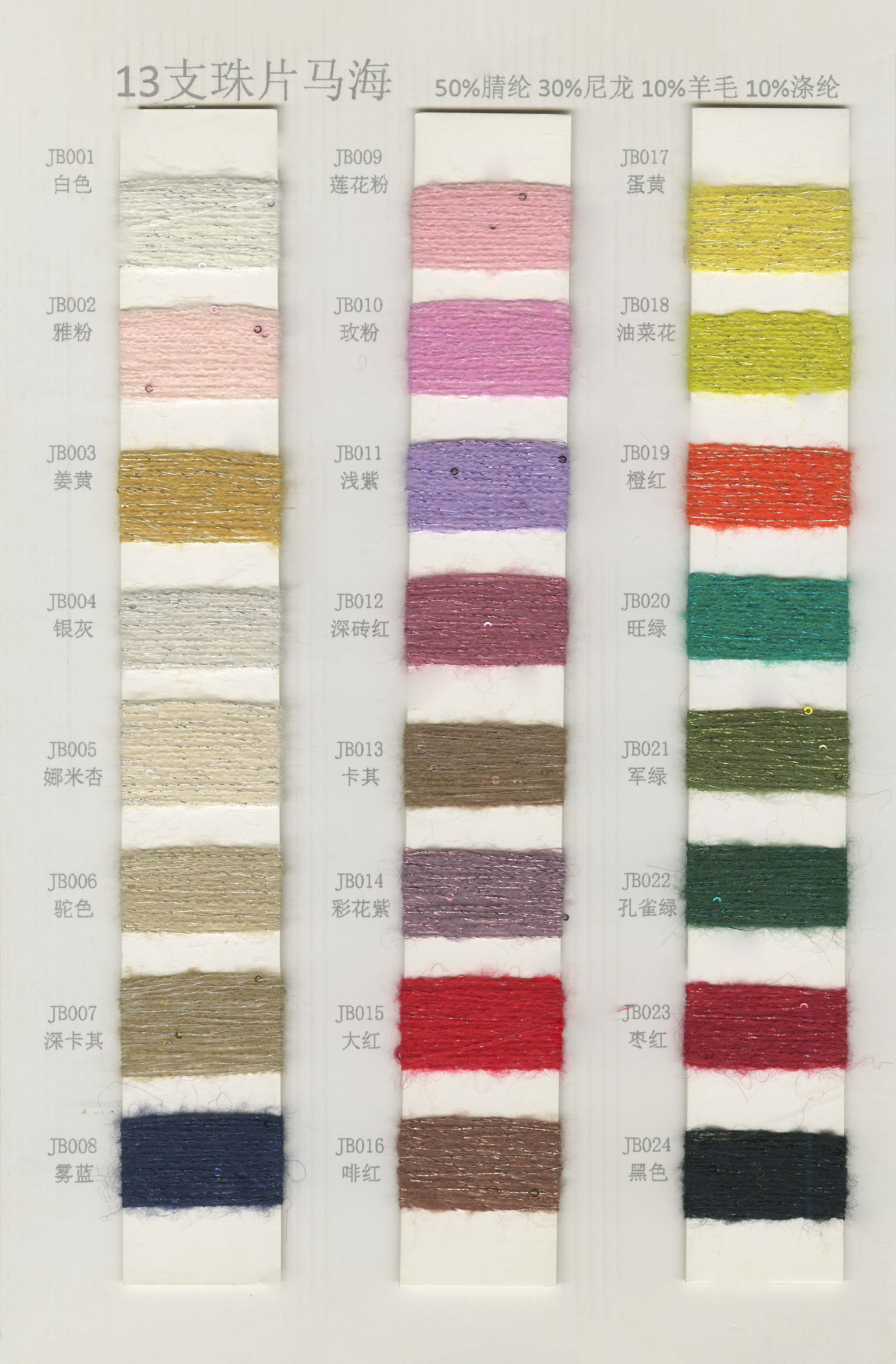 6/1维丝可喷毛绒、14/1雅克牛绒、5.5/1雪花骆马绒、3.5/1绚丽喷毛绒、8/1羊驼喷毛绒、5.5/1骆马喷毛绒、3.5/1亮彩喷毛绒、15/1迷你羊驼圈圈、14/1纤柔马海圈圈、7.5支马海圈圈纱、13/1羊毛长毛、9.8支骆马长毛、5.5支羊驼长毛、14/1华咔约马海、12/1北美浣熊绒、9/1阿拉善骆驼绒、14/2芙尔丽绒、6/2新丝丽绒、2/16南非再生驼绒