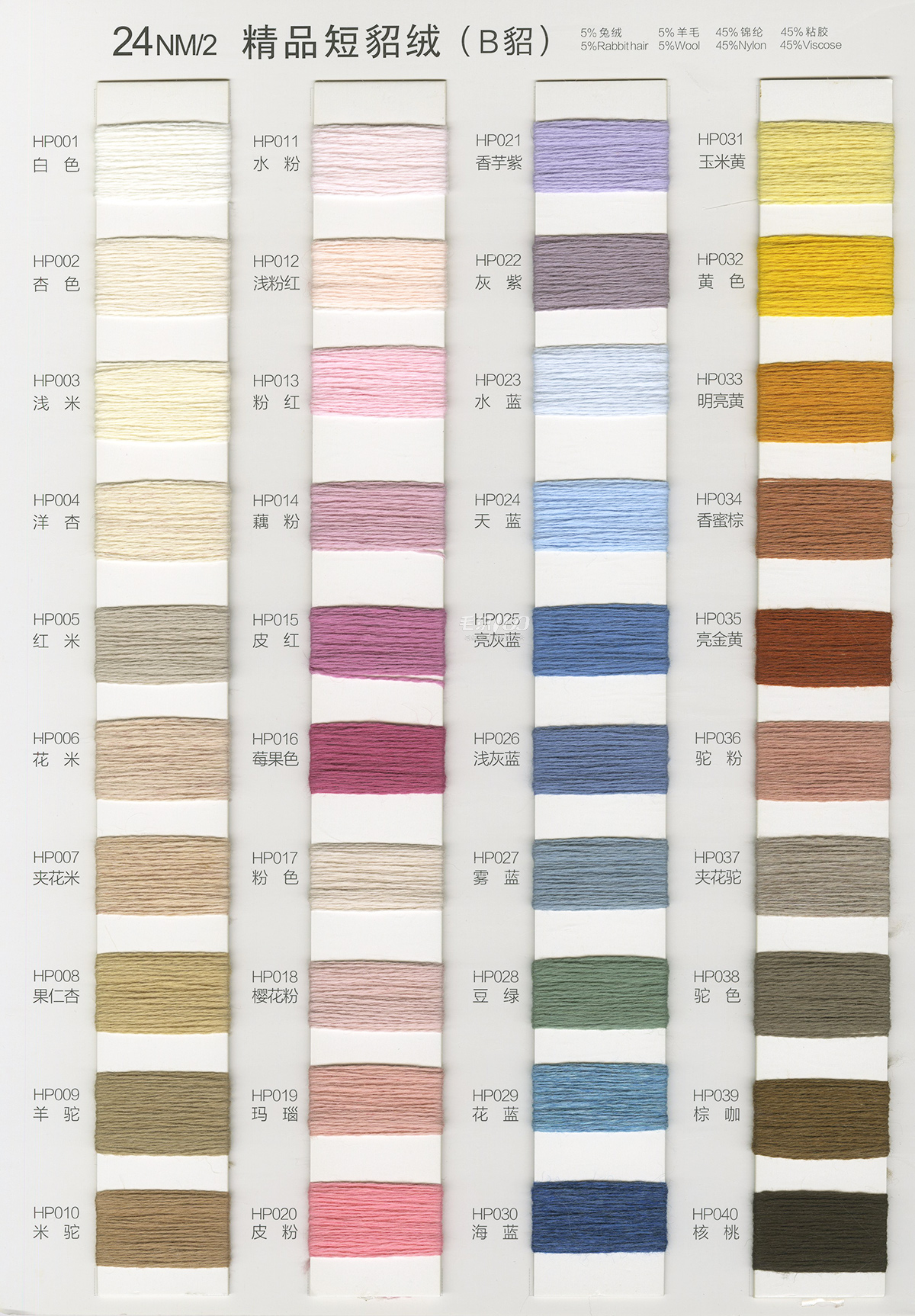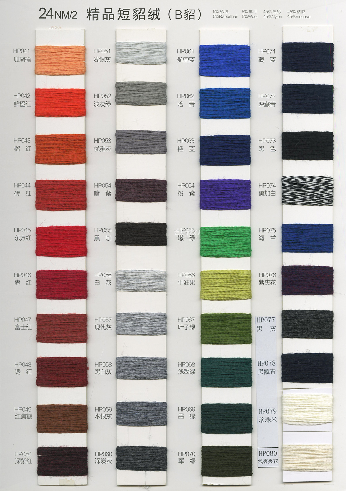 24/2 精品短貂绒A貂、B貂 、24/2精品浣熊绒、24/2走锭澳毛绒、26/2臻品羊毛绒、13.5/2 长毛水貂绒 10% .5% .3% 山羊绒混纺、 28/2 .30/2. 48/2 山羊绒棉、 28/2 丝光膨体五五毛、 24/2 28/2 膨体真三七、 15W:85