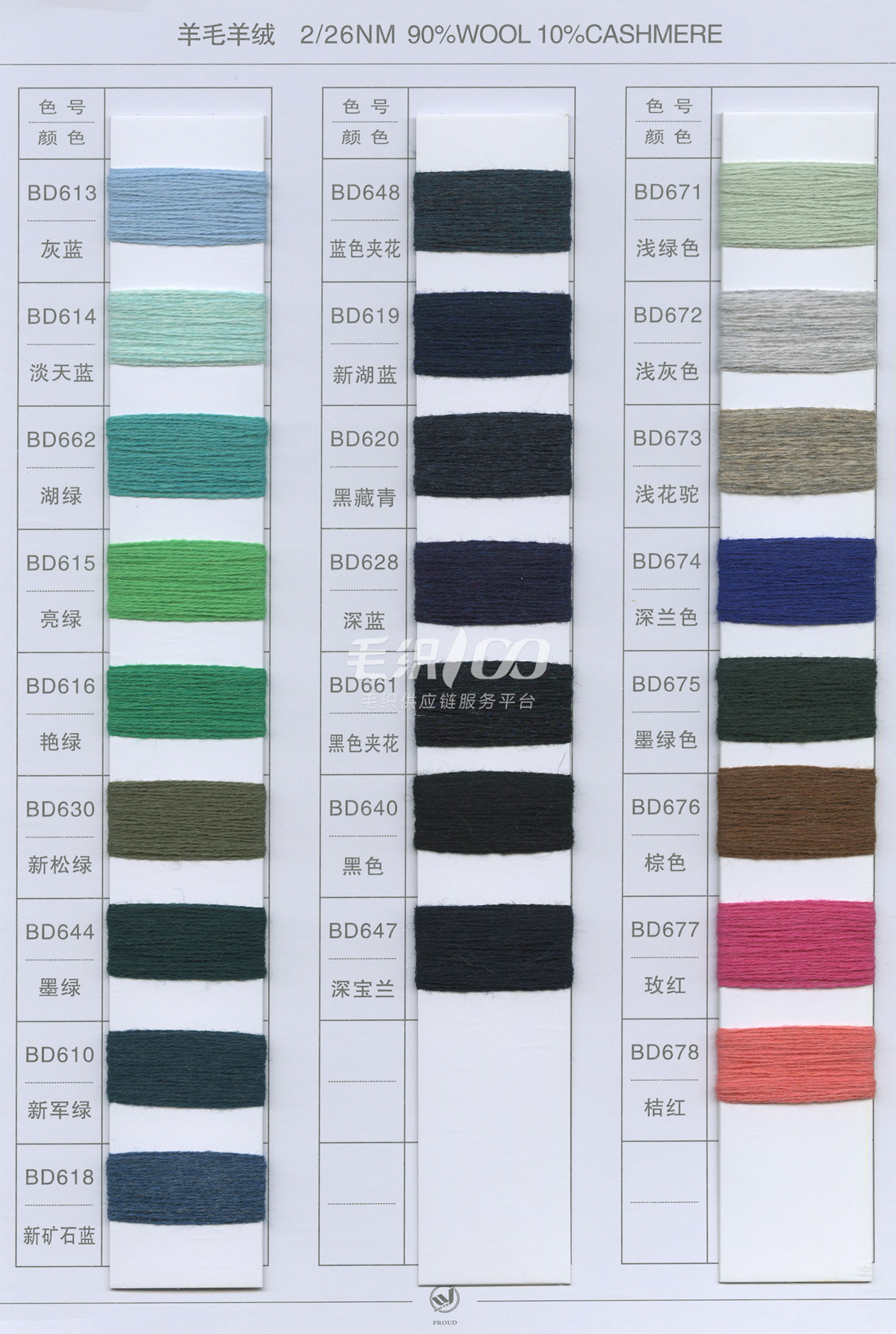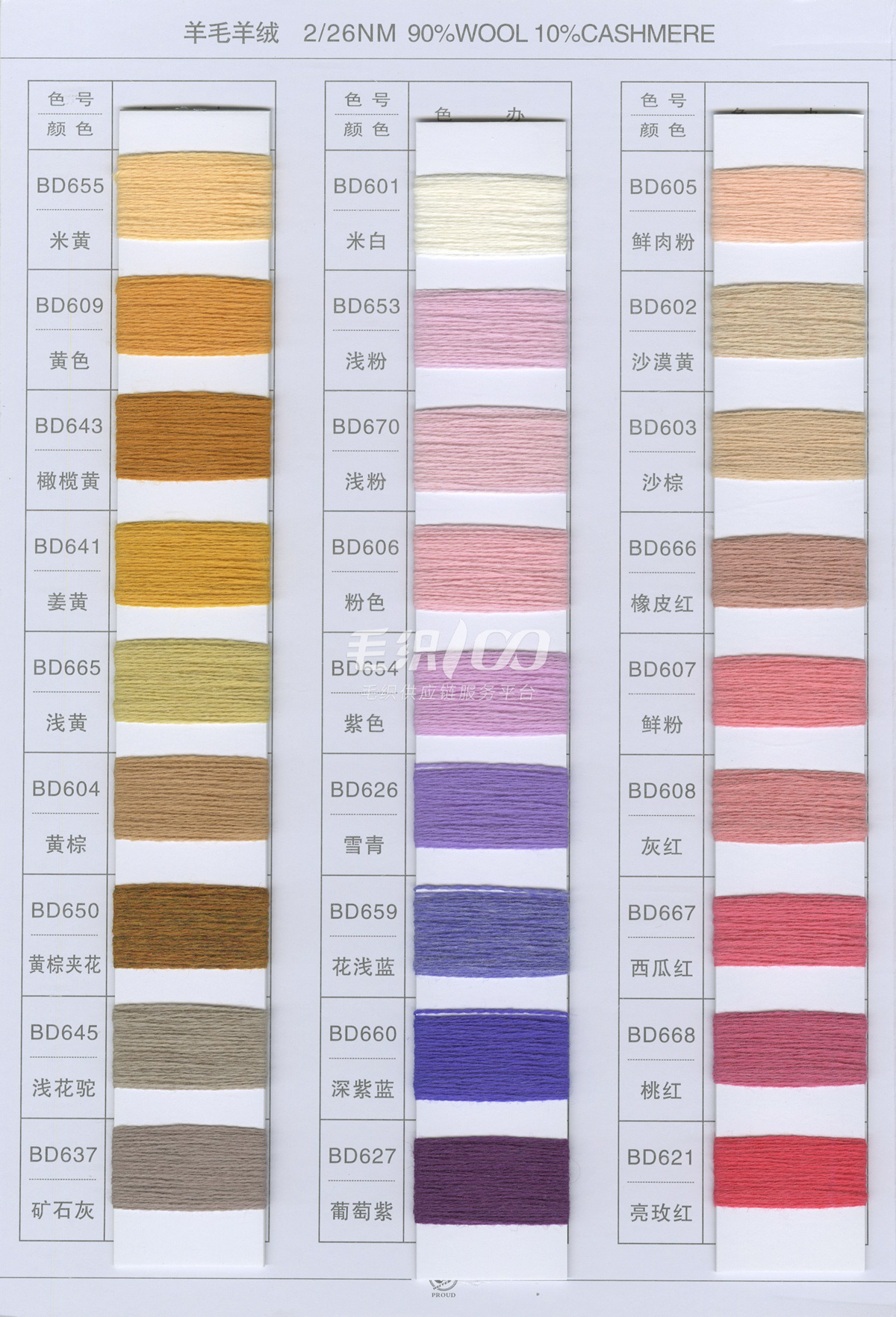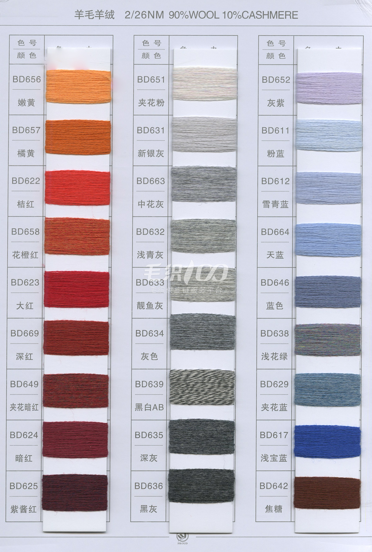半精纺系列:亲肤33羊毛(2/60、2/48)、亲肤100%羊毛(2/17、2/26)、2/26 5羊绒、10羊绒,2//45NM亲肤6羊毛,2/48NM亲肤9羊毛 闪光系列:2/56NM亲肤闪光30羊毛,亲肤闪光6、9羊毛系列 1/45NM亲肤闪光人造丝,1/21NM亲肤闪光幻雪棉, 1/21NM亲肤闪光GN系列 2/48NM亲肤恒丽绒 金银丝系列 1/360 GJ丝柔金银丝 1/254 GTXT超柔金银丝 AK超细 MH常规 花式纱