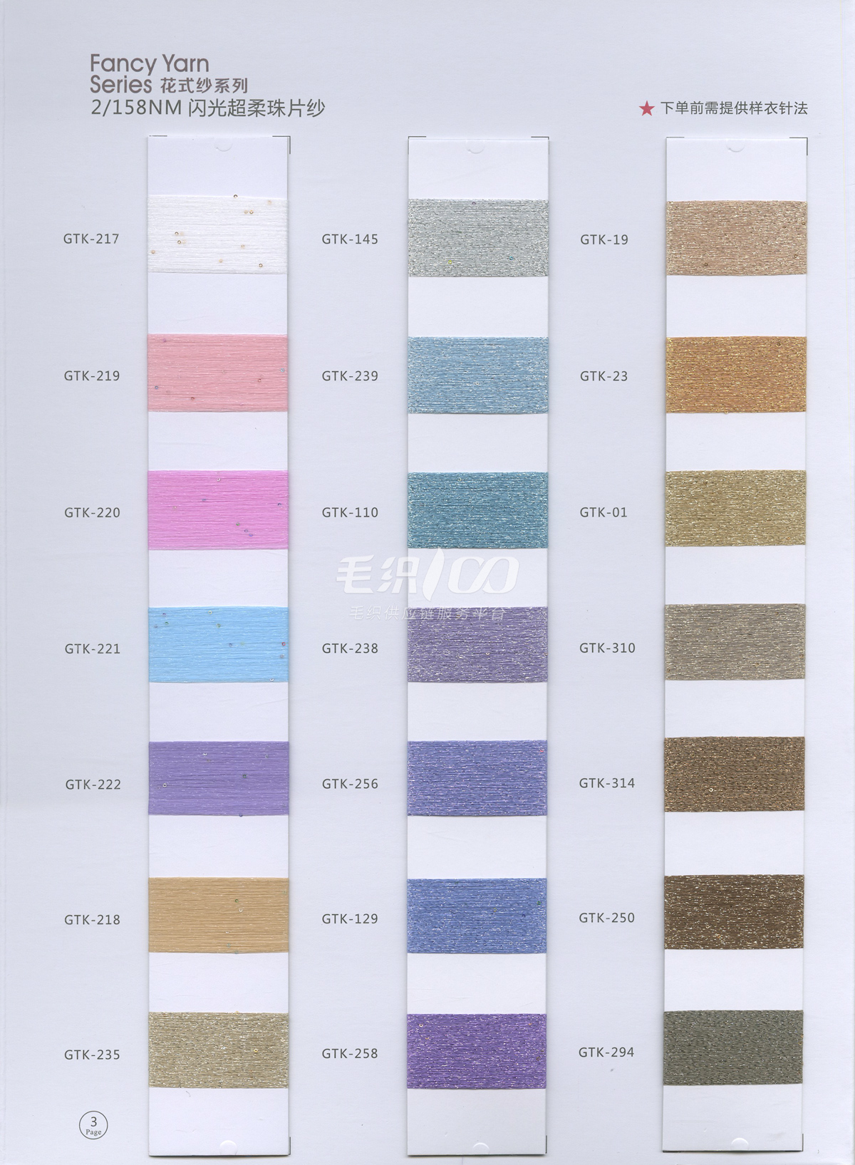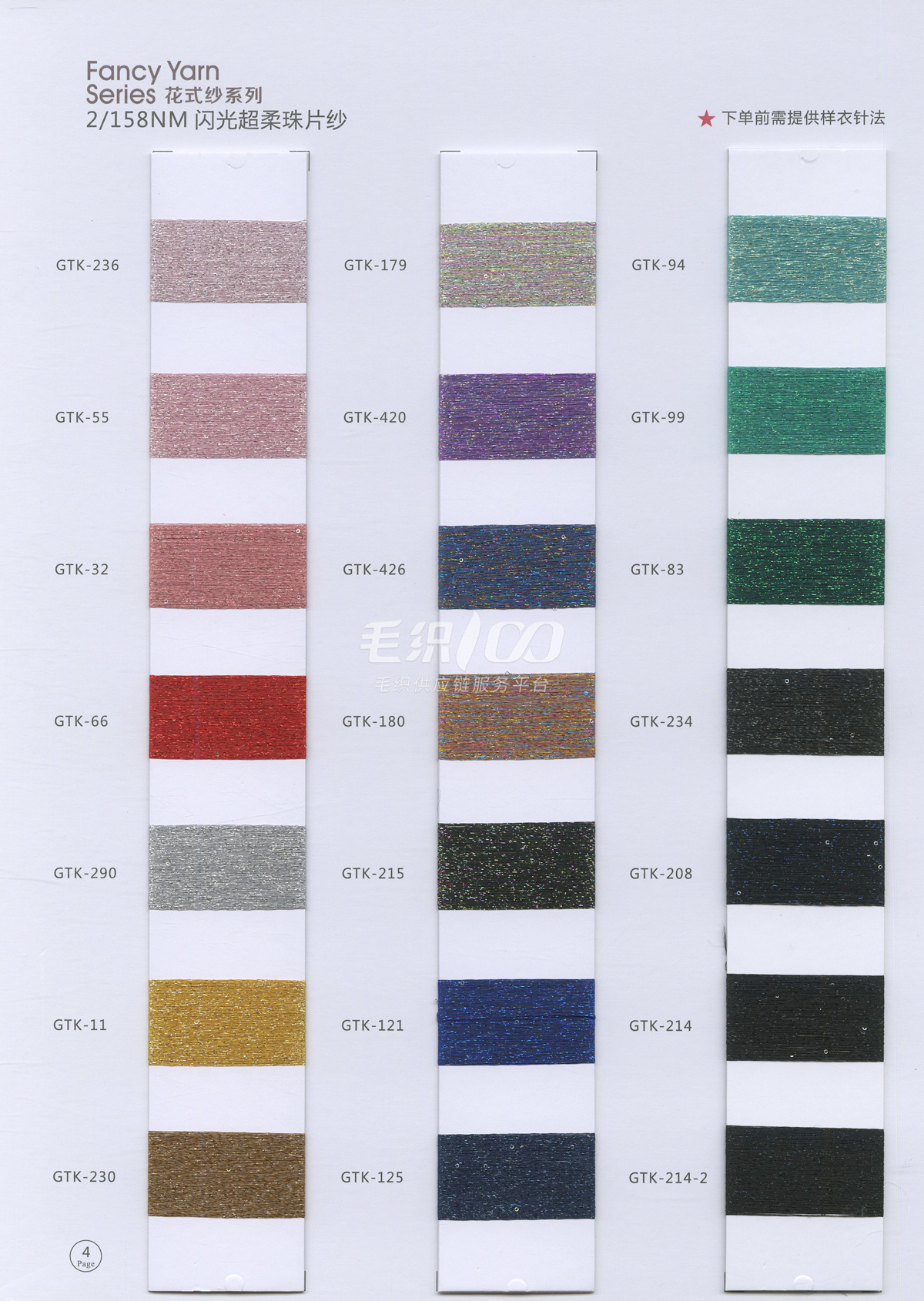 半精纺系列:亲肤33羊毛(2/60、2/48)、亲肤100%羊毛(2/17、2/26)、2/26 5羊绒、10羊绒,2//45NM亲肤6羊毛,2/48NM亲肤9羊毛 闪光系列:2/56NM亲肤闪光30羊毛,亲肤闪光6、9羊毛系列 1/45NM亲肤闪光人造丝,1/21NM亲肤闪光幻雪棉, 1/21NM亲肤闪光GN系列 2/48NM亲肤恒丽绒 金银丝系列 1/360 GJ丝柔金银丝 1/254 GTXT超柔金银丝 AK超细 MH常规 花式纱