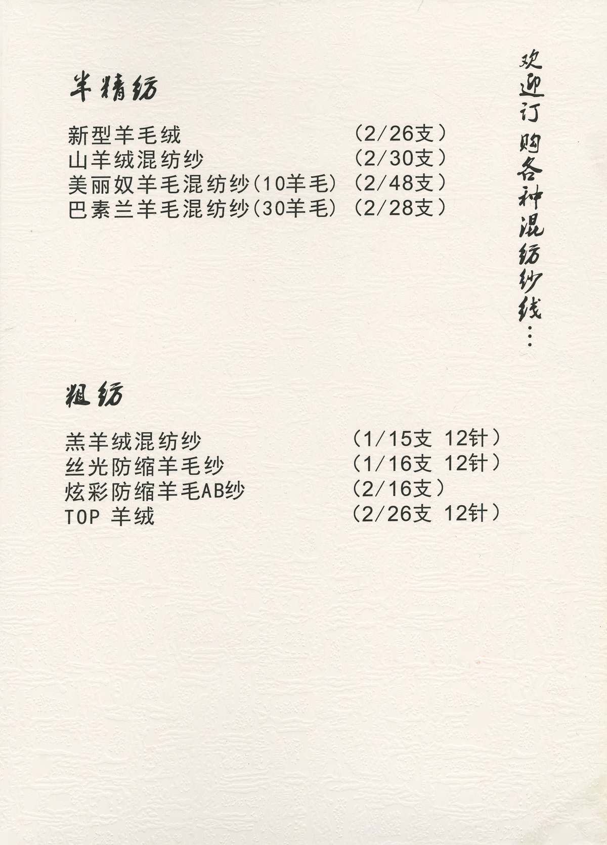 2/26NM克什米尔,2/26NM新型羊毛绒,2/30NM山羊绒混纺,1/16NM珠片纱 ,1/15NM羔羊绒混纺纱,2/13NM澳羊毛,2/28NM巴素兰羊毛混纺,1/16NM 丝光防缩羊仔毛,2/24NM狐狸绒,2/16NM 丝光防缩羊仔毛幻彩纱,2/24NM 精品澳毛绒,2