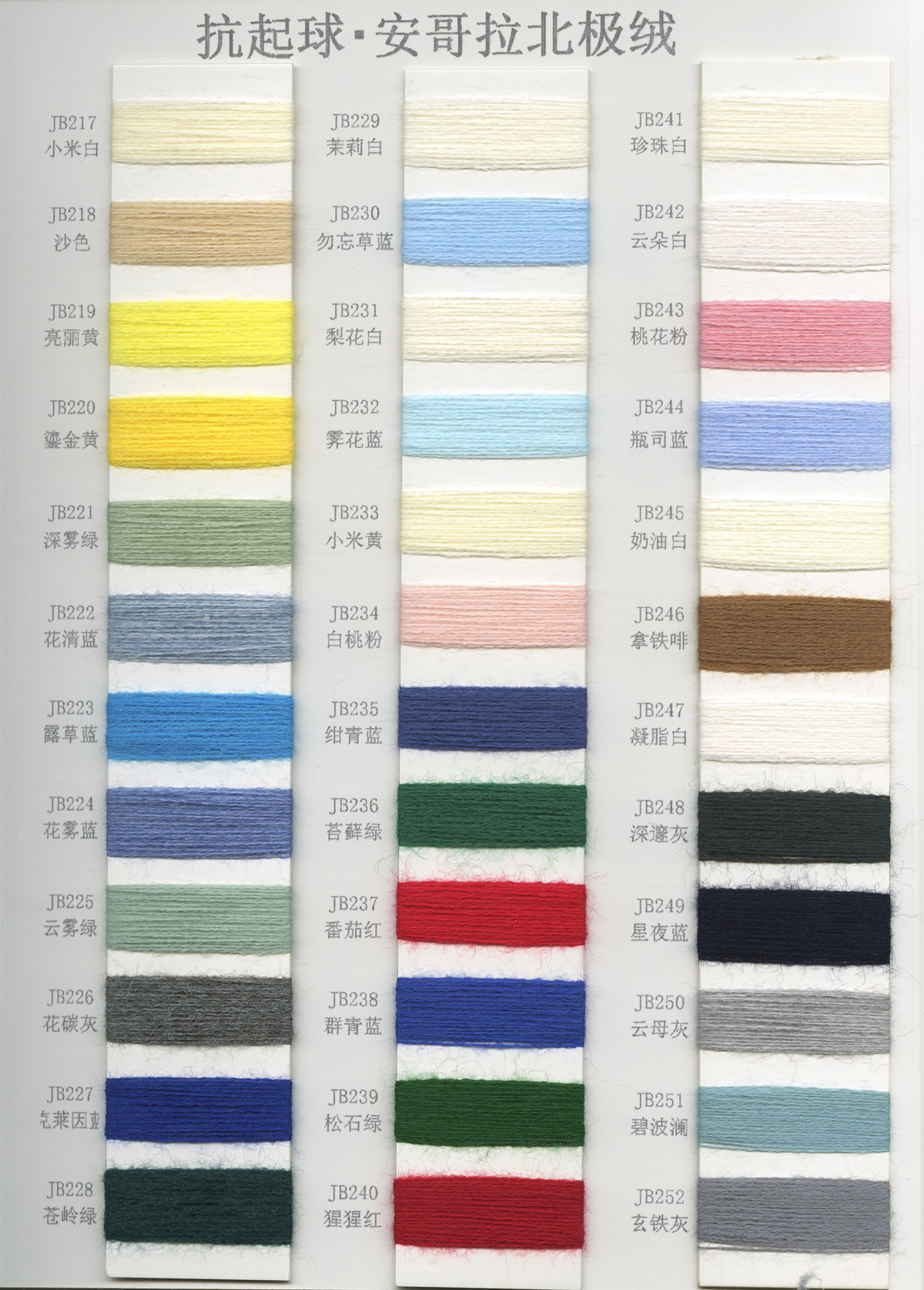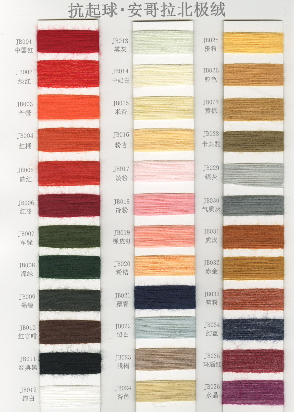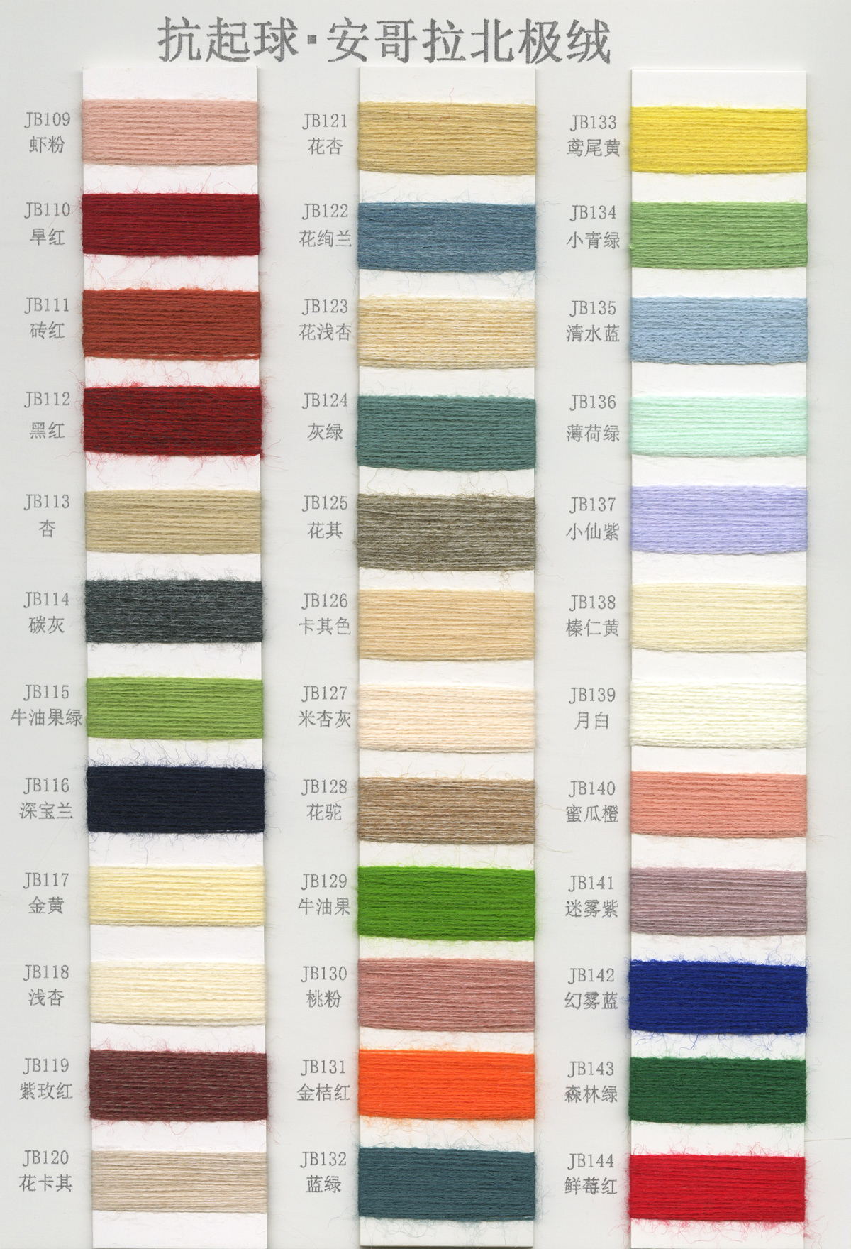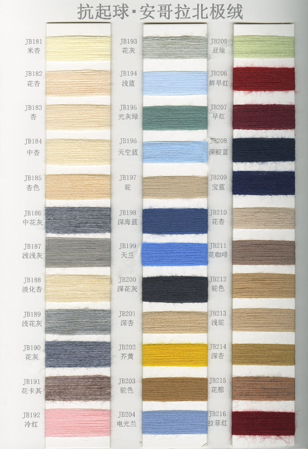 6/1维丝可喷毛绒、14/1雅克牛绒、5.5/1雪花骆马绒、3.5/1绚丽喷毛绒、8/1羊驼喷毛绒、5.5/1骆马喷毛绒、3.5/1亮彩喷毛绒、15/1迷你羊驼圈圈、14/1纤柔马海圈圈、7.5支马海圈圈纱、13/1羊毛长毛、9.8支骆马长毛、5.5支羊驼长毛、14/1华咔约马海、12/1北美浣熊绒、9/1阿拉善骆驼绒、14/2芙尔丽绒、6/2新丝丽绒、2/16南非再生驼绒
