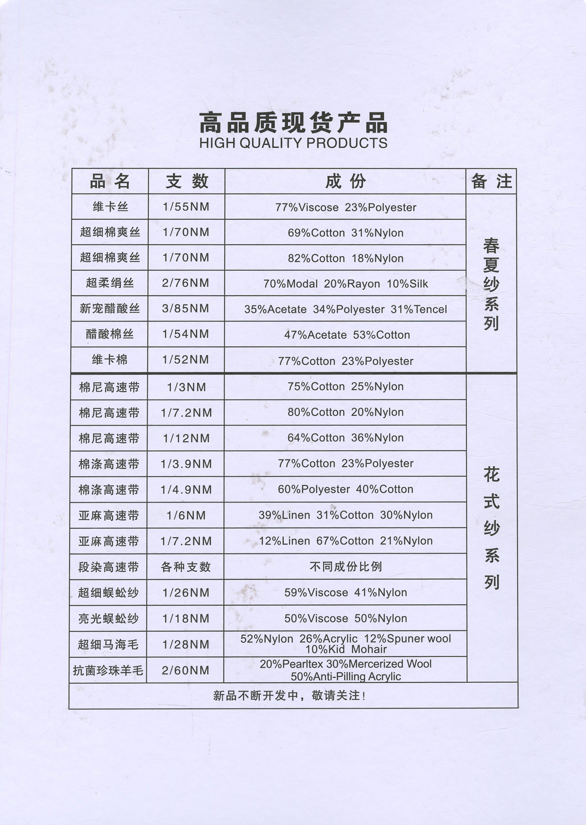 粗纺、半精纺纱纱,有羊绒羊毛混纺纱、全羊毛,高中低各种比例羊毛混纺、水溶羊毛,棉及棉毛绒,天丝、加葱加珠纱。