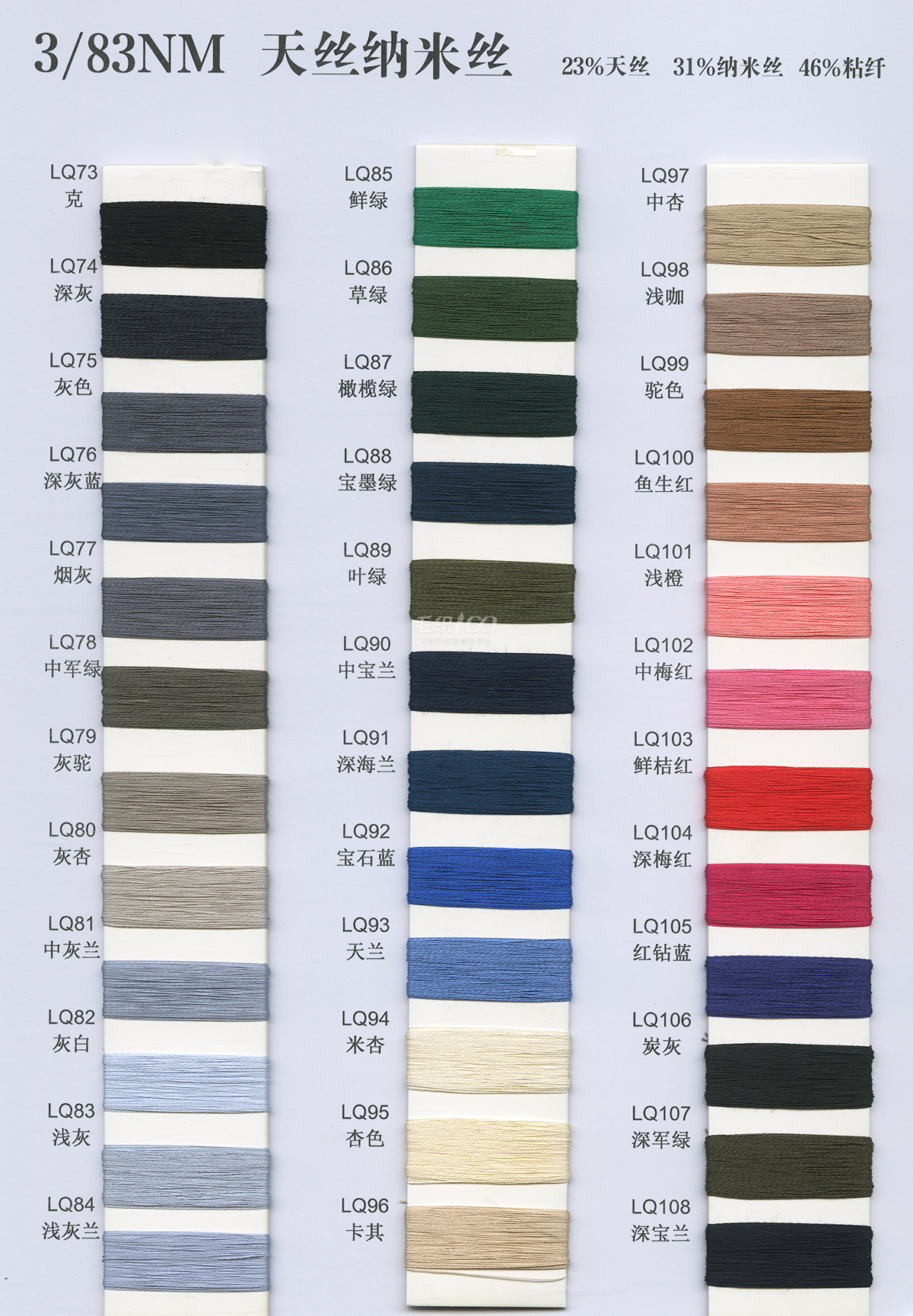 32s/2& 40s/2& 60s/2全精梳棉高捻棉色纱;32s/2&40s/2长绒棉(PIMA);立体棉 2/36&2/51&2/68超柔长绒棉; NM2/28&2/32&2/48 棉羊绒 ; NM2/28特级仿羊绒澳毛纱; 32s/2兰精A100天丝; 32s/2兰精莫代尔/棉;