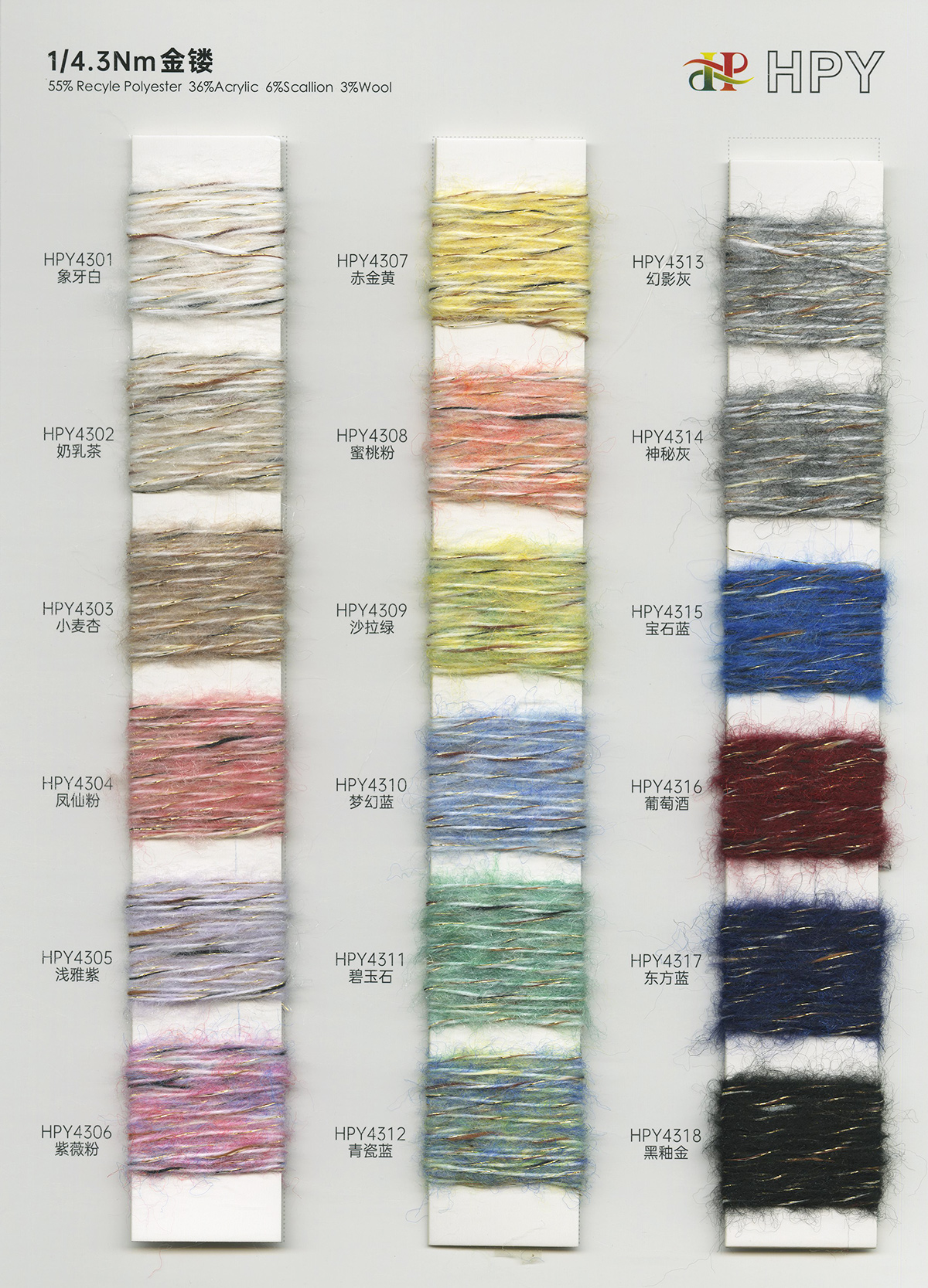 6/1维丝可喷毛绒、14/1雅克牛绒、5.5/1雪花骆马绒、3.5/1绚丽喷毛绒、8/1羊驼喷毛绒、5.5/1骆马喷毛绒、3.5/1亮彩喷毛绒、15/1迷你羊驼圈圈、14/1纤柔马海圈圈、7.5支马海圈圈纱、13/1羊毛长毛、9.8支骆马长毛、5.5支羊驼长毛、14/1华咔约马海、12/1北美浣熊绒、9/1阿拉善骆驼绒、14/2芙尔丽绒、6/2新丝丽绒、2/16南非再生驼绒