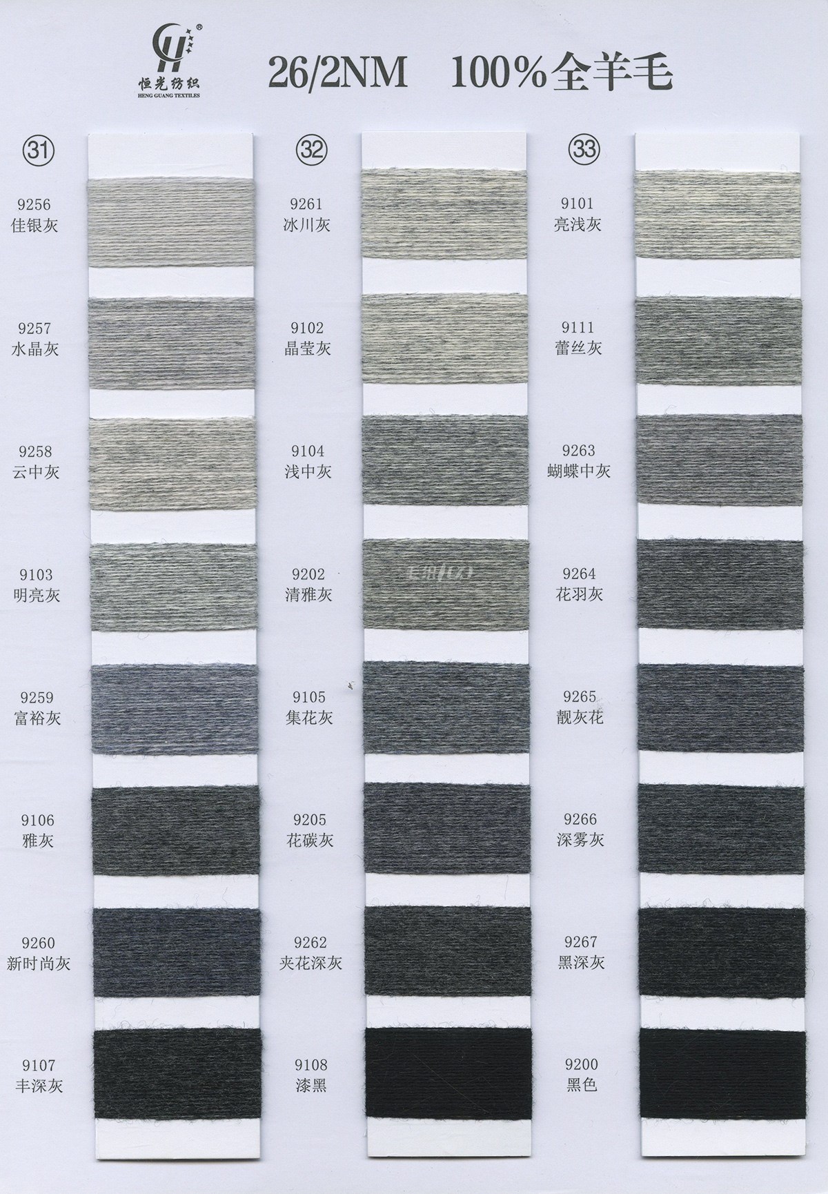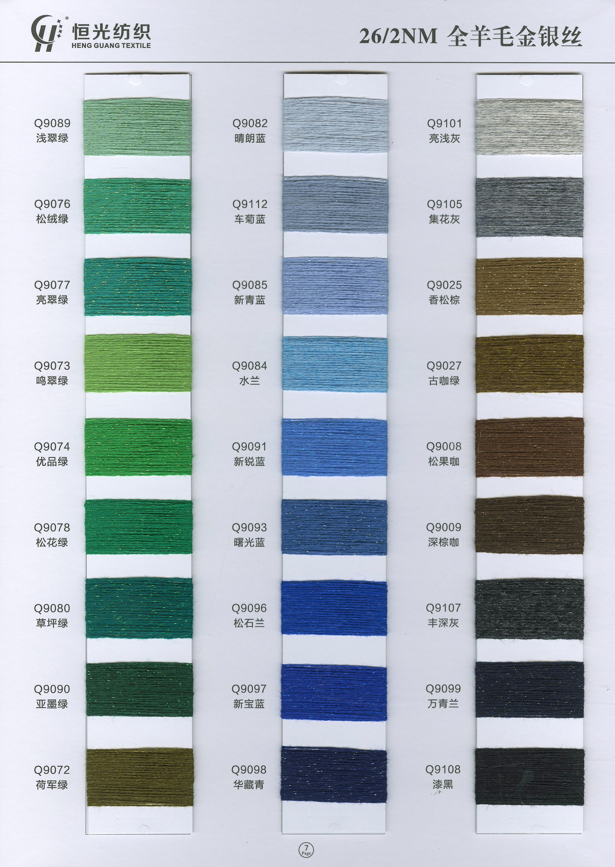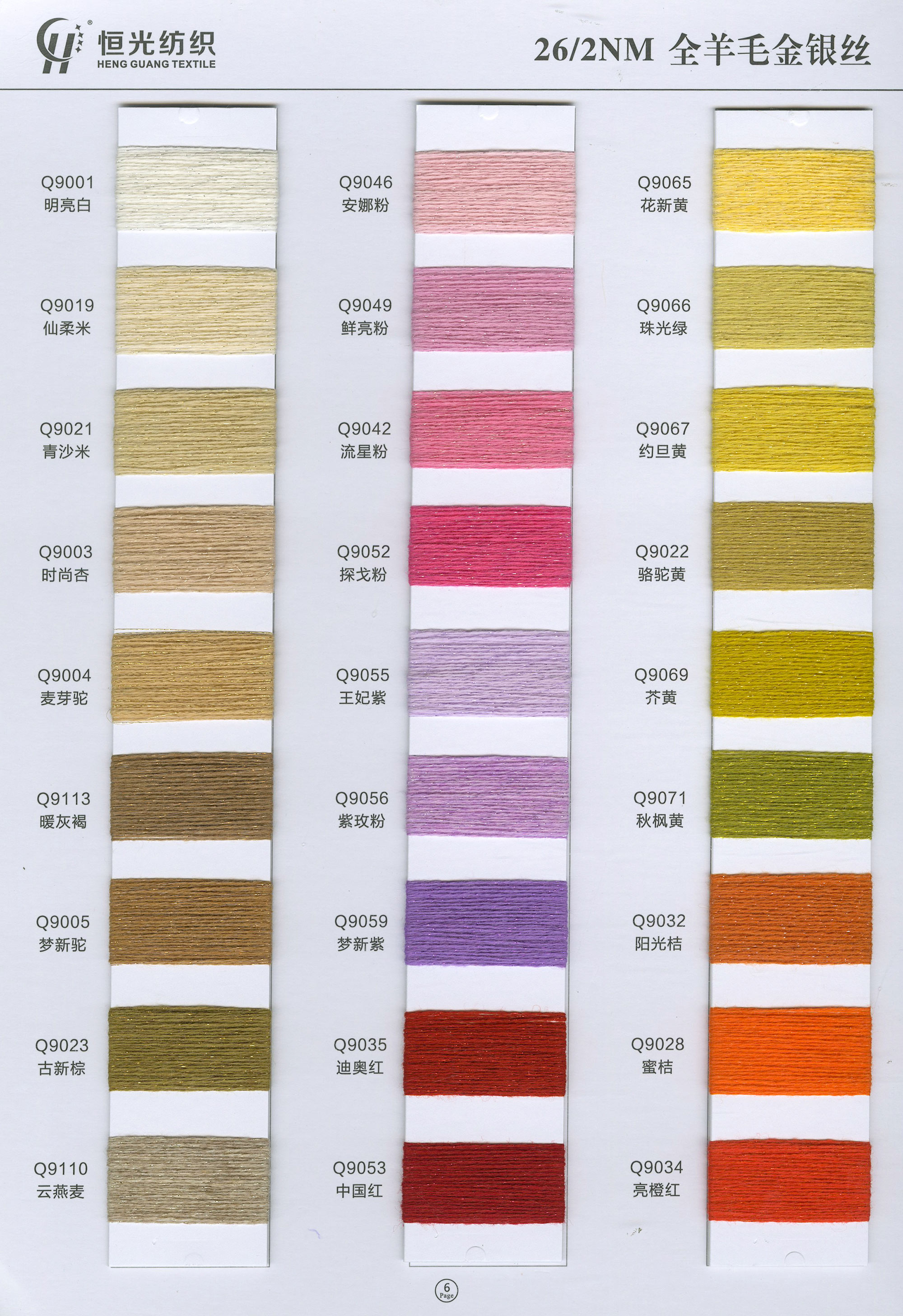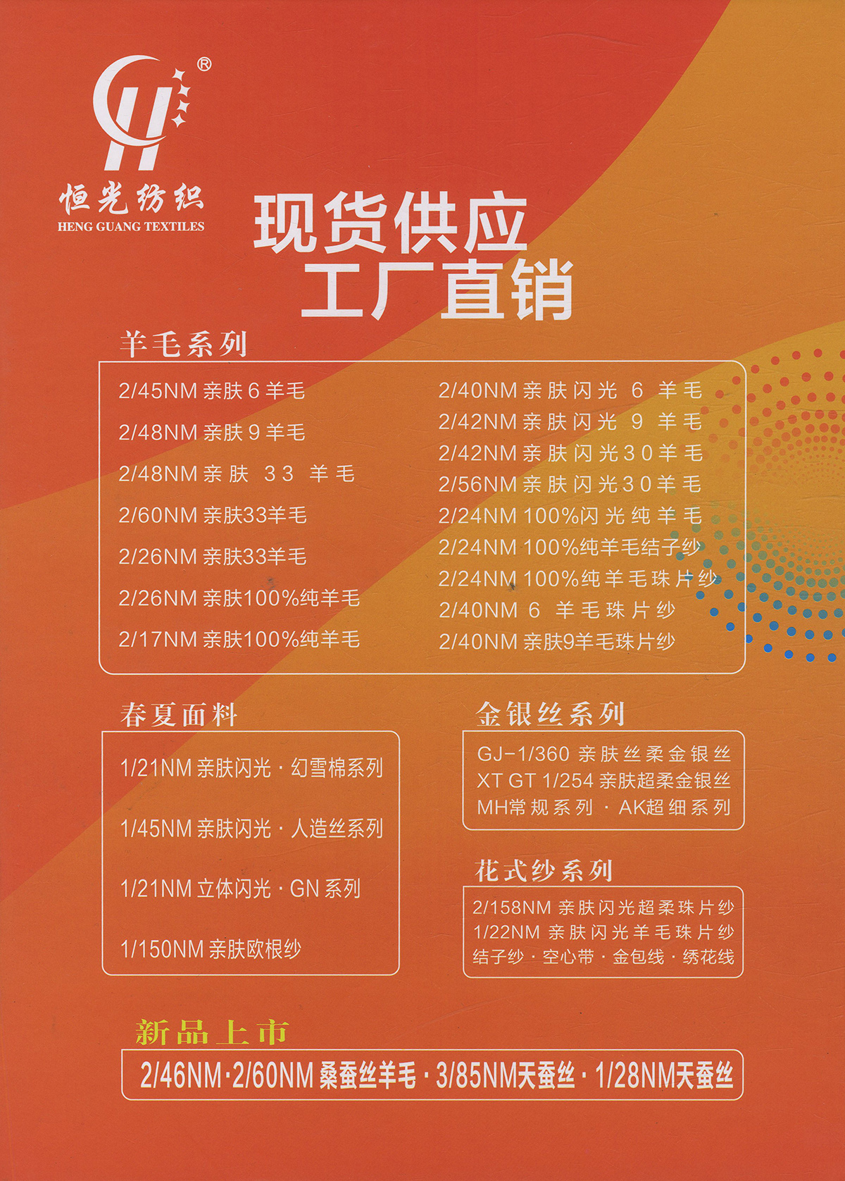 半精纺系列:亲肤33羊毛(2/60、2/48)、亲肤100%羊毛(2/17、2/26)、2/26 5羊绒、10羊绒,2//45NM亲肤6羊毛,2/48NM亲肤9羊毛 闪光系列:2/56NM亲肤闪光30羊毛,亲肤闪光6、9羊毛系列 1/45NM亲肤闪光人造丝,1/21NM亲肤闪光幻雪棉, 1/21NM亲肤闪光GN系列 2/48NM亲肤恒丽绒 金银丝系列 1/360 GJ丝柔金银丝 1/254 GTXT超柔金银丝 AK超细 MH常规 花式纱