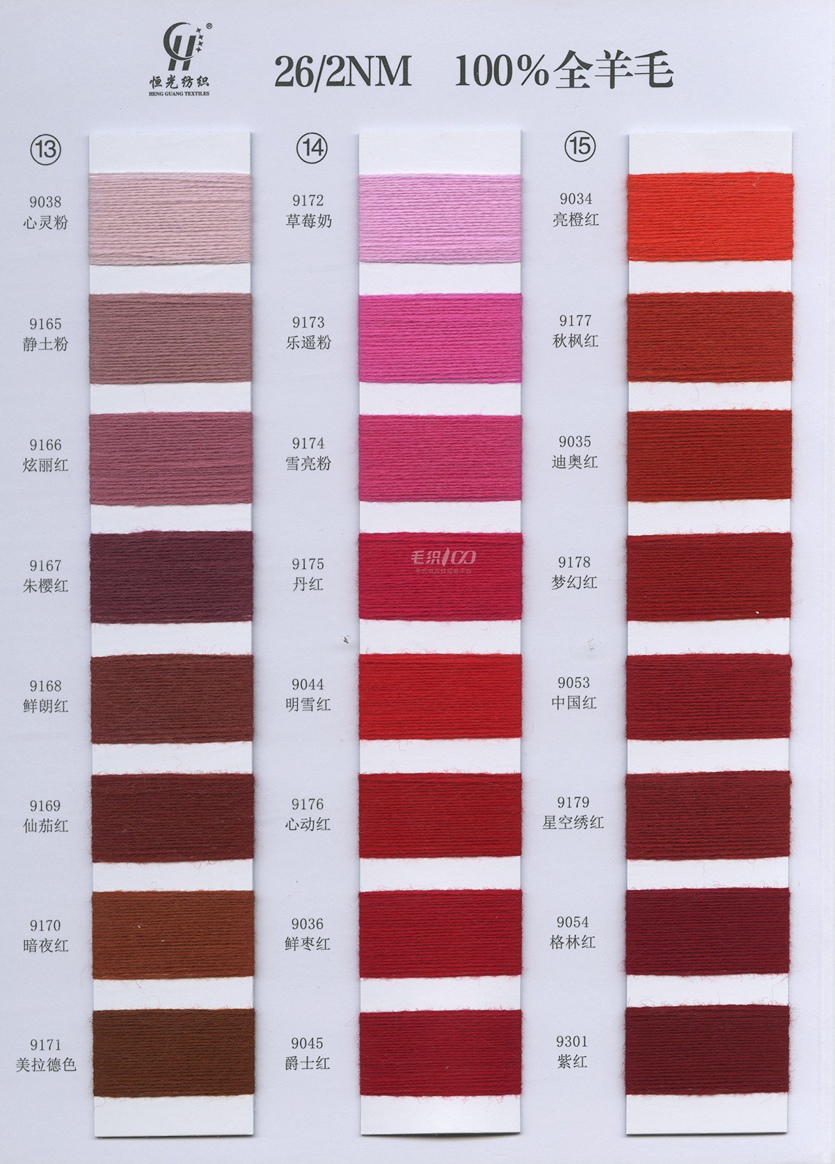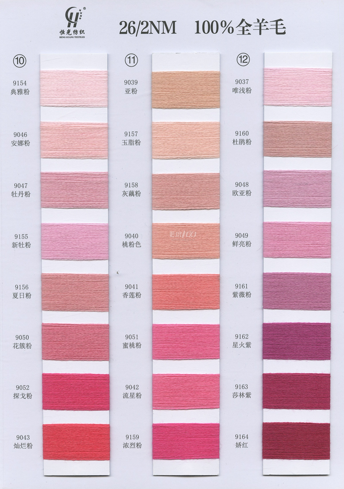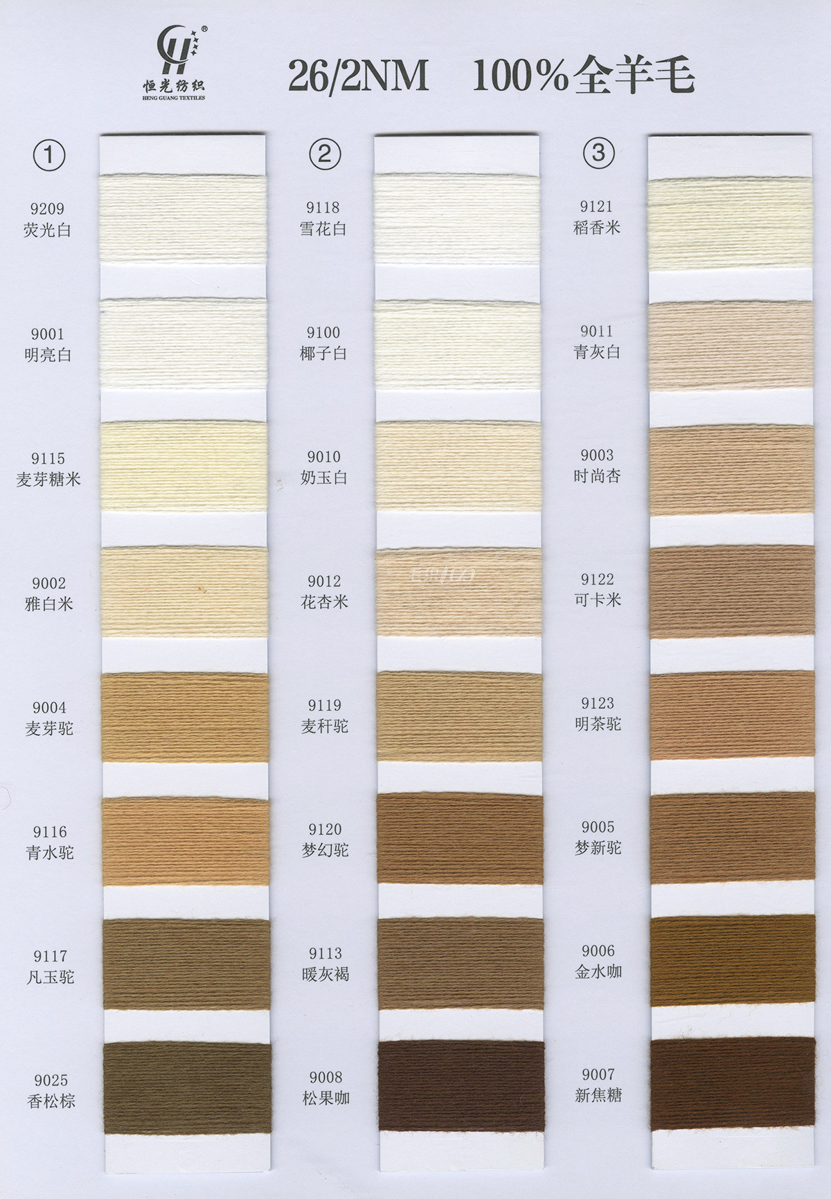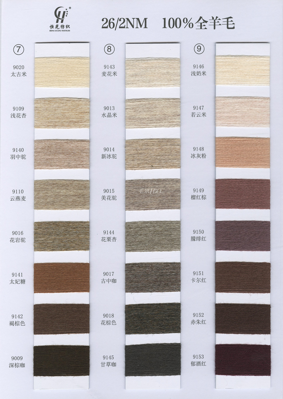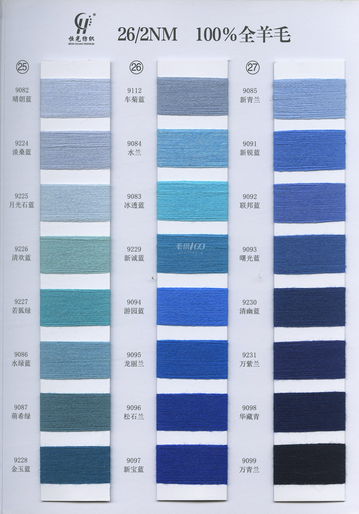半精纺系列:亲肤33羊毛(2/60、2/48)、亲肤100%羊毛(2/17、2/26)、2/26 5羊绒、10羊绒,2//45NM亲肤6羊毛,2/48NM亲肤9羊毛 闪光系列:2/56NM亲肤闪光30羊毛,亲肤闪光6、9羊毛系列 1/45NM亲肤闪光人造丝,1/21NM亲肤闪光幻雪棉, 1/21NM亲肤闪光GN系列 2/48NM亲肤恒丽绒 金银丝系列 1/360 GJ丝柔金银丝 1/254 GTXT超柔金银丝 AK超细 MH常规 花式纱
