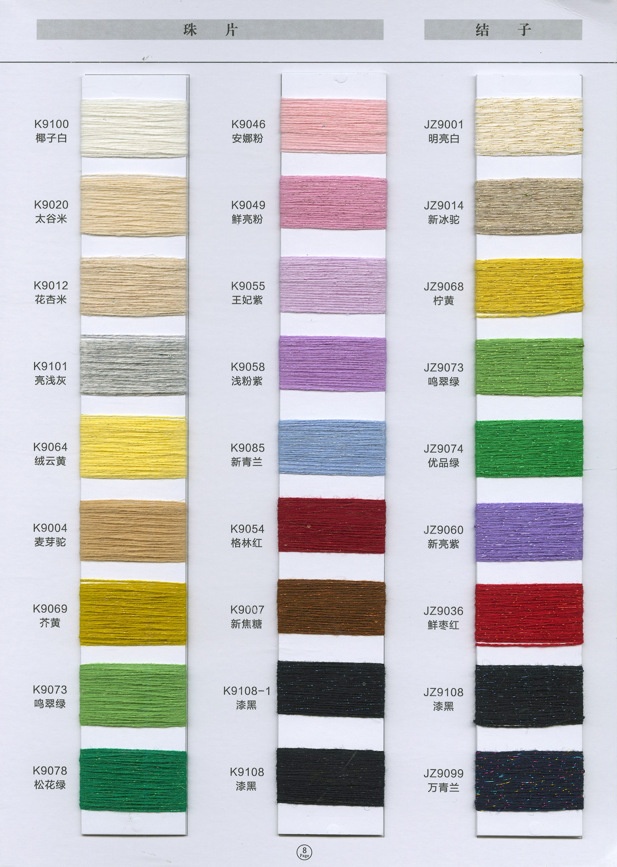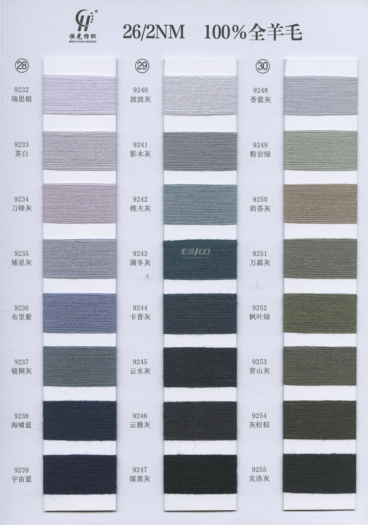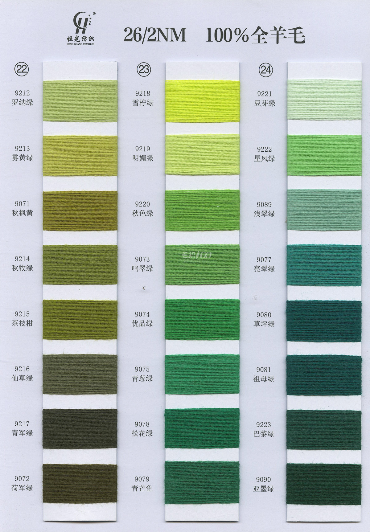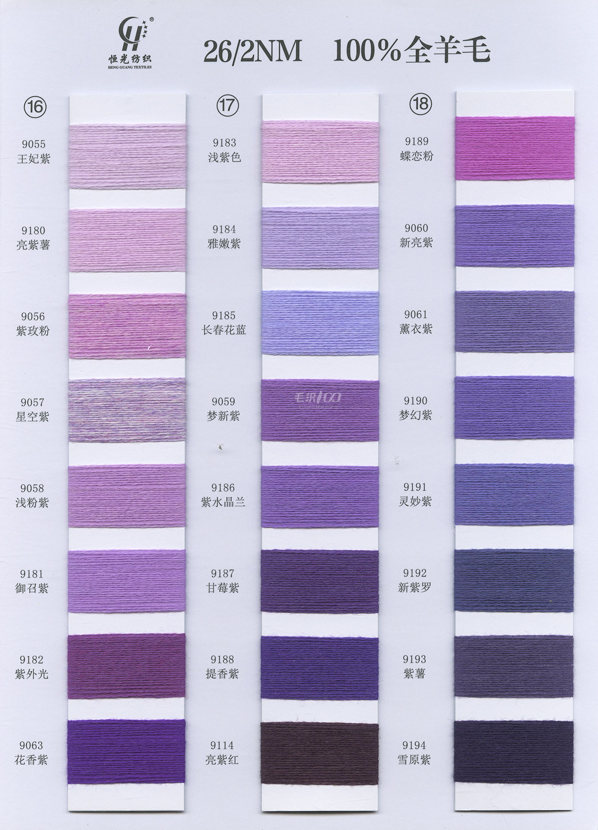 半精纺系列:亲肤33羊毛(2/60、2/48)、亲肤100%羊毛(2/17、2/26)、2/26 5羊绒、10羊绒,2//45NM亲肤6羊毛,2/48NM亲肤9羊毛 闪光系列:2/56NM亲肤闪光30羊毛,亲肤闪光6、9羊毛系列 1/45NM亲肤闪光人造丝,1/21NM亲肤闪光幻雪棉, 1/21NM亲肤闪光GN系列 2/48NM亲肤恒丽绒 金银丝系列 1/360 GJ丝柔金银丝 1/254 GTXT超柔金银丝 AK超细 MH常规 花式纱