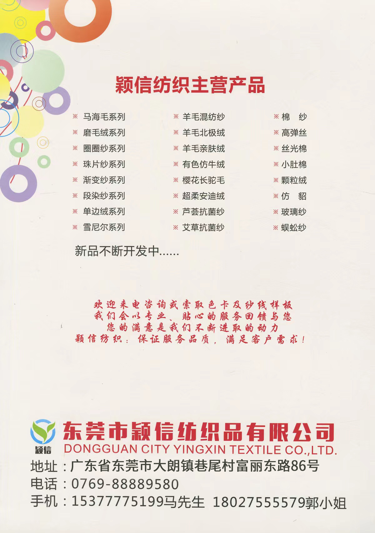 珠片纱系列 彩点纱系列 磨毛绒系列 环保再生系列 抗菌系列 马海毛系列 圈圈纱系列 渐变纱系列 段染系列 羊毛混纺系列 春夏特种纱系列 等各类新型花式纱