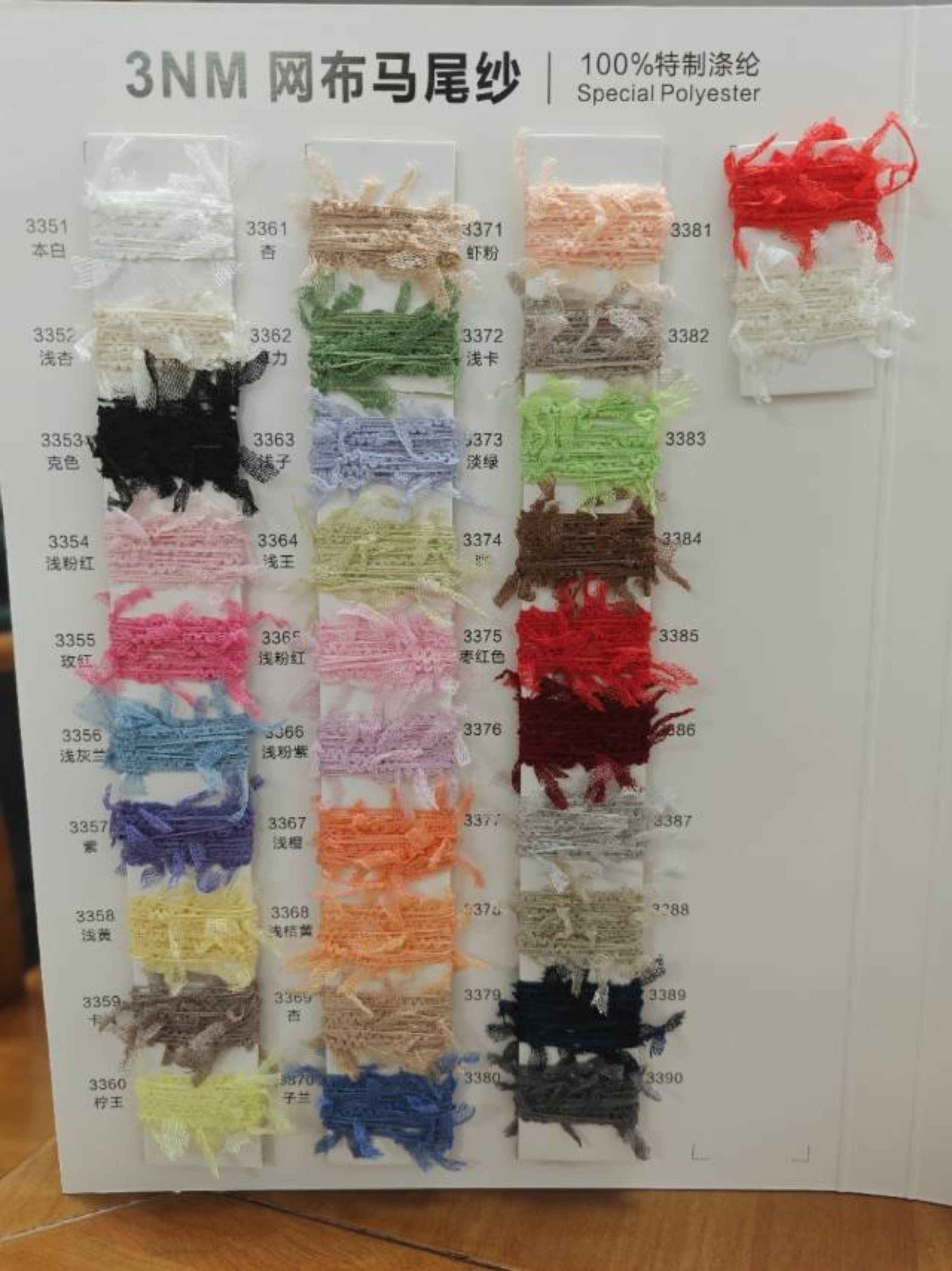 4支涤纶蝴蝶纱,尼龙蝴蝶纱,跳舞纱,牙刷绒,半边绒,牙刷纱,中旗纱,灯笼纱,乒乓纱,水结珠,米粉纱,网布马尾,压线网布,网布纱,纸片马尾,纸片纱,玻璃纱,玻璃马尾纱,粒粒绒,中桥纱,各种特种纱等,欢迎来样咨询或定做。(承接各种拼珠片,加捻合股,来版最快当天可交货)