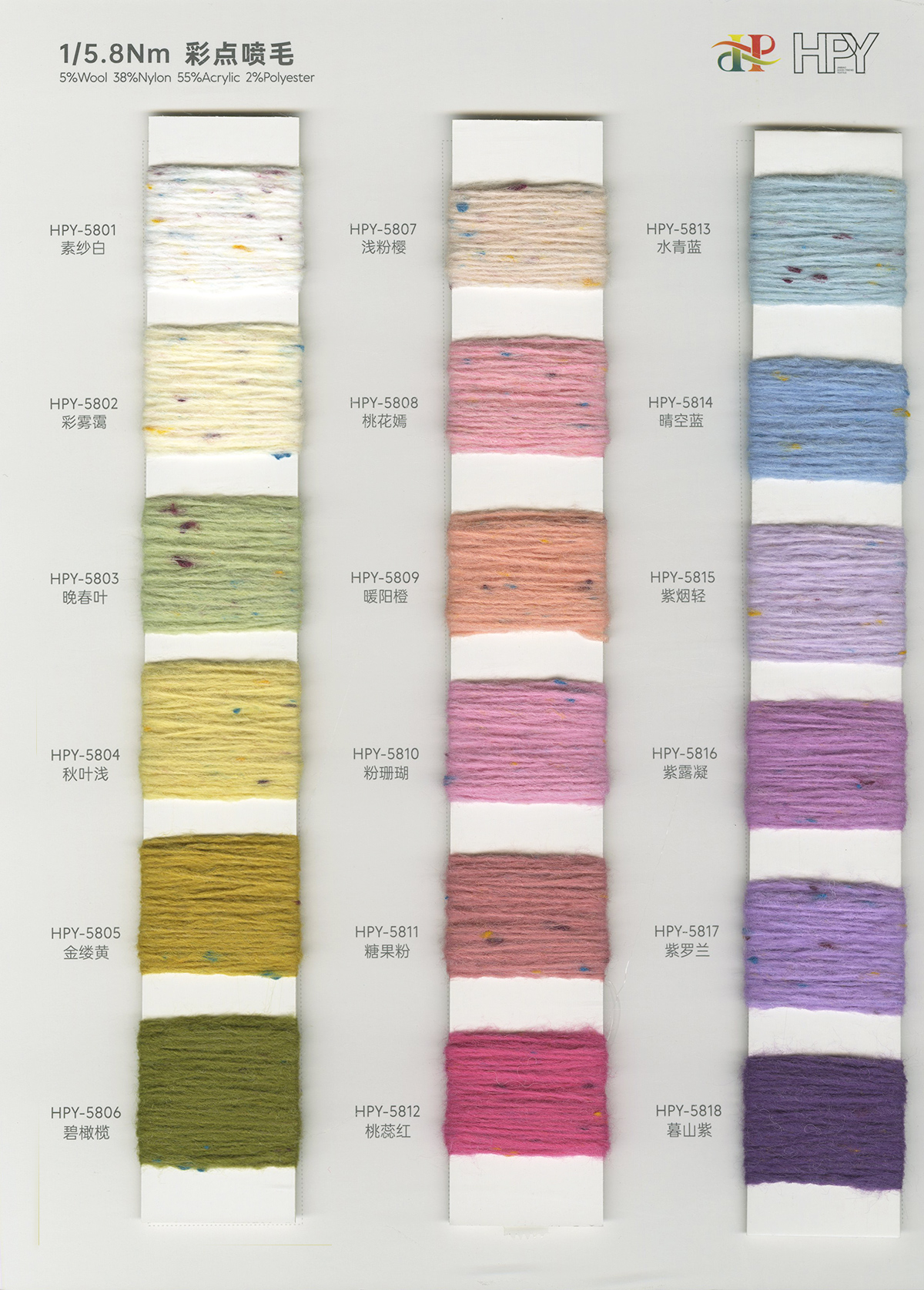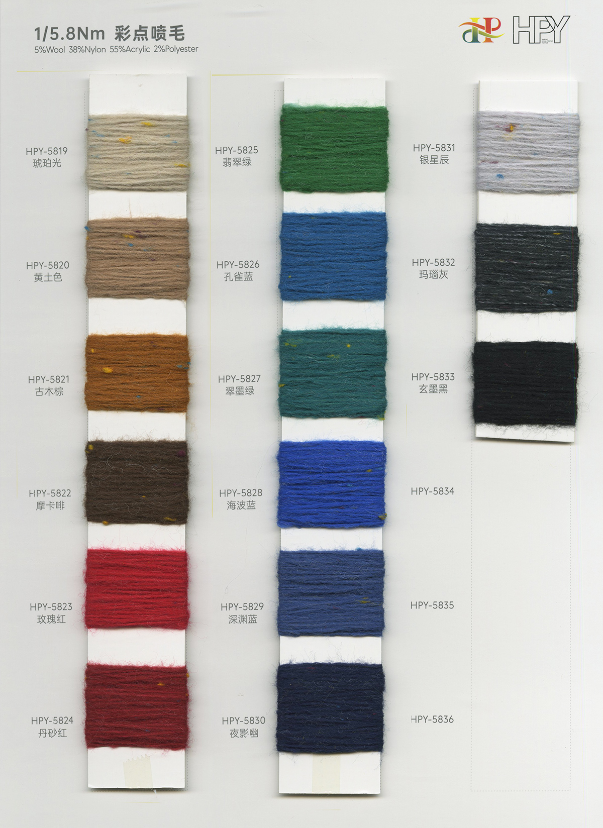 6/1维丝可喷毛绒、14/1雅克牛绒、5.5/1雪花骆马绒、3.5/1绚丽喷毛绒、8/1羊驼喷毛绒、5.5/1骆马喷毛绒、3.5/1亮彩喷毛绒、15/1迷你羊驼圈圈、14/1纤柔马海圈圈、7.5支马海圈圈纱、13/1羊毛长毛、9.8支骆马长毛、5.5支羊驼长毛、14/1华咔约马海、12/1北美浣熊绒、9/1阿拉善骆驼绒、14/2芙尔丽绒、6/2新丝丽绒、2/16南非再生驼绒