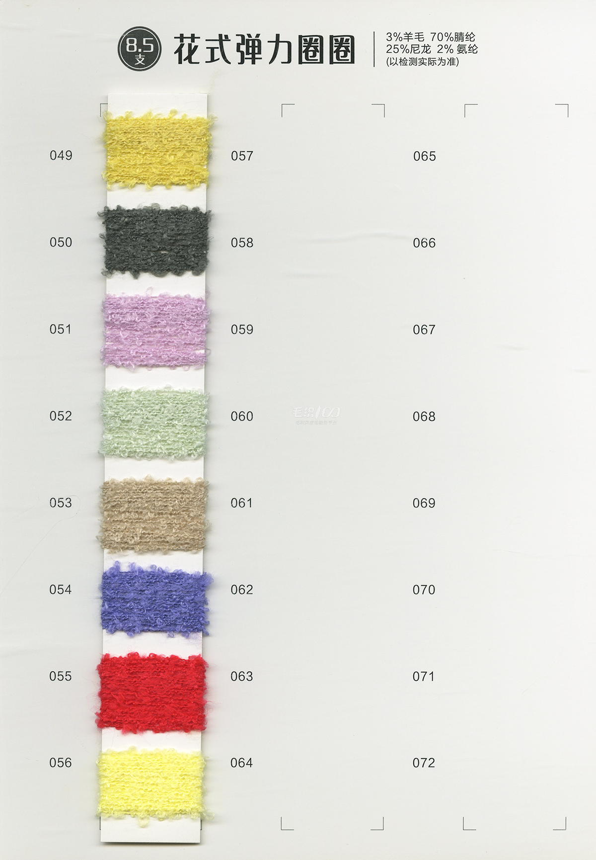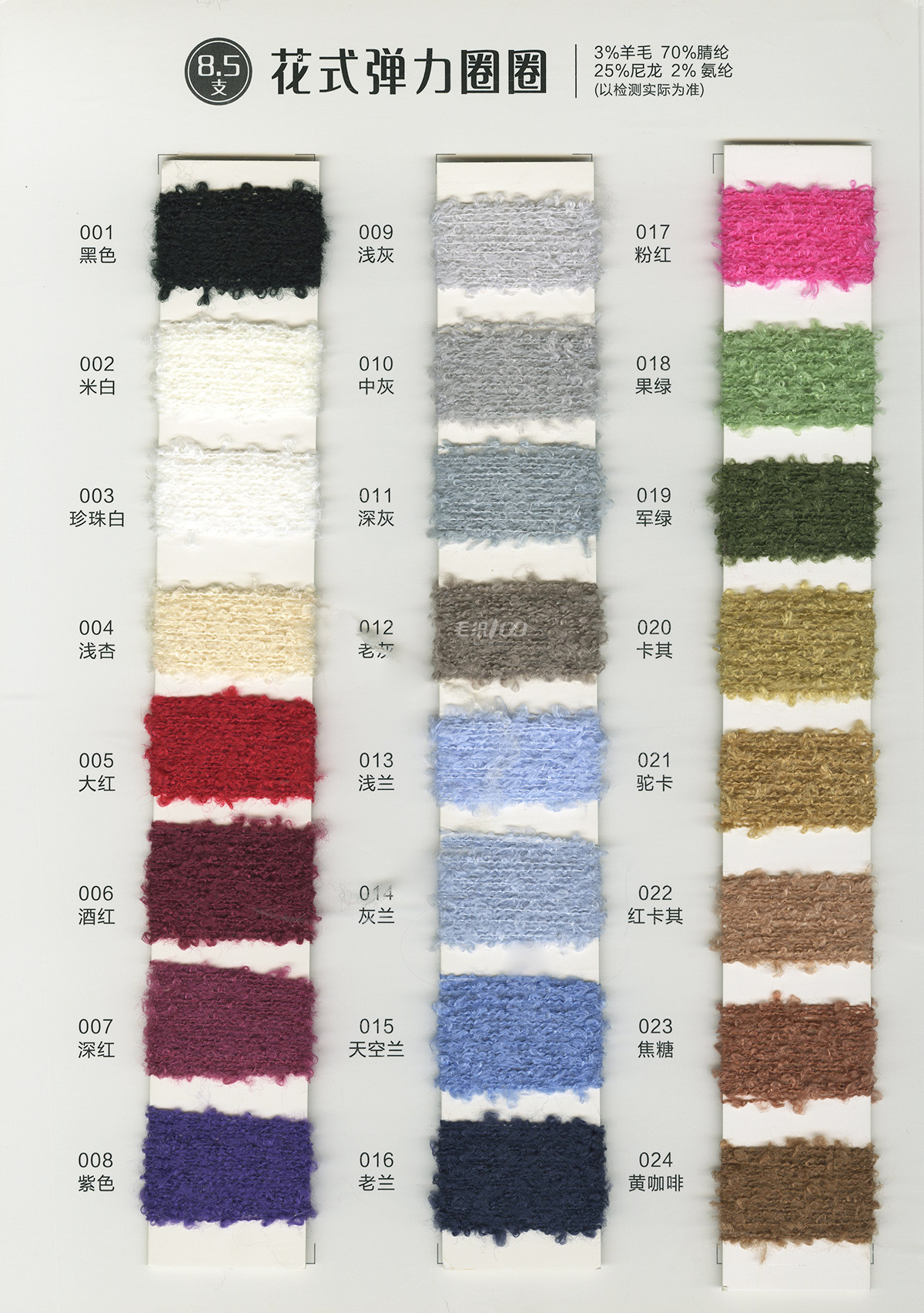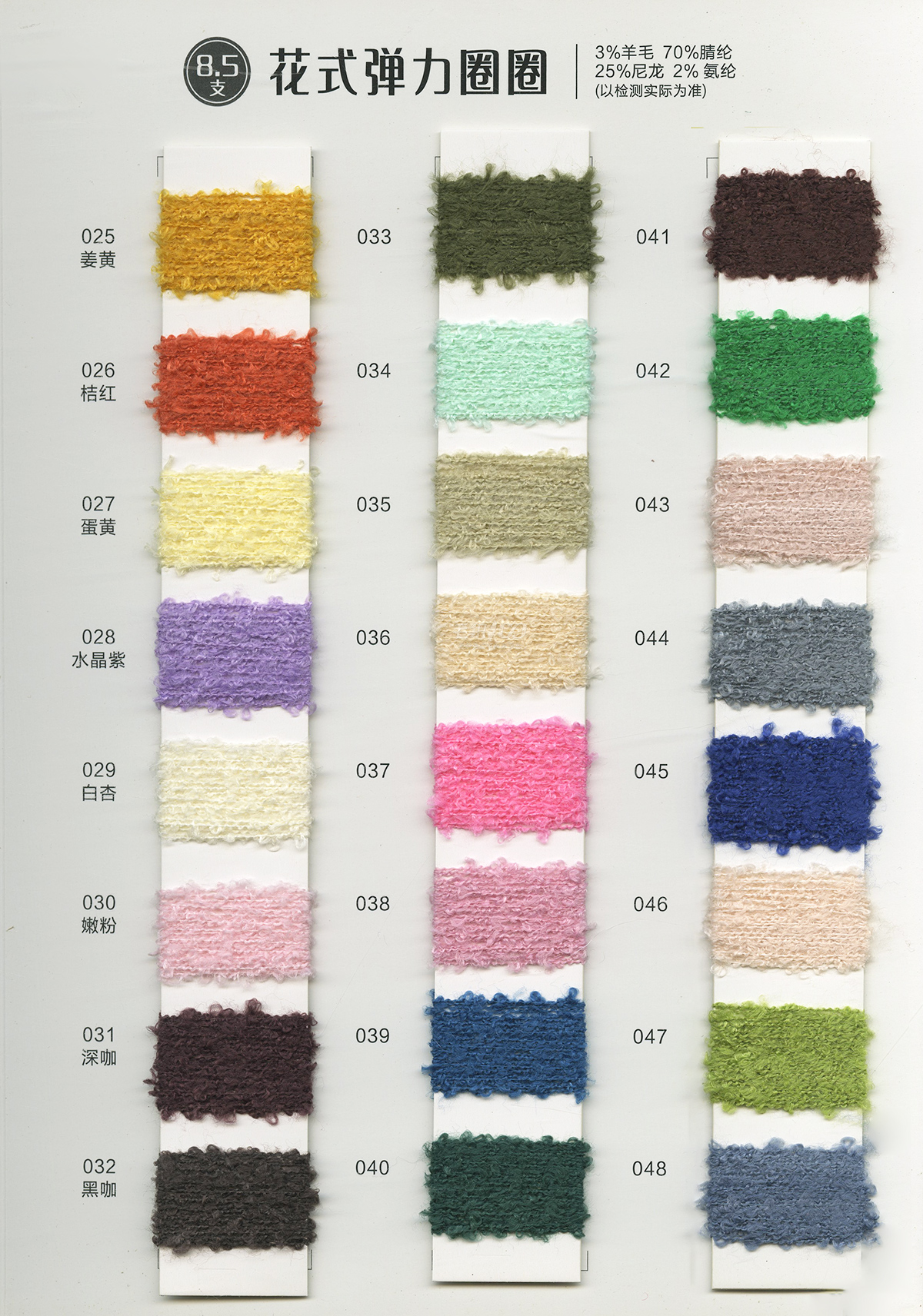 珠片纱系列 彩点纱系列 磨毛绒系列 环保再生系列 抗菌系列 马海毛系列 圈圈纱系列 渐变纱系列 段染系列 羊毛混纺系列 春夏特种纱系列 等各类新型花式纱