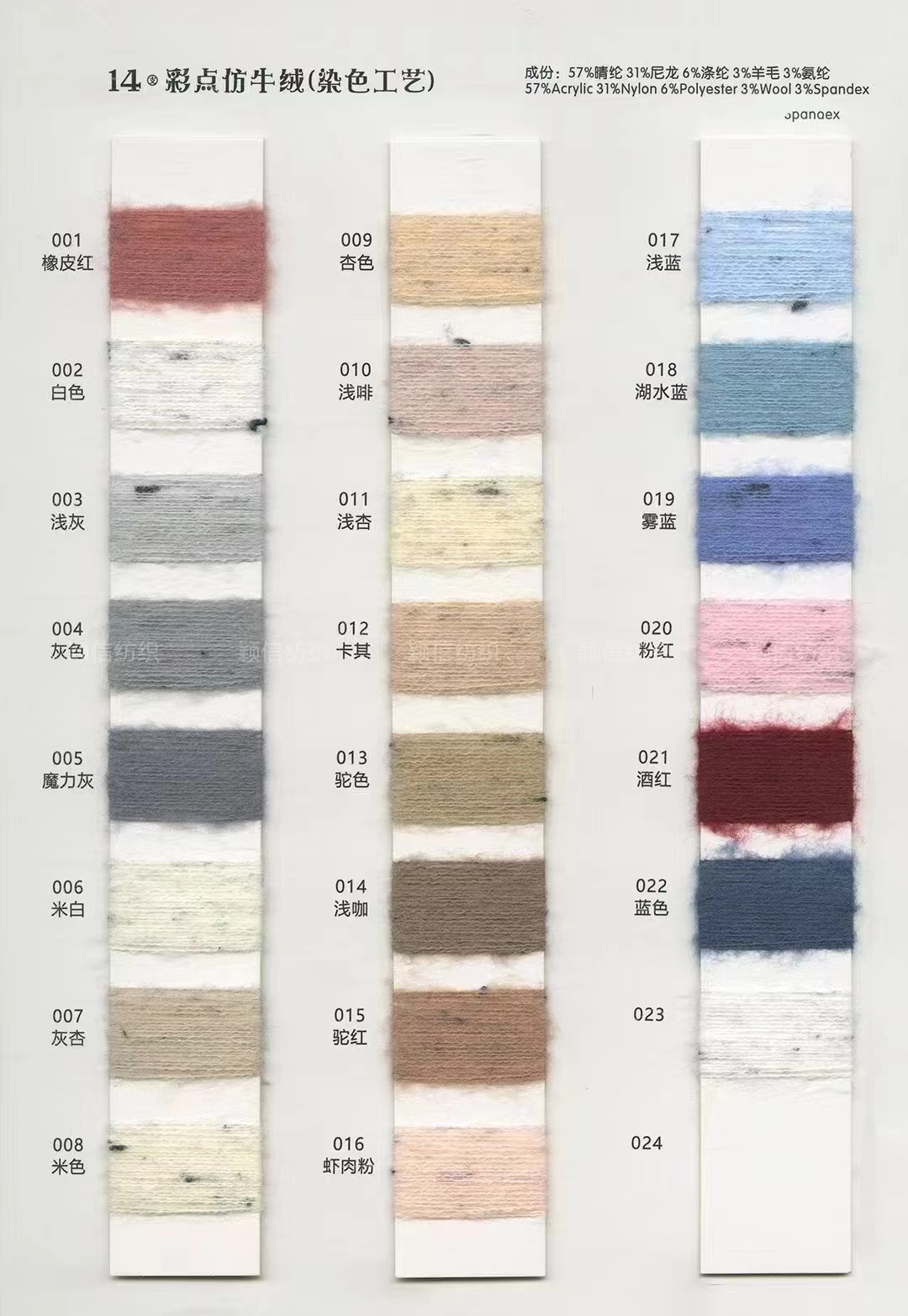 珠片纱系列 彩点纱系列 磨毛绒系列 环保再生系列 抗菌系列 马海毛系列 圈圈纱系列 渐变纱系列 段染系列 羊毛混纺系列 春夏特种纱系列 等各类新型花式纱