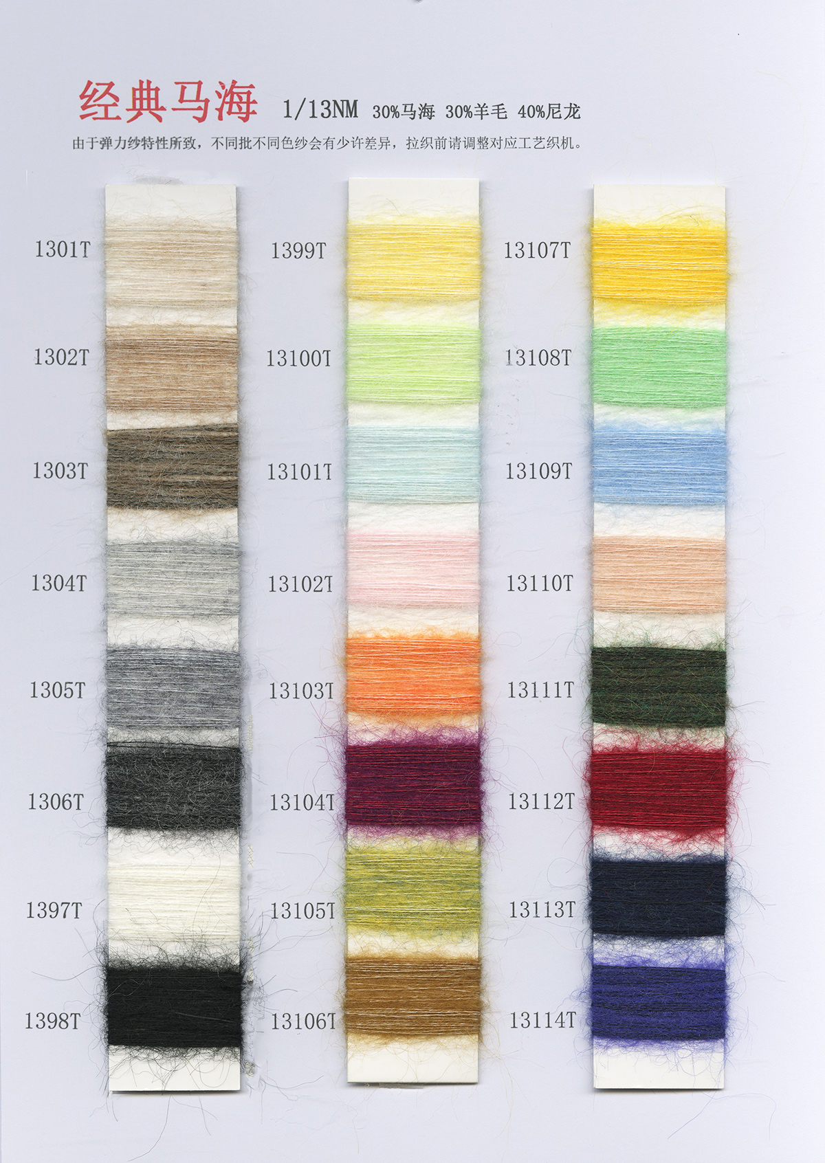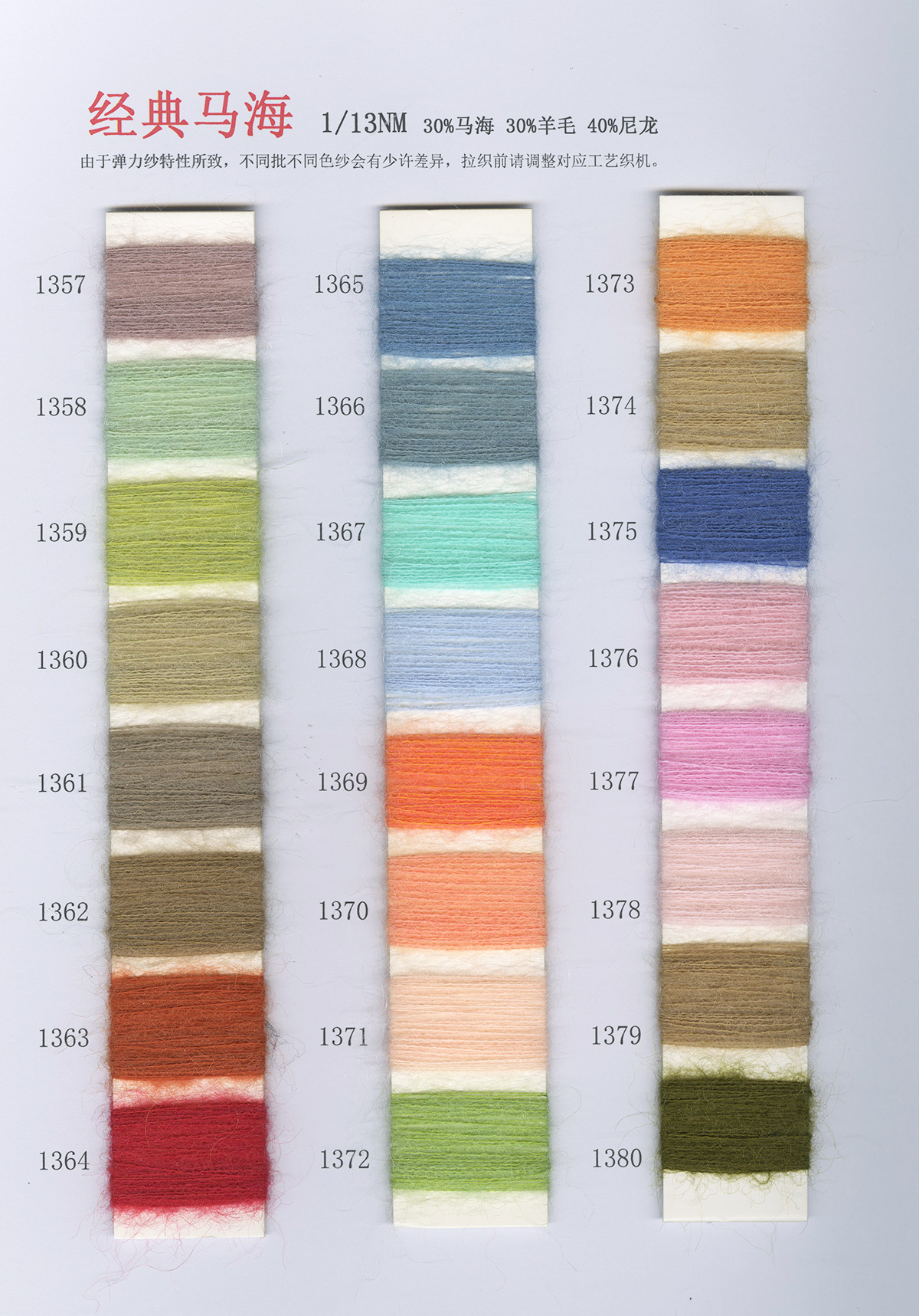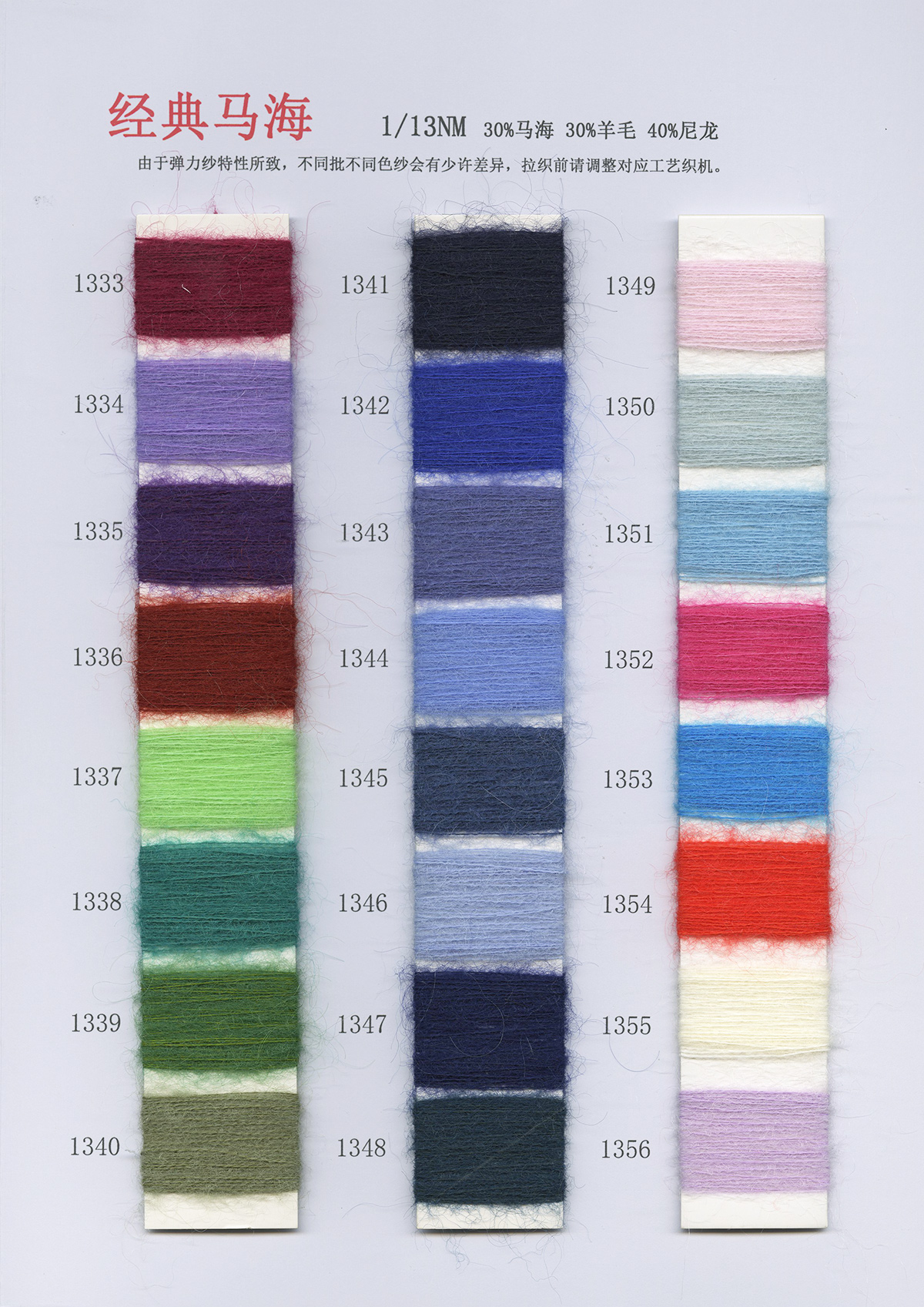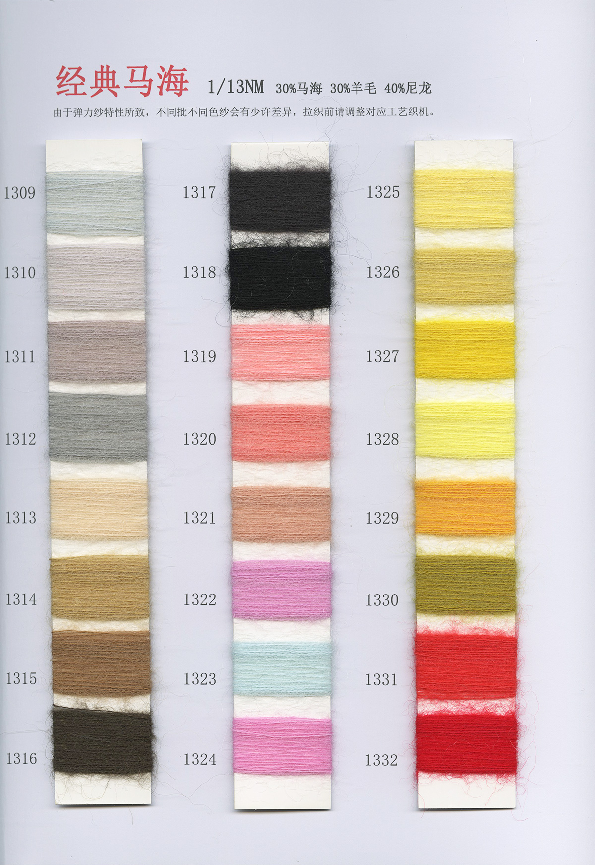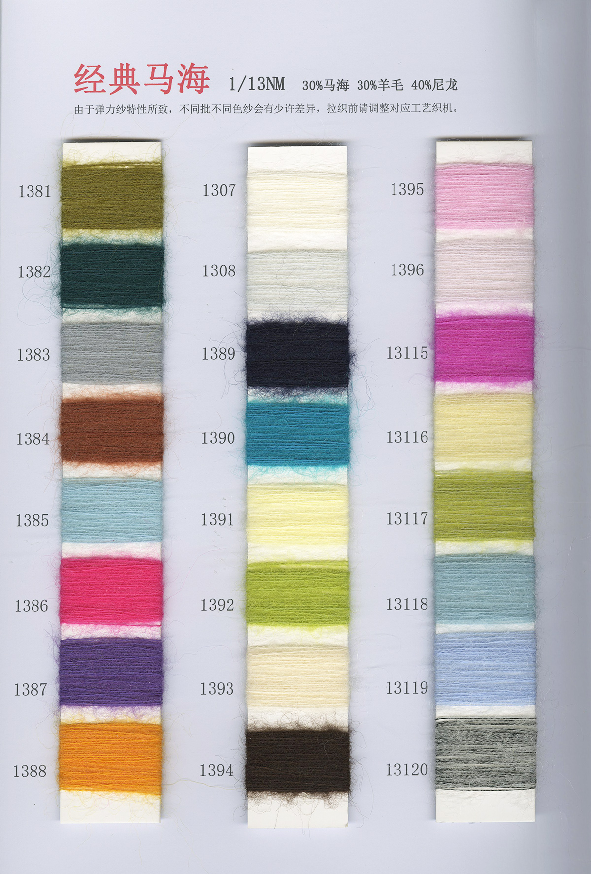 6/1维丝可喷毛绒、14/1雅克牛绒、5.5/1雪花骆马绒、3.5/1绚丽喷毛绒、8/1羊驼喷毛绒、5.5/1骆马喷毛绒、3.5/1亮彩喷毛绒、15/1迷你羊驼圈圈、14/1纤柔马海圈圈、7.5支马海圈圈纱、13/1羊毛长毛、9.8支骆马长毛、5.5支羊驼长毛、14/1华咔约马海、12/1北美浣熊绒、9/1阿拉善骆驼绒、14/2芙尔丽绒、6/2新丝丽绒、2/16南非再生驼绒