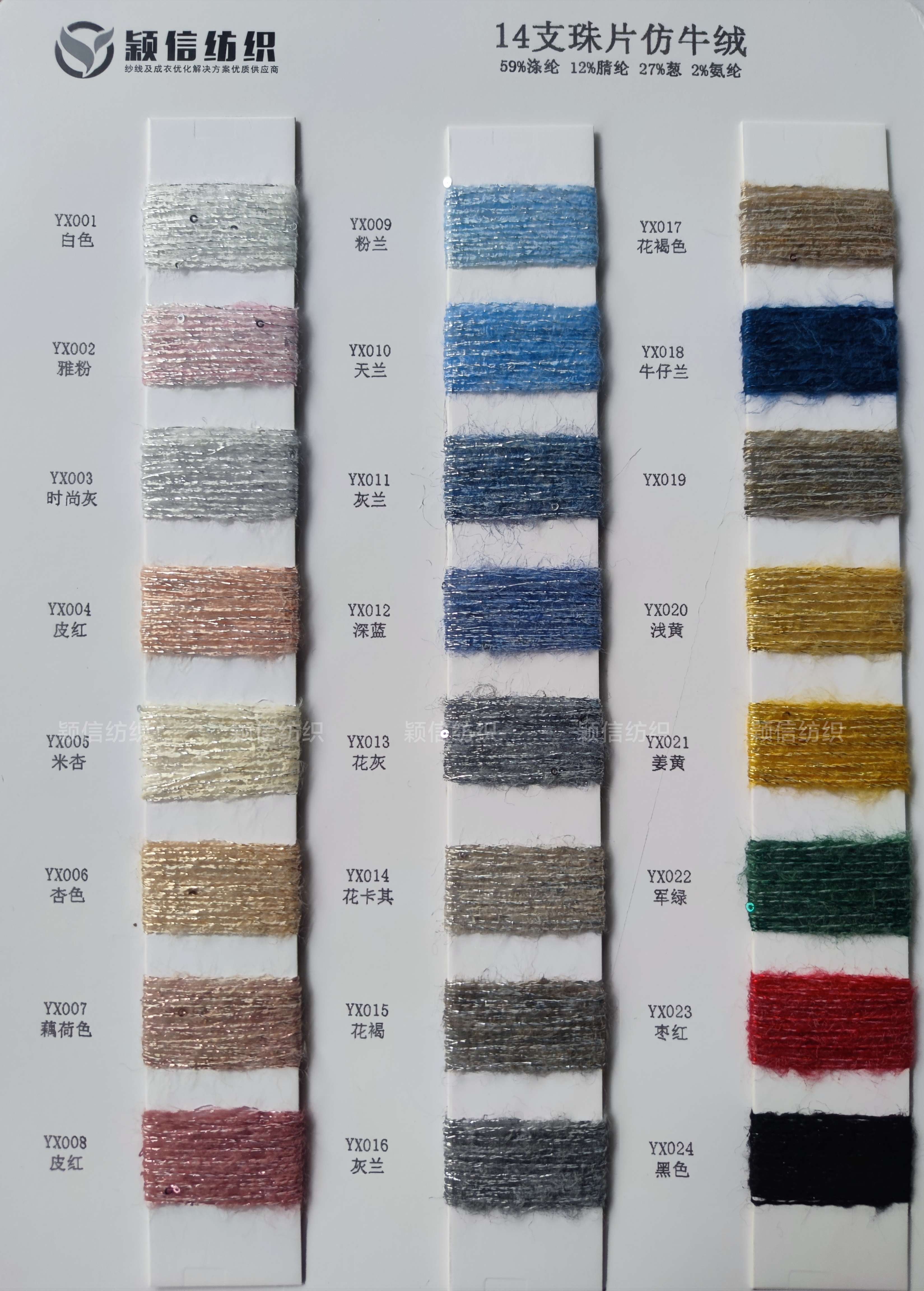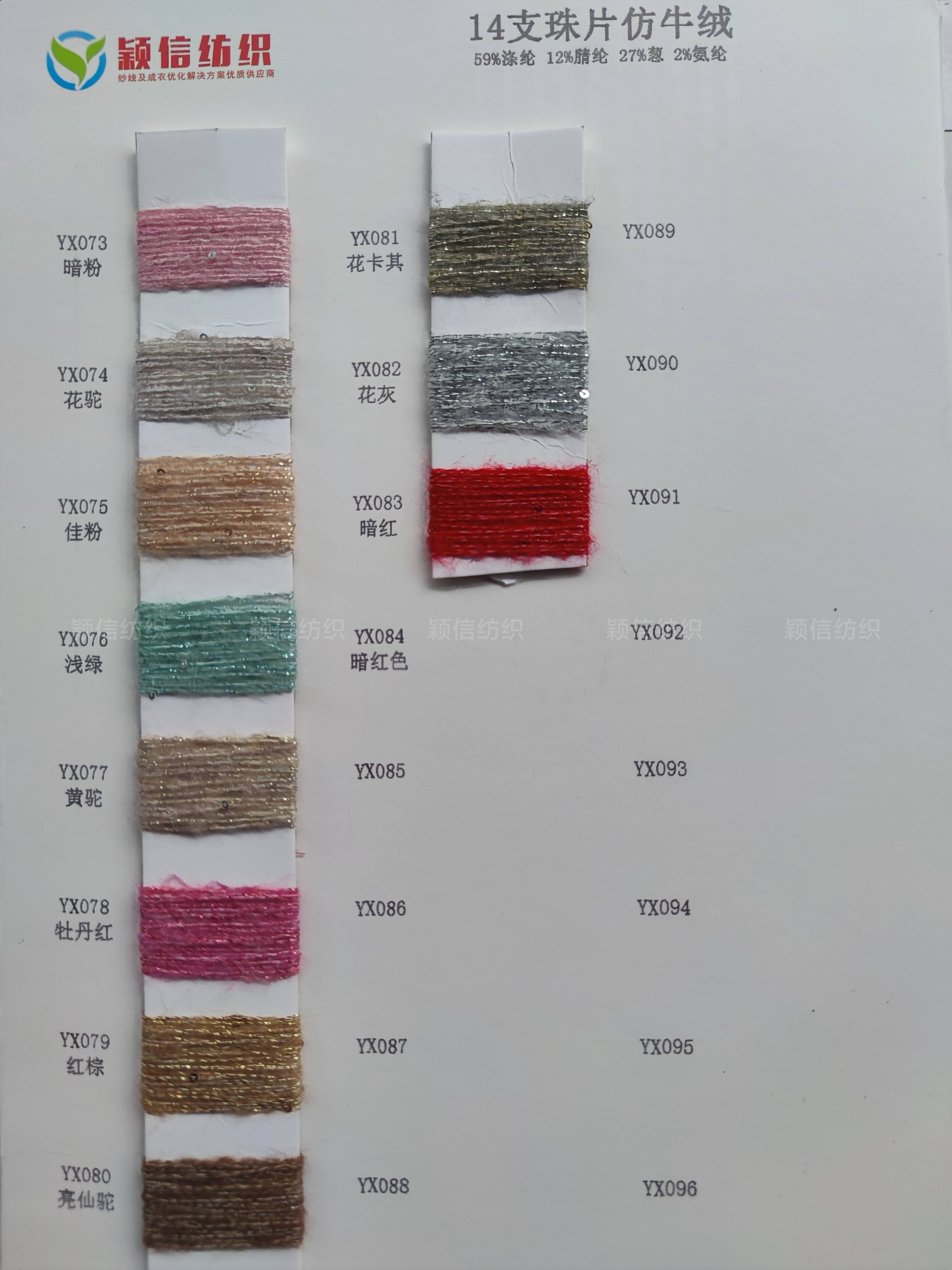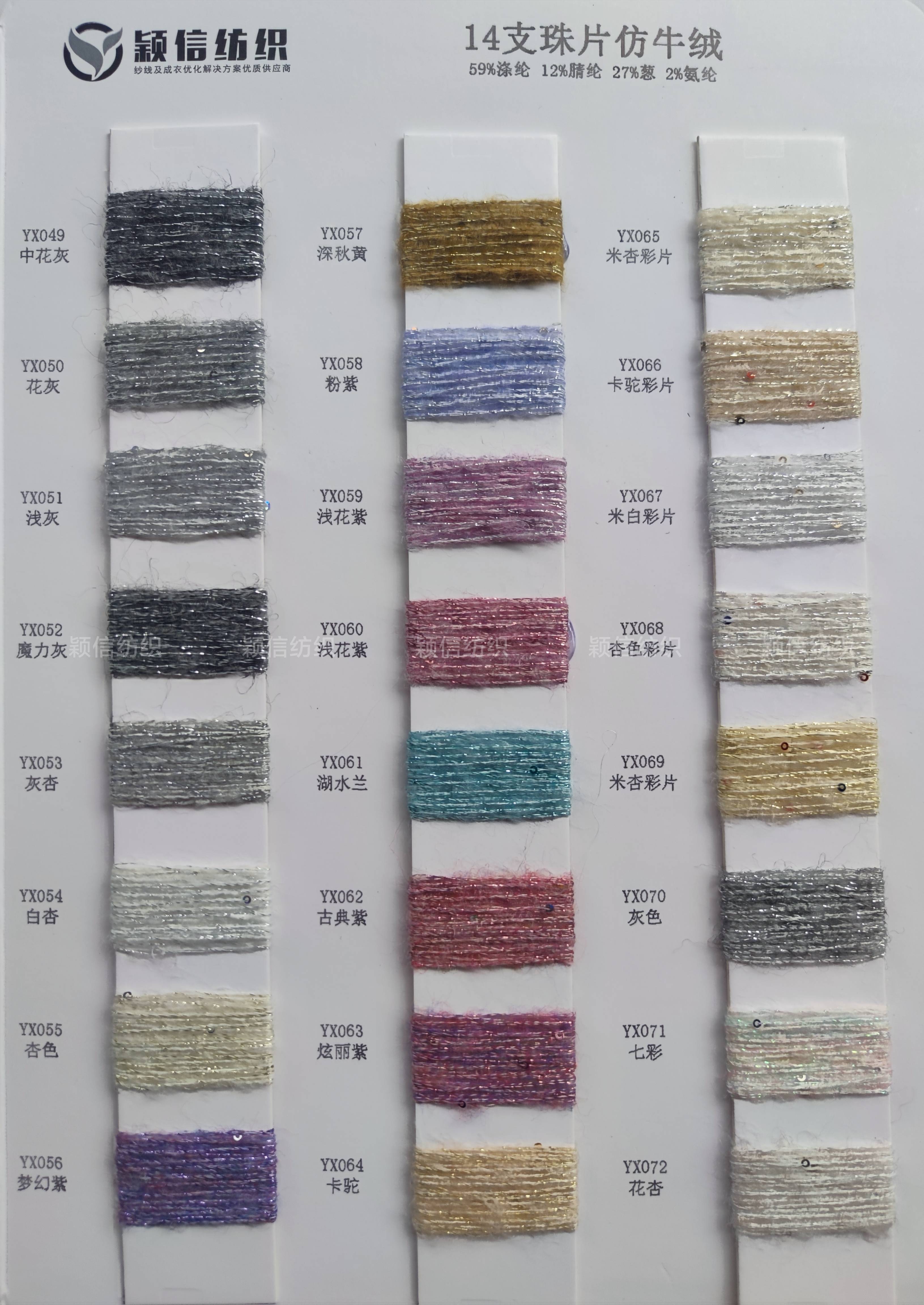 珠片纱系列 彩点纱系列 磨毛绒系列 环保再生系列 抗菌系列 马海毛系列 圈圈纱系列 渐变纱系列 段染系列 羊毛混纺系列 春夏特种纱系列 等各类新型花式纱