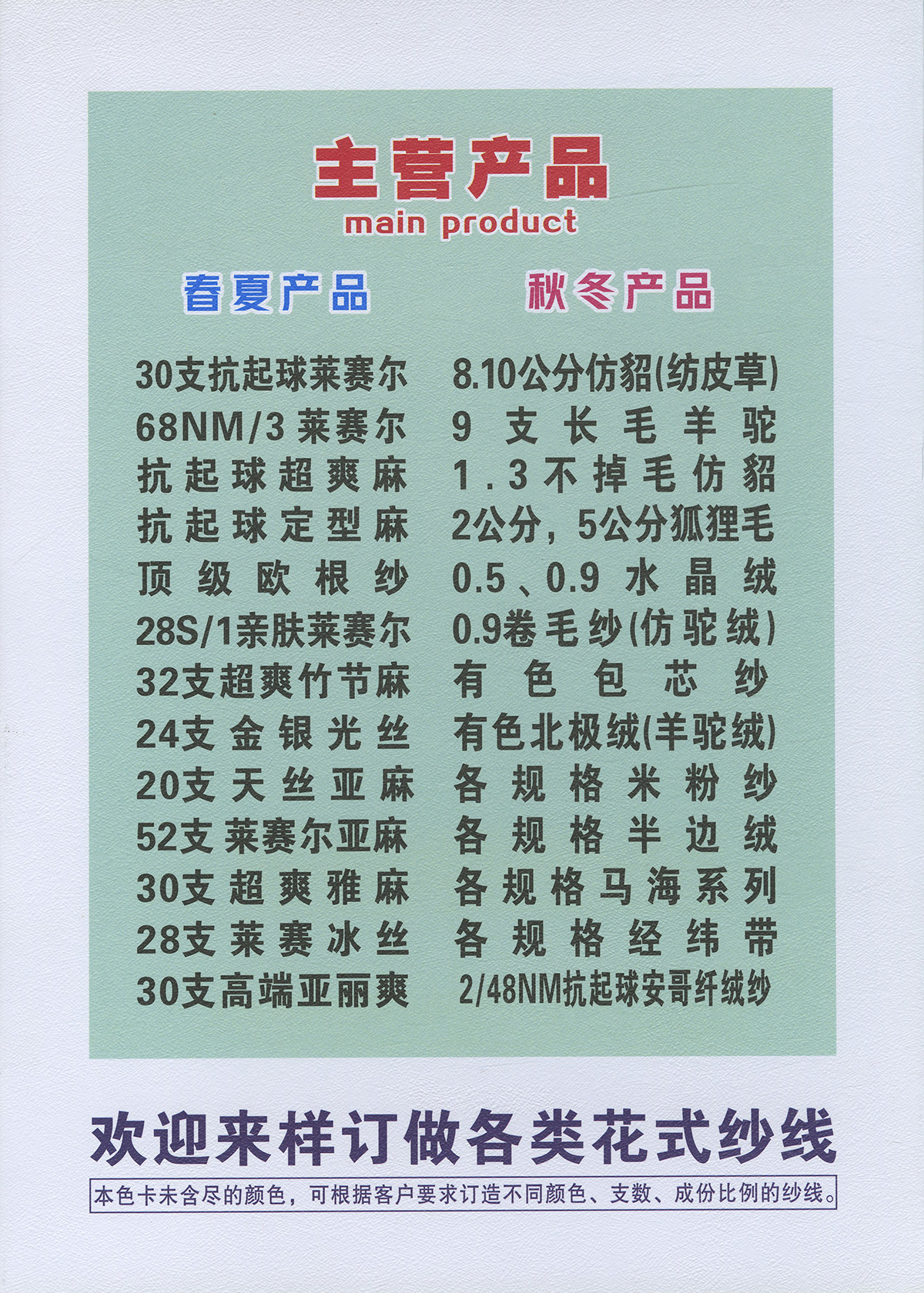 春夏系列 28S/1亲肤莱赛尔·30支抗起球莱赛尔·抗起球超爽麻·抗起球定型麻顶级欧根纱·68NM/3莱赛尔天丝·32支超爽竹节麻·24支金银光丝20支天丝亚麻·52支莱赛尔亚麻·30支超爽雅麻·28支莱赛冰丝 秋冬系列 8.10公分仿貂(纺皮草)·9支长毛羊驼·0.7、1.3、2.0仿绍·0.5、0.9、1.3水晶绒0.9卷毛纱(仿驼绒)·有色高弹包芯纱· 有色兔绒包芯纱·有色北极绒(羊驼绒)