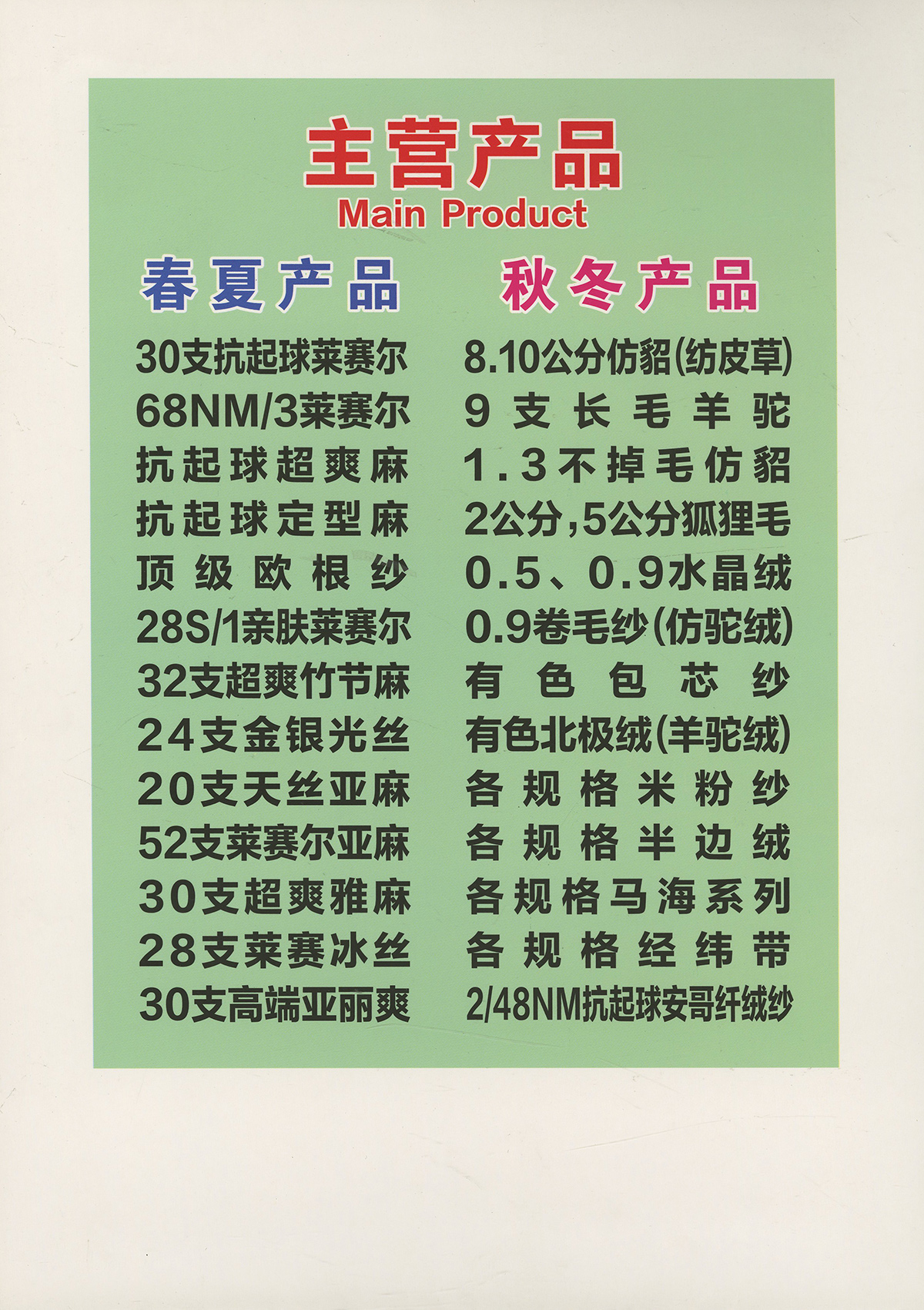 春夏系列 28S/1亲肤莱赛尔·30支抗起球莱赛尔·抗起球超爽麻·抗起球定型麻顶级欧根纱·68NM/3莱赛尔天丝·32支超爽竹节麻·24支金银光丝20支天丝亚麻·52支莱赛尔亚麻·30支超爽雅麻·28支莱赛冰丝 秋冬系列 8.10公分仿貂(纺皮草)·9支长毛羊驼·0.7、1.3、2.0仿绍·0.5、0.9、1.3水晶绒0.9卷毛纱(仿驼绒)·有色高弹包芯纱· 有色兔绒包芯纱·有色北极绒(羊驼绒)