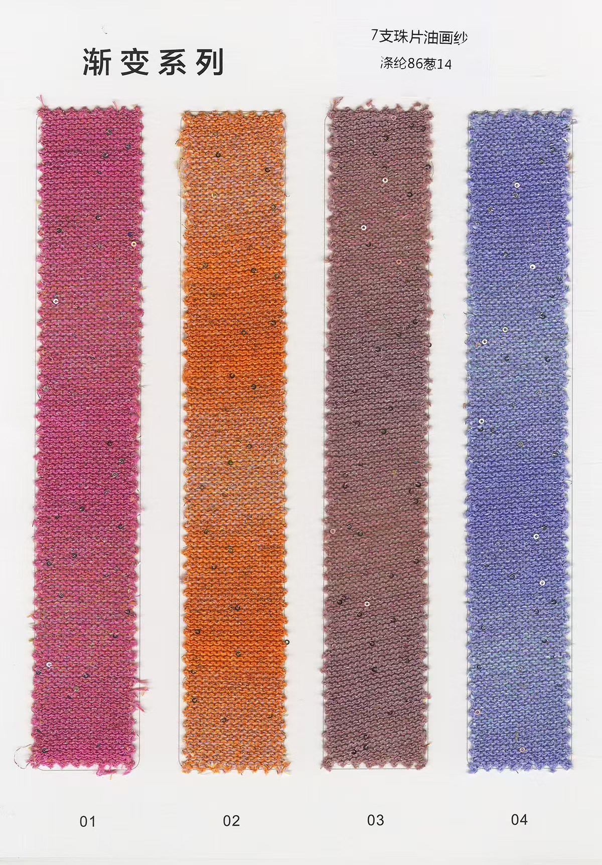 珠片纱系列 彩点纱系列 磨毛绒系列 环保再生系列 抗菌系列 马海毛系列 圈圈纱系列 渐变纱系列 段染系列 羊毛混纺系列 春夏特种纱系列 等各类新型花式纱