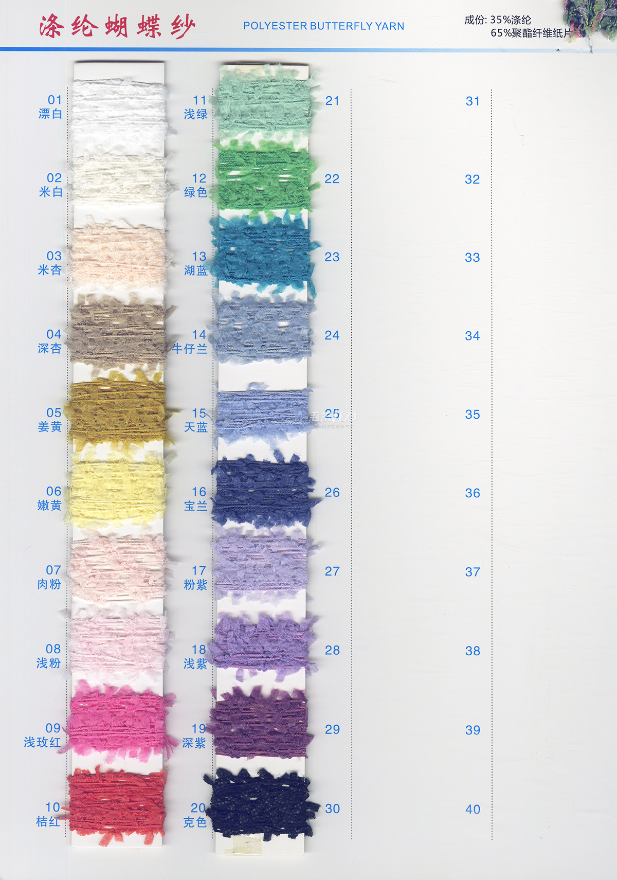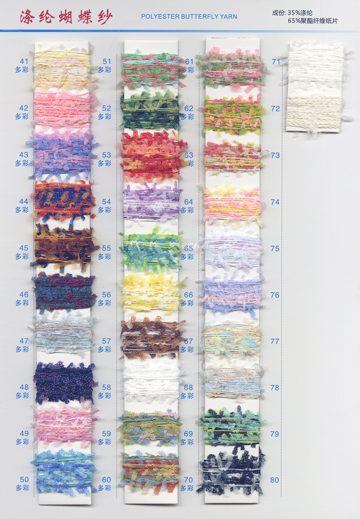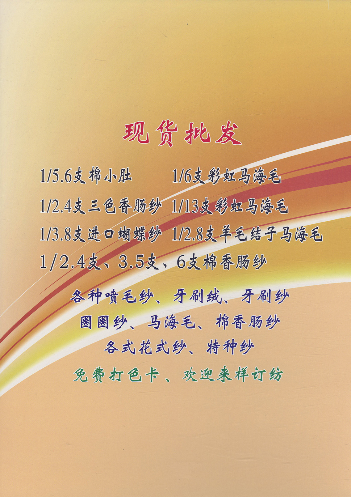 主营产品现货 彩虹系列、蝴蝶纱系列、纯棉大肚纱系列、棉香肠纱系列、涤纶香肠纱系列、 牙刷绒,有光牙刷纱,楼梯纱,灯笼纱,结子纱,菊花纱,半边绒、圈圈纱大量现货白胚 欢迎来样加工定制各种花式纱 以上产品均有中性色卡,欢迎同行力推本公司产品。