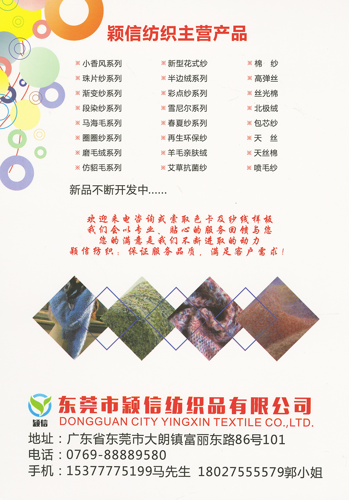 珠片纱系列 彩点纱系列 磨毛绒系列 环保再生系列 抗菌系列 马海毛系列 圈圈纱系列 渐变纱系列 段染系列 羊毛混纺系列 春夏特种纱系列 等各类新型花式纱