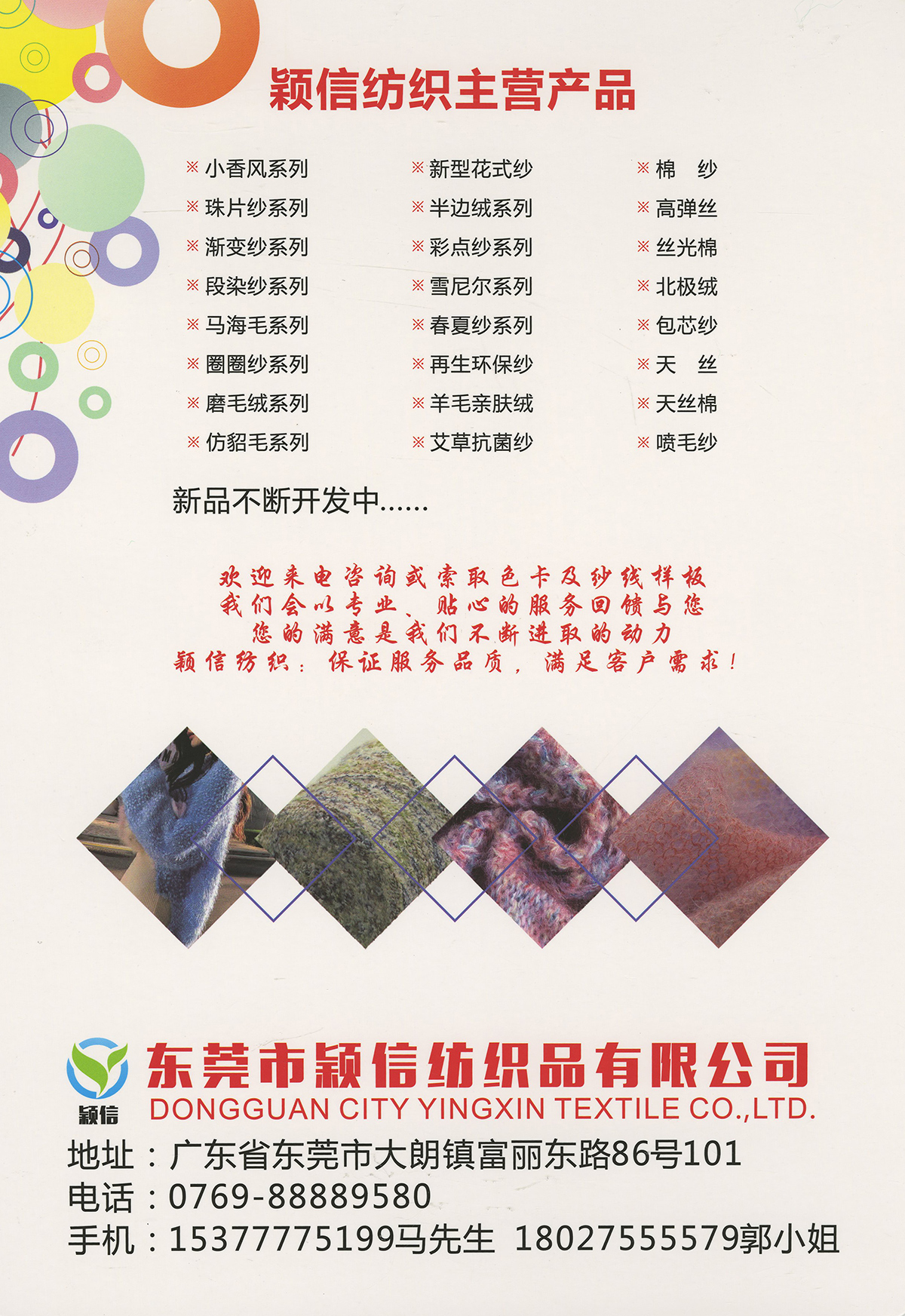 珠片纱系列 彩点纱系列 磨毛绒系列 环保再生系列 抗菌系列 马海毛系列 圈圈纱系列 渐变纱系列 段染系列 羊毛混纺系列 春夏特种纱系列 等各类新型花式纱