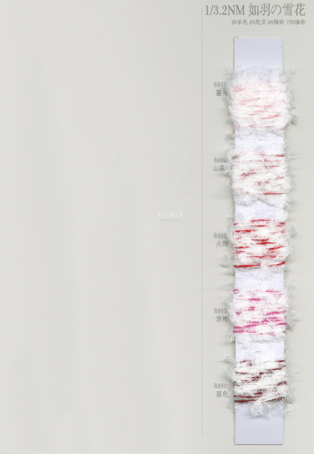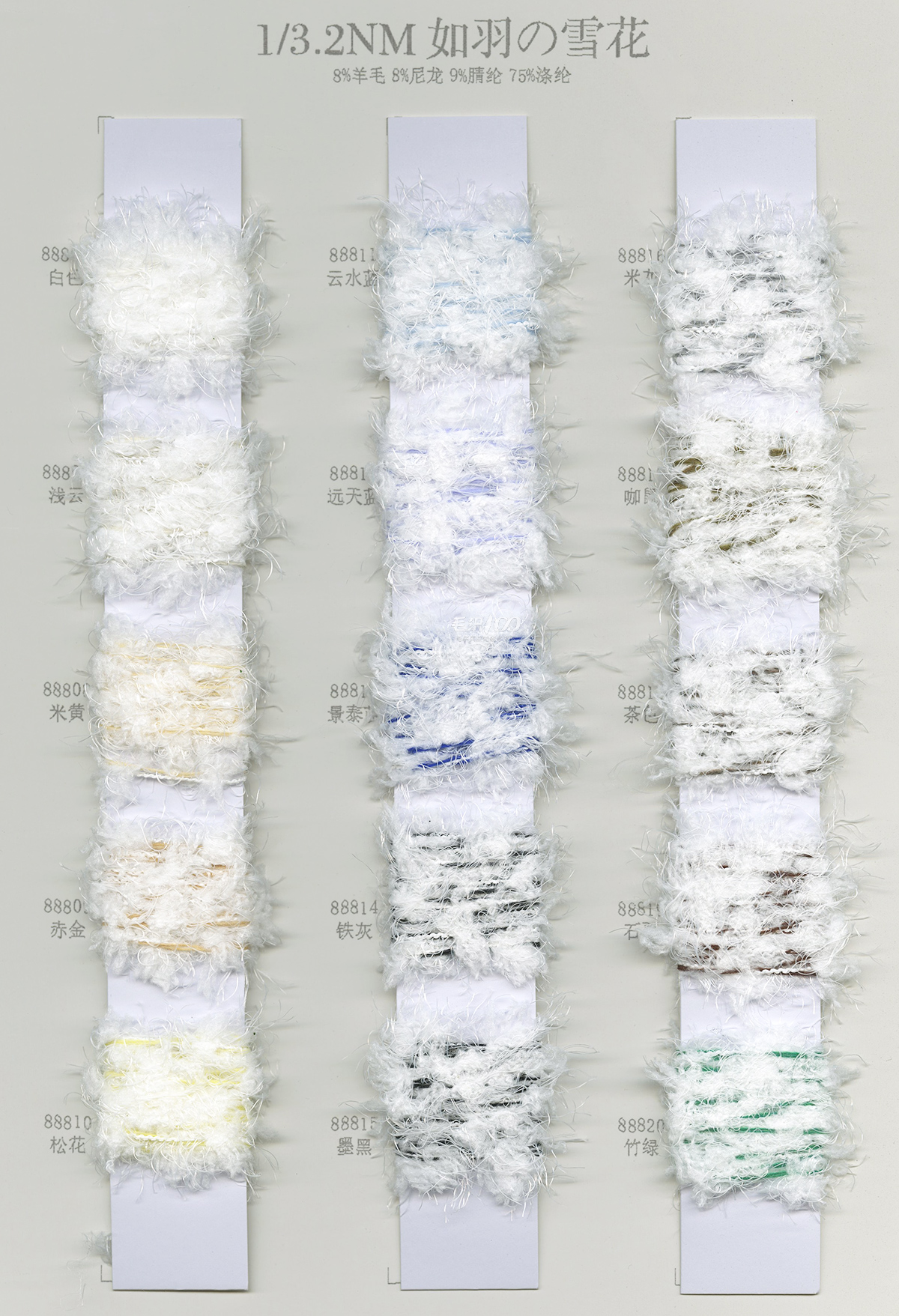 2/26NM克什米尔,2/26NM新型羊毛绒,2/30NM山羊绒混纺,1/16NM珠片纱 ,1/15NM羔羊绒混纺纱,2/13NM澳羊毛,2/28NM巴素兰羊毛混纺,1/16NM 丝光防缩羊仔毛,2/24NM狐狸绒,2/16NM 丝光防缩羊仔毛幻彩纱,2/24NM 精品澳毛绒,2