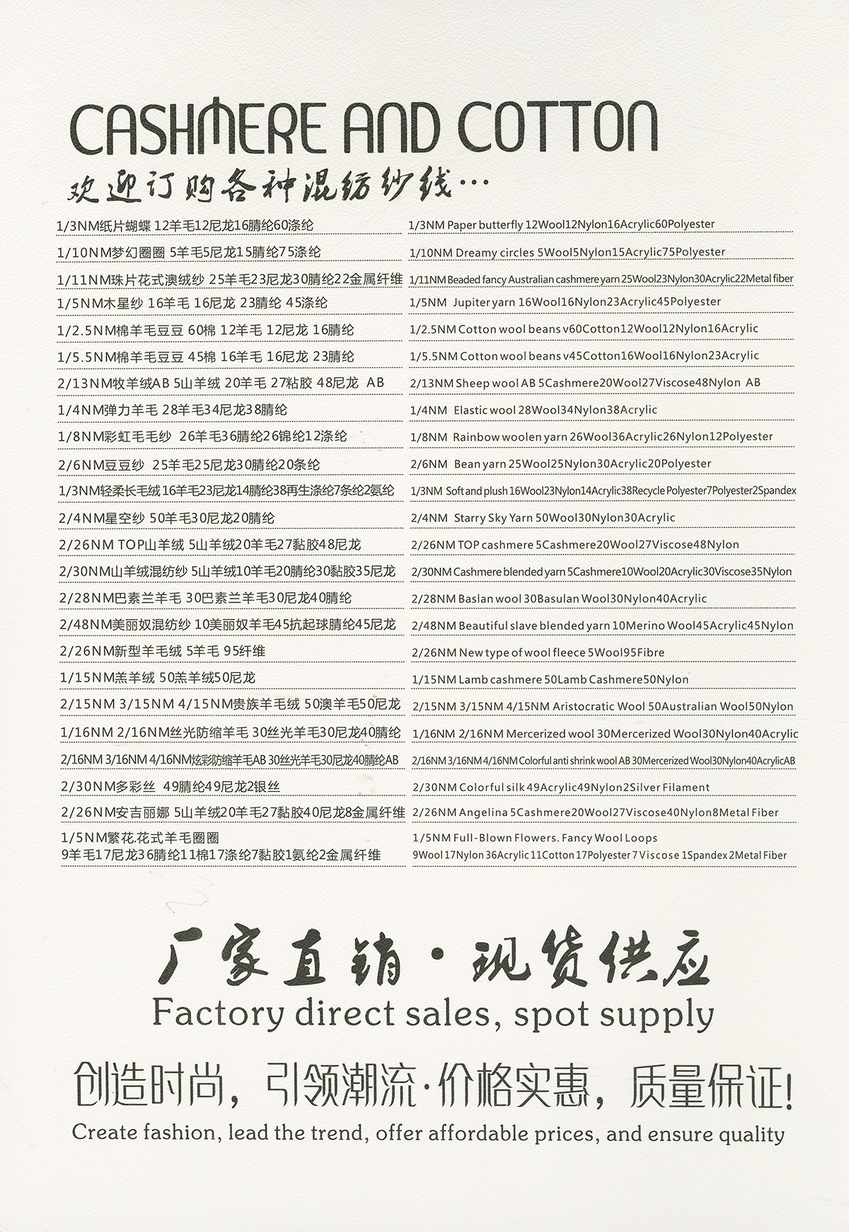 2/26NM克什米尔,2/26NM新型羊毛绒,2/30NM山羊绒混纺,1/16NM珠片纱 ,1/15NM羔羊绒混纺纱,2/13NM澳羊毛,2/28NM巴素兰羊毛混纺,1/16NM 丝光防缩羊仔毛,2/24NM狐狸绒,2/16NM 丝光防缩羊仔毛幻彩纱,2/24NM 精品澳毛绒,2