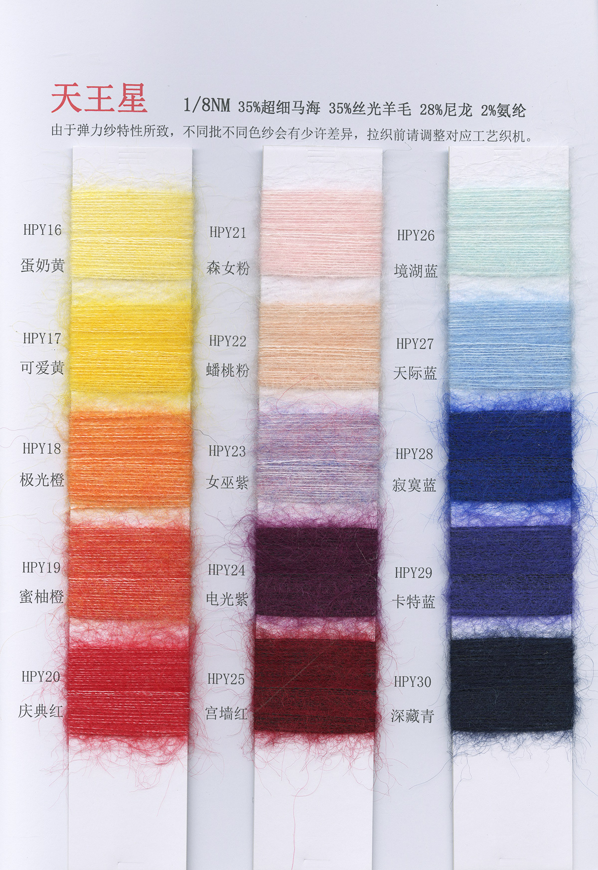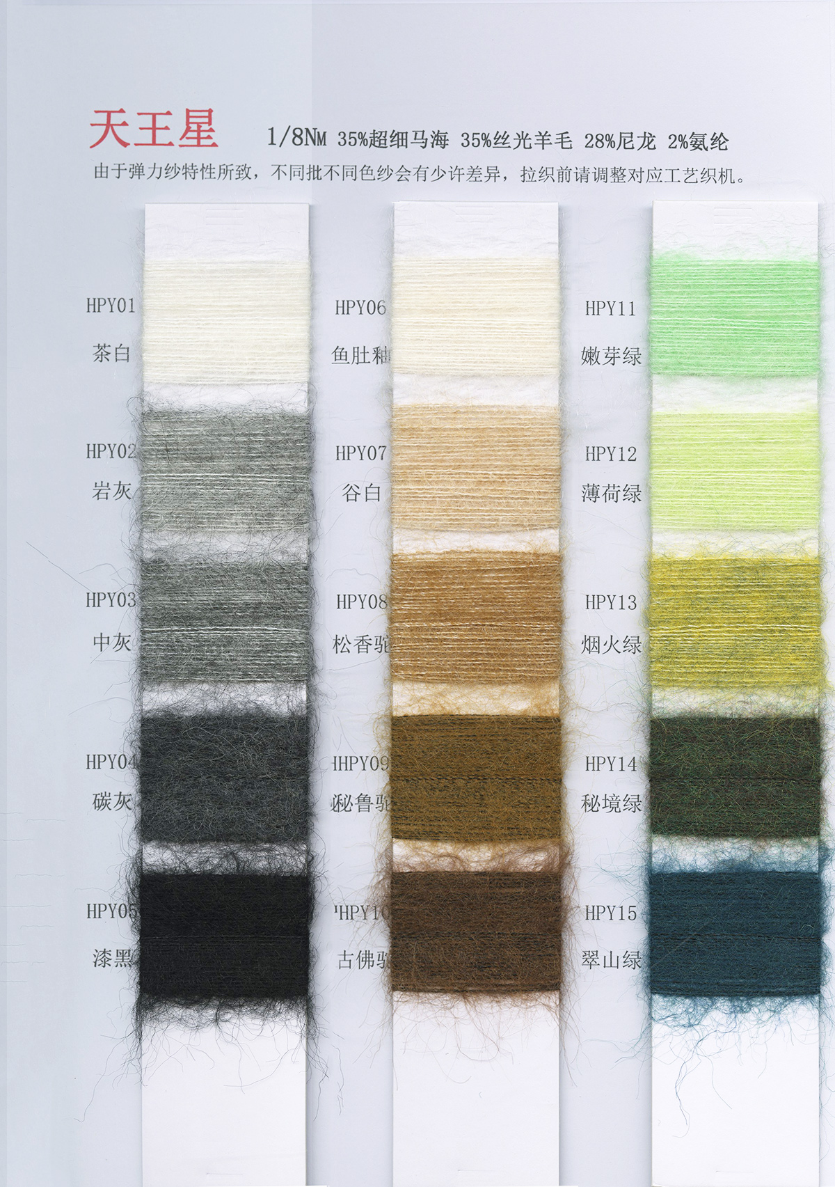 6/1维丝可喷毛绒、14/1雅克牛绒、5.5/1雪花骆马绒、3.5/1绚丽喷毛绒、8/1羊驼喷毛绒、5.5/1骆马喷毛绒、3.5/1亮彩喷毛绒、15/1迷你羊驼圈圈、14/1纤柔马海圈圈、7.5支马海圈圈纱、13/1羊毛长毛、9.8支骆马长毛、5.5支羊驼长毛、14/1华咔约马海、12/1北美浣熊绒、9/1阿拉善骆驼绒、14/2芙尔丽绒、6/2新丝丽绒、2/16南非再生驼绒