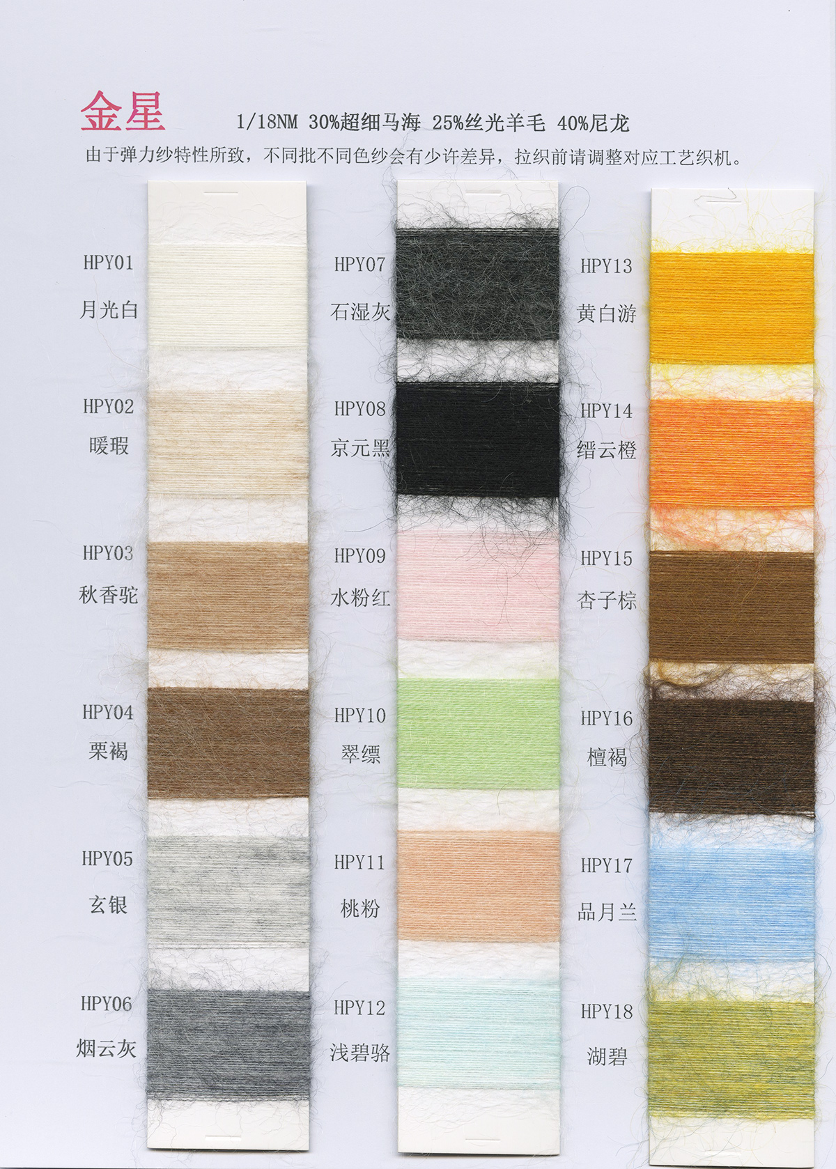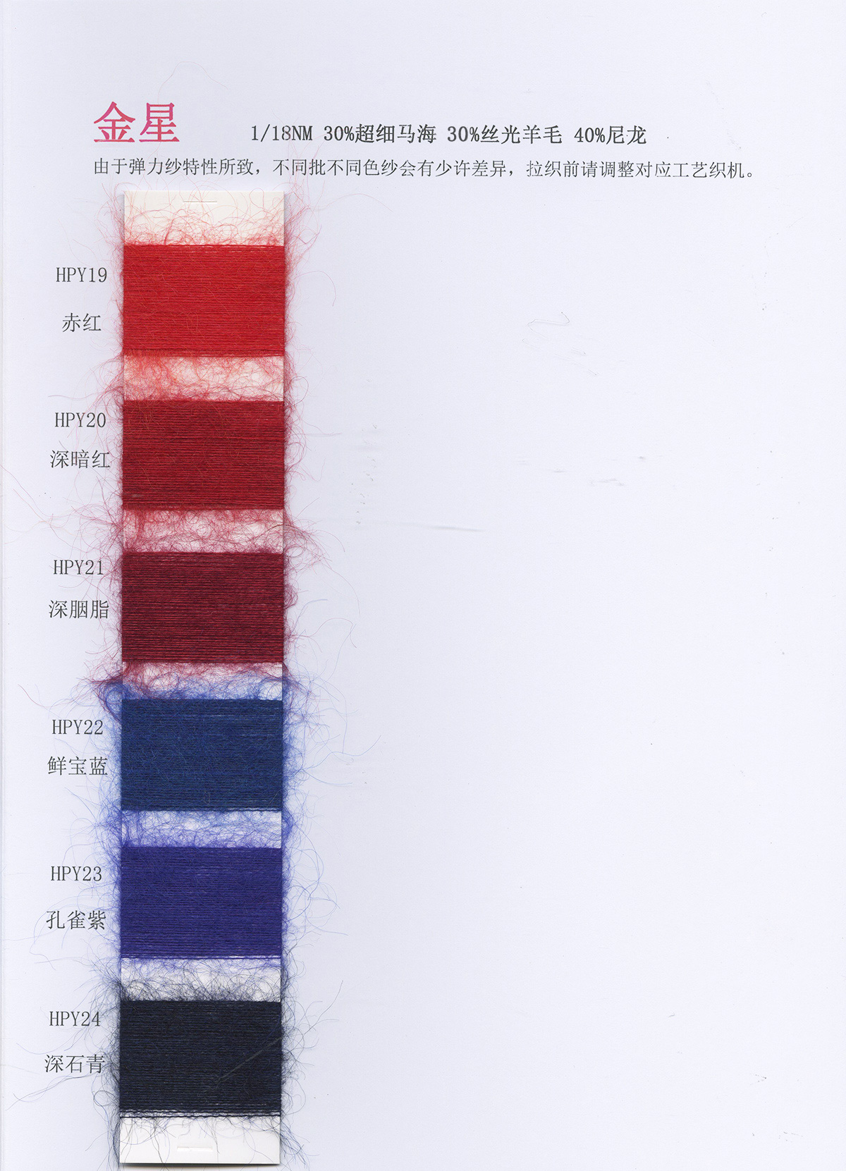 6/1维丝可喷毛绒、14/1雅克牛绒、5.5/1雪花骆马绒、3.5/1绚丽喷毛绒、8/1羊驼喷毛绒、5.5/1骆马喷毛绒、3.5/1亮彩喷毛绒、15/1迷你羊驼圈圈、14/1纤柔马海圈圈、7.5支马海圈圈纱、13/1羊毛长毛、9.8支骆马长毛、5.5支羊驼长毛、14/1华咔约马海、12/1北美浣熊绒、9/1阿拉善骆驼绒、14/2芙尔丽绒、6/2新丝丽绒、2/16南非再生驼绒