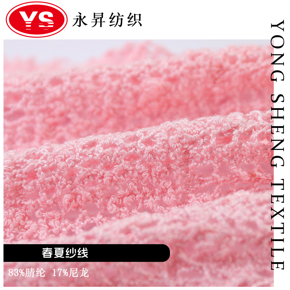 品名:春夏纱线成分:83%腈纶 17%尼龙支数:介绍:欢迎来到我们的春夏纱线世界,一款专为温暖季节设计的高品质纱线。我们的纱线采用83%腈纶和17%尼龙的完美比例,既保证了柔软舒适的触感,又增加了耐用性和弹性,使其成为理想的编织选择。无论是制作轻盈的夏季衣物,还是温馨的家居饰品,春夏纱线都能满足您的需求。它不仅易于编织,而且色彩鲜艳持久,让您的作品在阳光下更加耀眼。让我们一起迎接温暖的季节,用春夏纱线编织出属于自己的独特风格吧!
